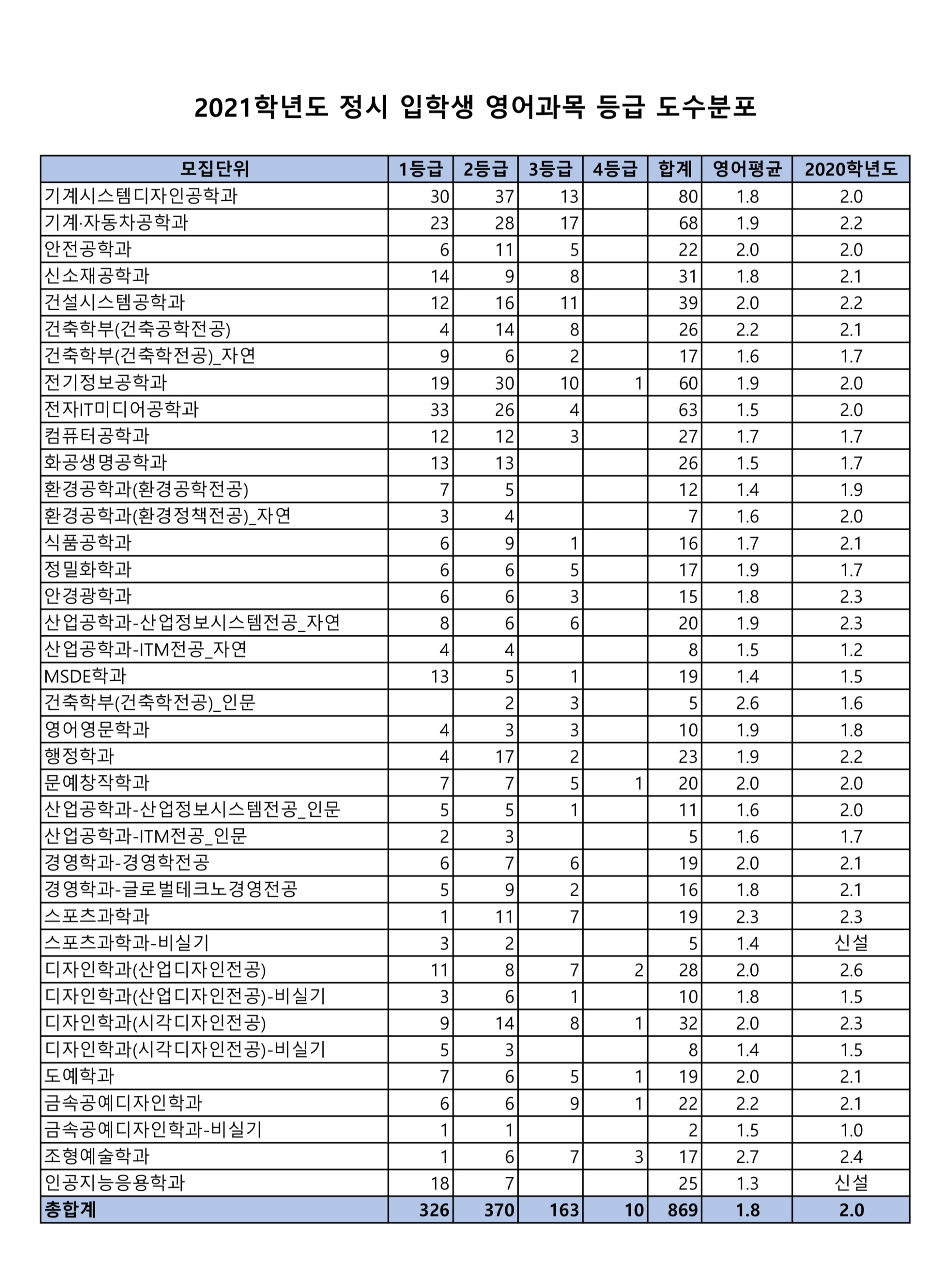 2021학년도 서울과학기술대학교 정시 영어등급 구분 모집단위 모집