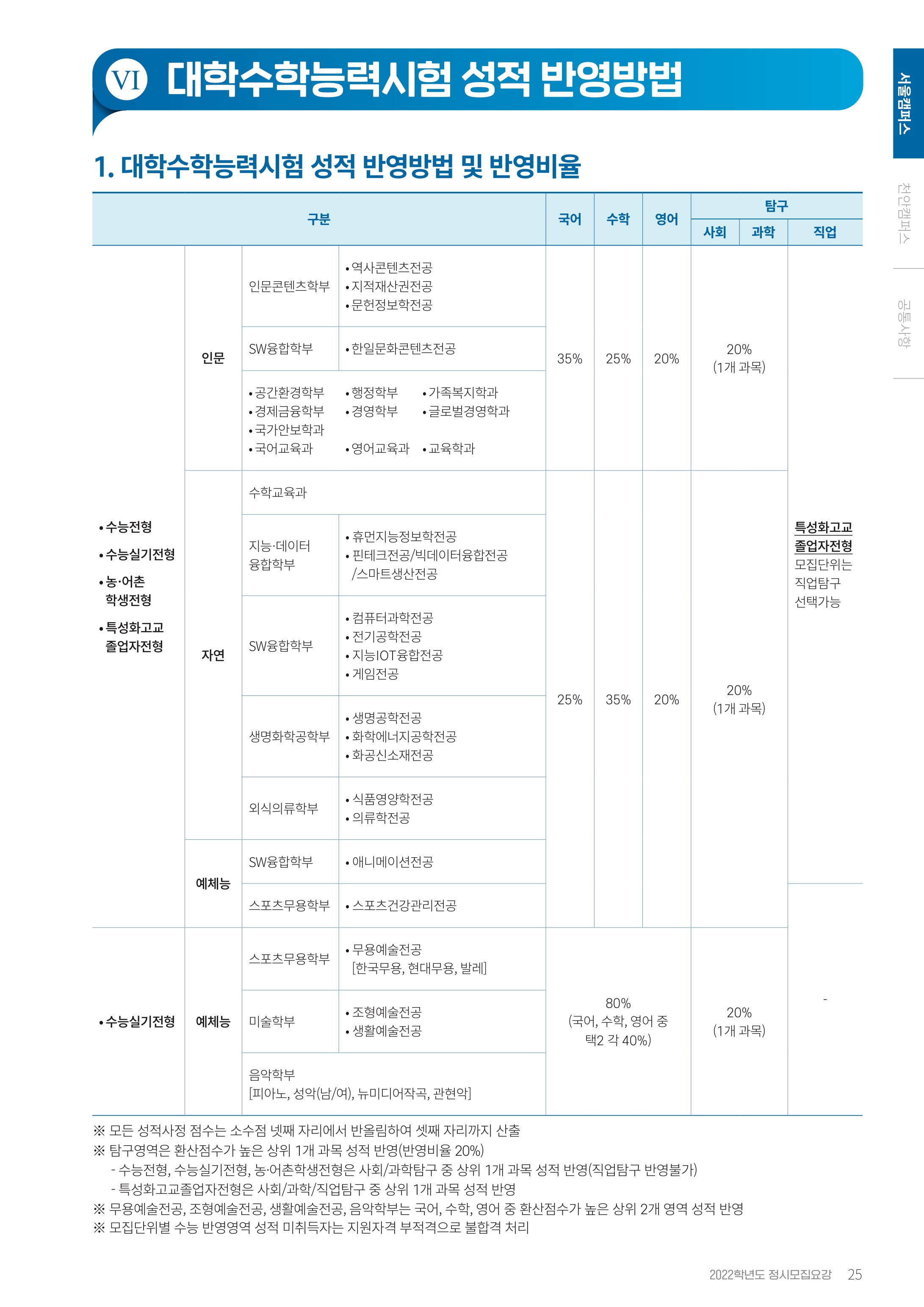 국어 25%, 수학 35%, 영어 20%, 탐구 20%성적 반영방법 및 반영비율