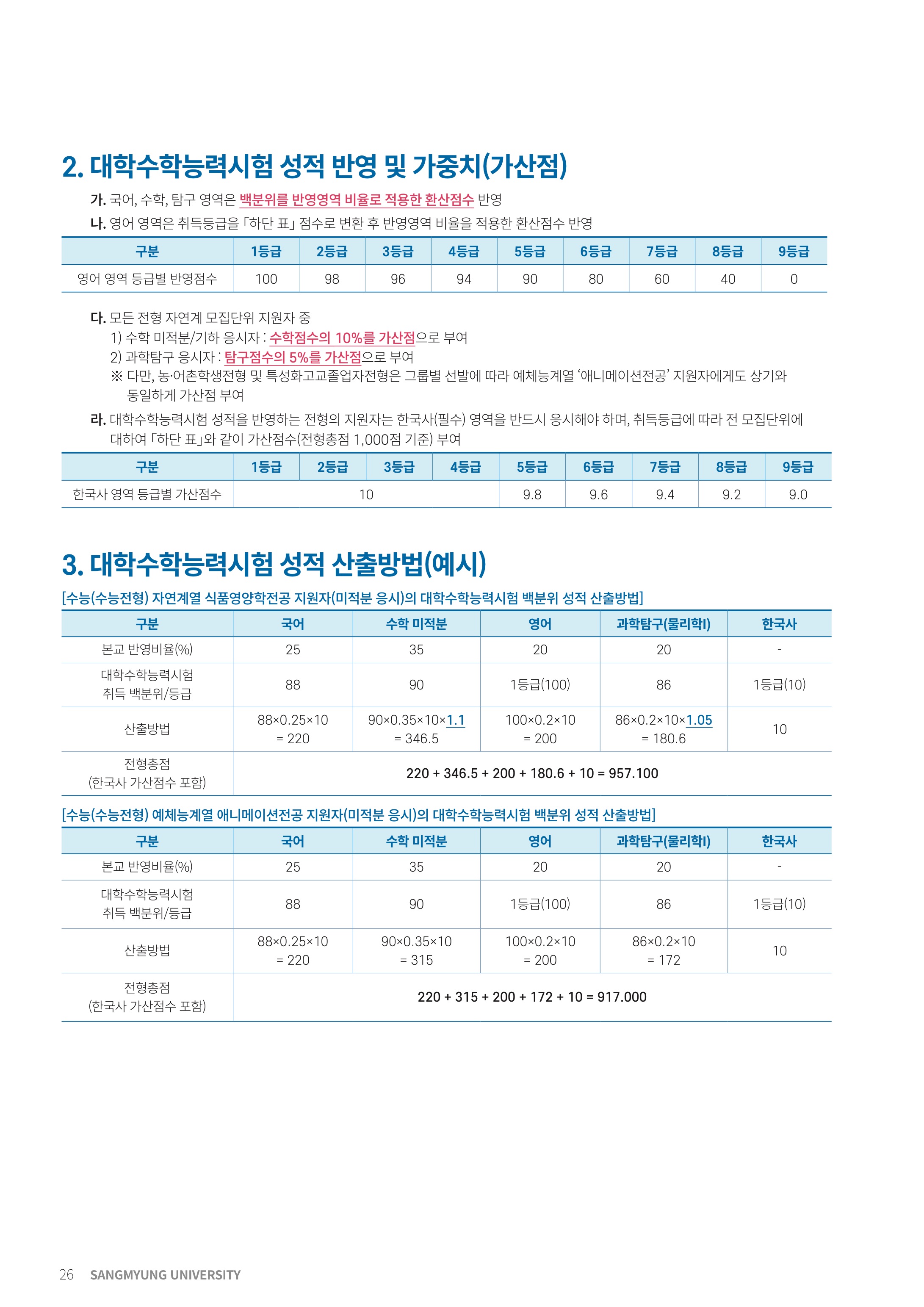 2022학년도 상명대학교 대학수학능력시험 반영방법 2022학년도 상명대학교 정시등급