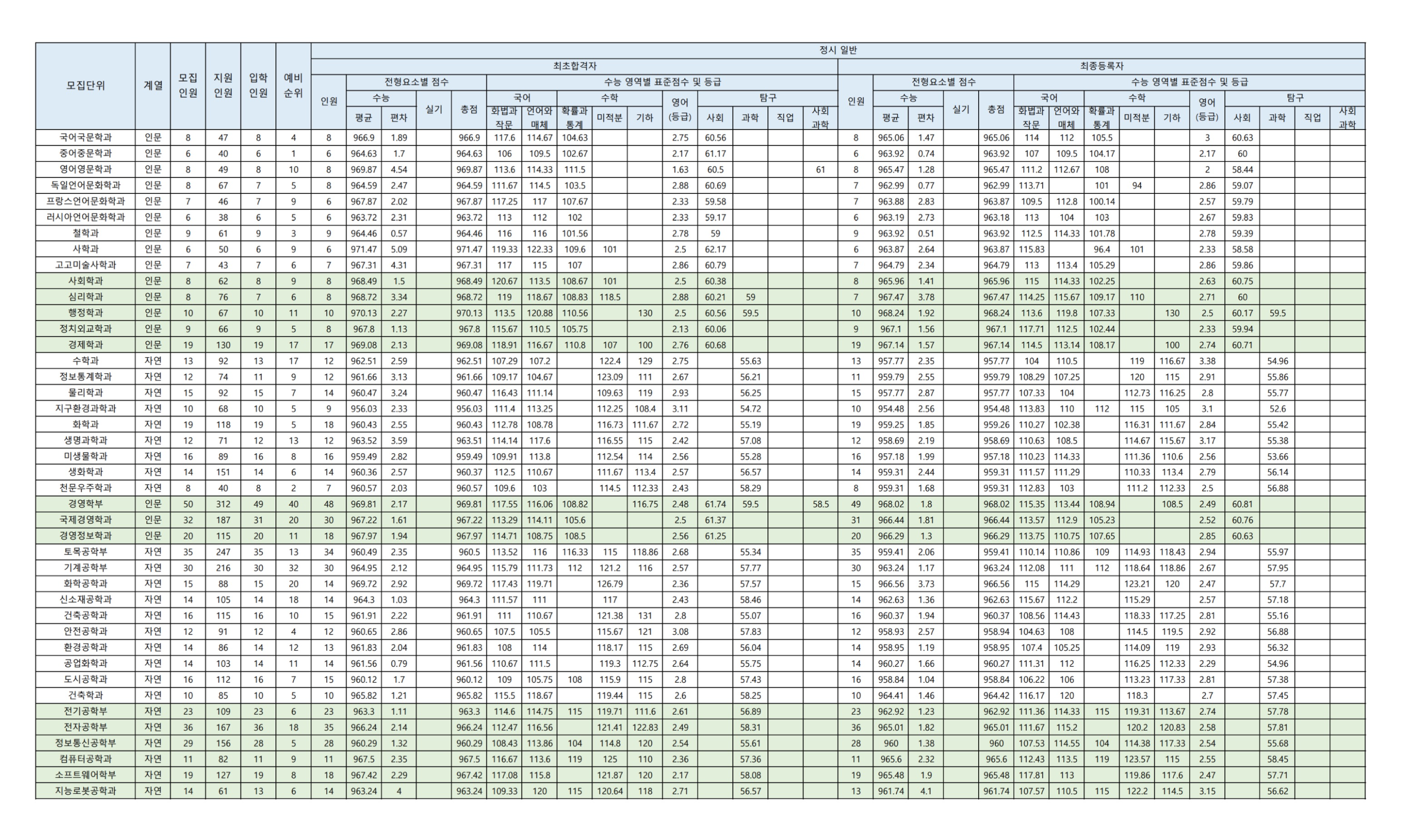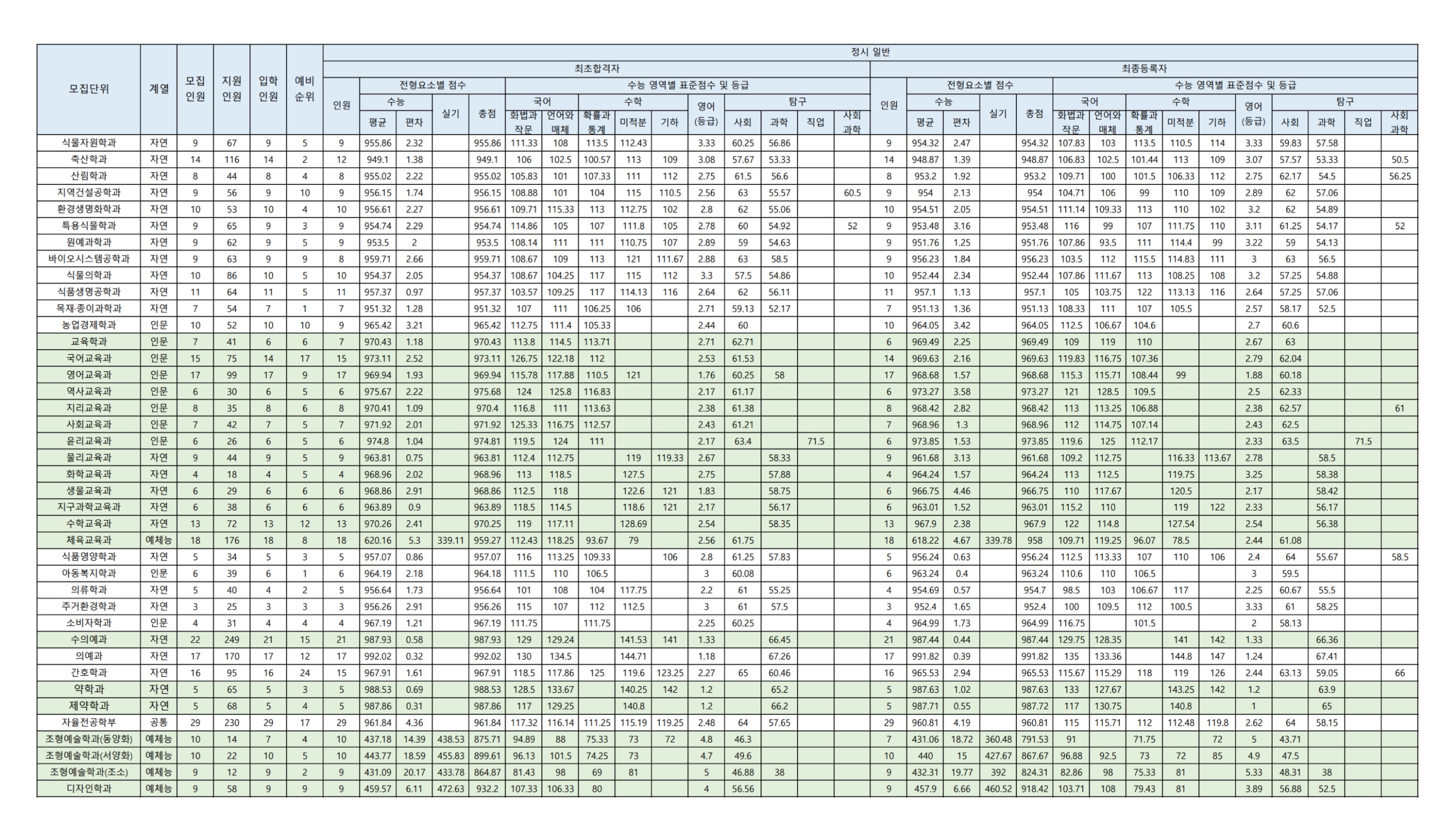 (수능)국어 수학 탐구 평균 가군 국어국문학과 12 3.9 17 973.4X 1000 74 58 76 75 중어중문학과 9 4.7 8 973.0X 1000 70 72 75 74.5 영어영문학과 8 4.5 9 973.6X 1000 67 69 78.5 76 독일언어문화학과 10 5 13 971.7X 1000 63 65 77 74 프랑스언어문화학과 8 4.6 5 973.4X 1000 67 68 82.5 75 러시아언어문화학과 6 3.8 4 967.8X 1000 68 72 58 67.3 철학과 9 4.8 13 972.5X 1000 57 64 79.5 74.8 사학과 8 7.3 16 973.2X 1000 68 62 74.5 74.3 고고미술사학과 6 6 3 973.4X 1000 65 64 77 72 수학과 19 2.6 30 950.7X 1000 41 45 53.5 53.8 정보통계학과 14 2.9 14 966.1X 1000 70 55 69.5 68 물리학과 27 2.4 20 954.5X 1000 49 42 59.5 58.8 화학과 11 4 31 952.5X 1000 51 46 64.5 58.8 생물학과 20 2.9 32 951.0X 1000 57 45 58.5 58.5 미생물학과 20 4.1 5 962.2X 1000 63 51 71.5 66.5 생화학과 17 3.1 18 961.4X 1000 70 45 71 68.8 천문우주학과 15 2.9 12 959.7X 1000 41 45 64 62.8 지구환경과학과 14 3.4 13 960.2X 1000 61 51 61.5 62.5 경영학부 47 4.5 67 976.6X 1000 67 78 81.5 79 국제경영학과 24 4.2 30 974.7X 1000 63 68 78 76.3 경영정보학과 14 3.5 15 973.2X 1000 72 70 71.5 74 전기공학부 21 3.2 17 964.4X 1000 68 58 69 69 전자공학부 47 3.3 36 967.8X 1000 72 61 72.5 73.3 정보통신공학부 49 3.1 56 964.2X 1000 67 49 68.5 67.8 컴퓨터공학과 17 4.9 19 967.1X 1000 63 55 70 69.8 소프트웨어학과 35 3.1 30 965.0X 1000 67 55 69 69.3 지능로봇공학과 15 3.9 14 965.8X 1000 65 65 64.5 68 식물자원학과 14 2.9 14 954.8X 1000 51 48 60 59.5 축산학과 24 3.7 12 957.1X 1000 57 46 63.5 61.5 산림학과 14 2.8 11 952.9X 1000 45 53 61 61.3 지역건설공학과 9 3.8 18 958.2X 1000 55 45 60 59.8 환경생명화학과 12 3.8 19 958.5X 1000 68 46 64 63.3 특용식물학과 14 3.1 6 951.7X 1000 53 48 56 54.5 원예과학과 24 2.8 23 952.4X 1000 55 50 57 57.3 바이오시스템공학과 12 3.8 31 956.6X 1000 57 51 64 63.8 식물의학과 12 3.3 4 951.1X 1000 49 45 57 56 식품생명공학과 14 4 26 958.5X 1000 67 45 67 64.3 목재·종이과학과 12 3.5 10 959.3X 1000 55 48 70 66.3 농업경제학과 8 4.9 4 974.2X 1000 65 70 83 76.3 교육학과 9 3.8 3 974.7X 950 70 69 83 79 국어교육과 19 2.6 14 967.2X 950 70 72 74.5 75.5 영어교육과 14 3.3 14 974.8X 950 74 72 77.5 79 역사교육과 8 2.6 3 975.0X 950 68 86 91 84.8 지리교육과 10 2.7 6 975.6X 950 74 82 82.5 80 사회교육과 9 2.6 2 969.8X 950 68 69 79 75.3 윤리교육과 6 3.3 4 977.9X 950 65 70 77 78.5 물리교육과 12 2.8 0 955.3X 950 57 55 59.5 64 화학교육과 5 2.4 2 956.1X 950 53 46 72 65.3 생물교육과 10 3.4 6 966.9X 950 82 63 74 75.8 지구과학교육과 10 2.1 5 949.8X 950 63 45 66.5 60.8 수학교육과 15 3 15 960.6X 950 63 63 62.5 66.5 체육교육과 18 6.9 5 958.8X 600 74 19 81.5 65 수의예과 22 11.8 6 990.7X 1000 88 90 94.5 94 조형예술학과(동양화) 10 2.4 3 871.2X 500 20 5 32.5 26.3 조형예술학과(서양화) 9 3.9 3 887.5X 500 38 2 39.5 33 조형예술학과(조소) 10 2.6 1 900.9X 500 21 1 16.5 16.8 디자인학과 9 11.4 12 926.7X 500 49 7 52.5 49 나군 사회학과 8 5.8 20 973.1X 1000 67 75 76 75.8 심리학과 8 6.3 12 975.7X 1000 70 72 76 75.5 행정학과 8 6.3 8 976.4X 1000 67 80 78 78.8 정치외교학과 9 6.9 15 973.9X 1000 67 66 76.5 73.3 경제학과 20 6.7 38 975.4X 1000 68 68 82 78.8 토목공학부 48 3.3 47 958.9X 1000 59 49 62.5 64.5 기계공학부 33 4.9 86 963.4X 1000 63 61 68.5 68.8 화학공학과 14 3.5 22 960.1X 1000 70 51 67 64.8 신소재공학과 13 4.2 28 957.6X 1000 57 49 69.5 65.5 건축공학과 18 2.9 18 950.1X 1000 57 49 55.5 56.8 안전공학과 14 4.4 14 961.9X 1000 72 42 64.5 65.8 환경공학과 18 4.9 33 962.6X 1000 67 51 72 67.3 공업화학과 13 4.1 8 959.7X 1000 63 48 63 63.3 도시공학과 17 4.2 24 962.5X 1000 70 53 68 66.5 건축학과 14 4.1 15 963.8X 1000 61 61 69.5 70 식품영양학과 4 7 3 965.1X 1000 63 75 81.5 75 아동복지학과 6 5.8 10 970.7X 1000 63 62 71 71.3 의류학과 4 10.8 2 967.1X 1000 41 86 76 76.3 주거환경학과 4 7 4 965.7X 1000 53 80 75 74.3 소비자학과 3 9 6 971.5X 1000 51 70 71.5 69.5 의예과 19 10.7 37 994.2X 1000 97 96 93.5 95.5 간호학과 18 5.9 13 972.4X 1000 76 80 82 81.3 의예과(지역인재) 10 6.7 10 992.8X 1000 97 95 96 96.5 간호학과(지역인재) 3 6.7 0 967.2X 1000 72 49 69 71.5 자율전공학부 28 7.1 35 967.6X 1000 70 72 77.5 77.5 <용어안내>