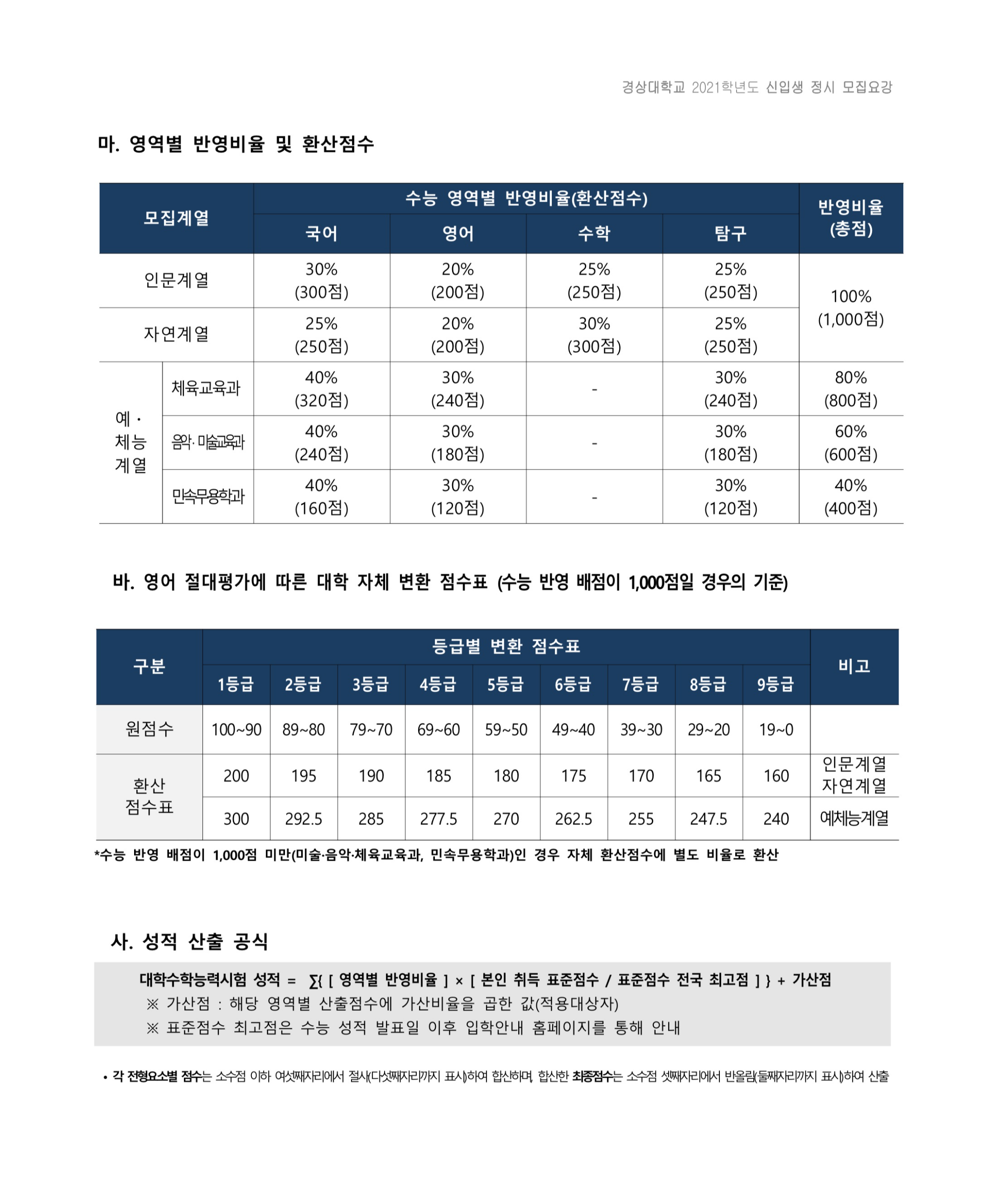 2021학년도 경상국립대학교 대학수학능력시험 반영방법 2021학년도 구 경상대학교 정시등급