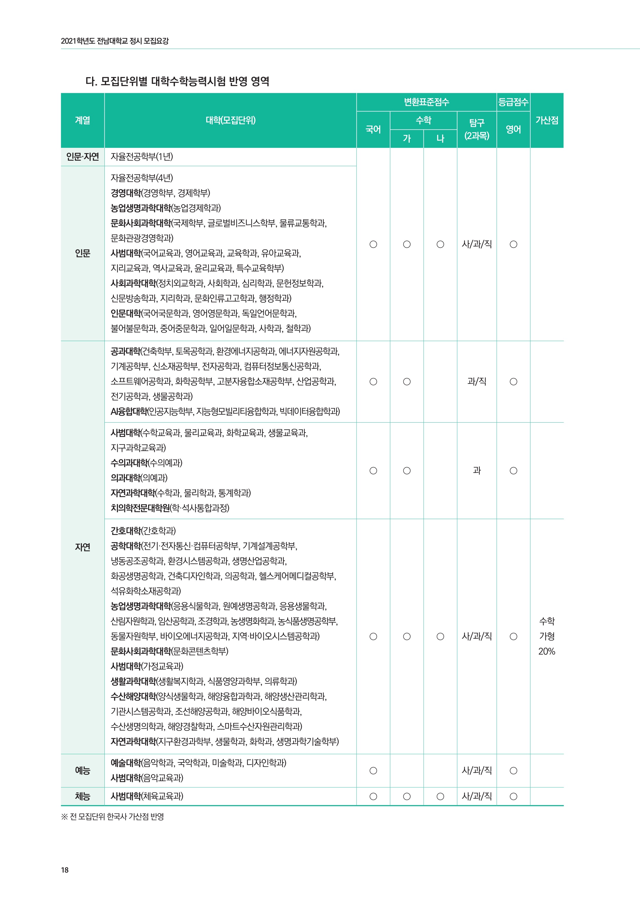 2021학년도 전남대학교 대학수학능력시험 성적 반영 방법