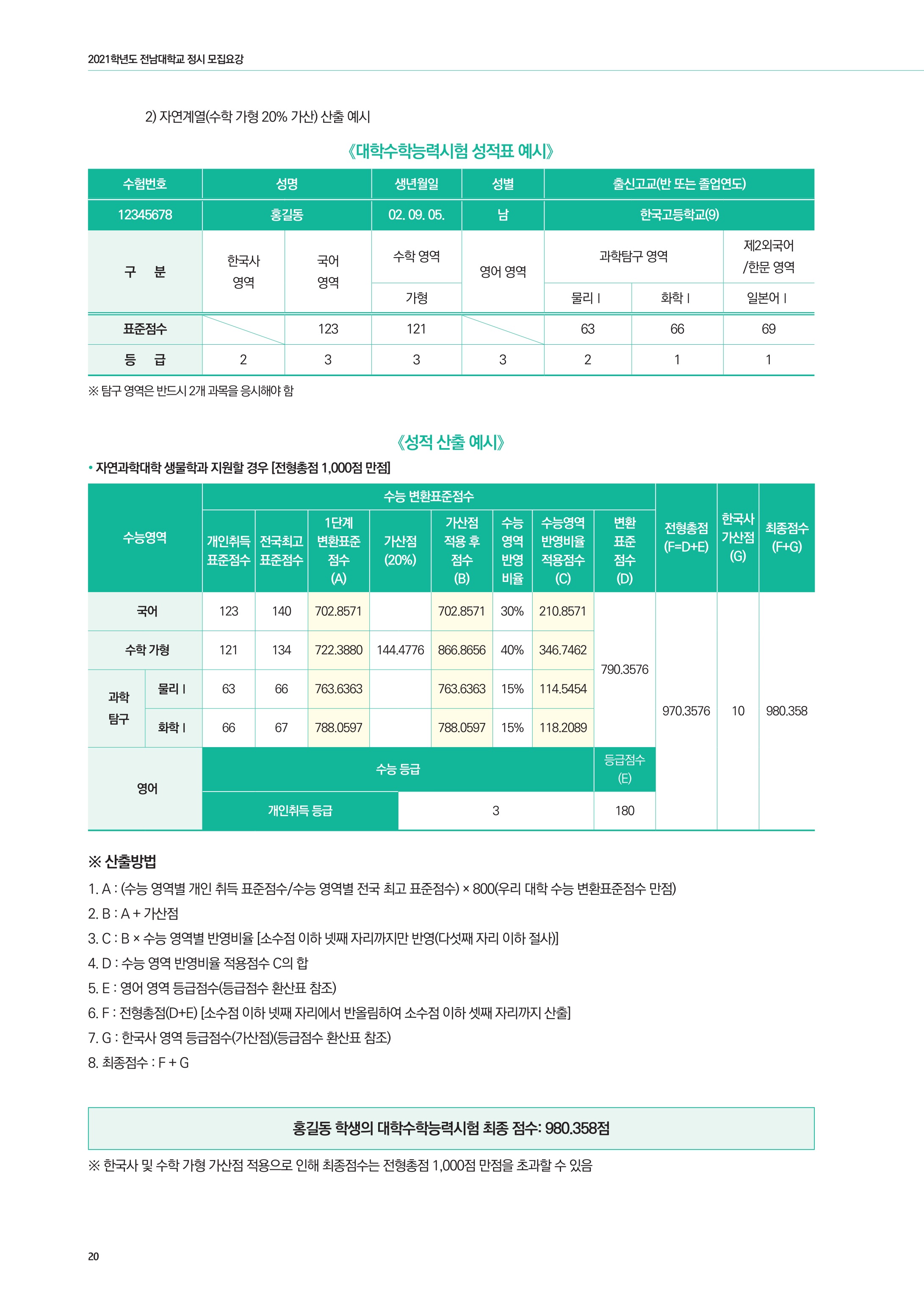 2021학년도 전남대학교 대학수학능력시험 성적 반영 방법 2021학년도 전남대학교 정시등급