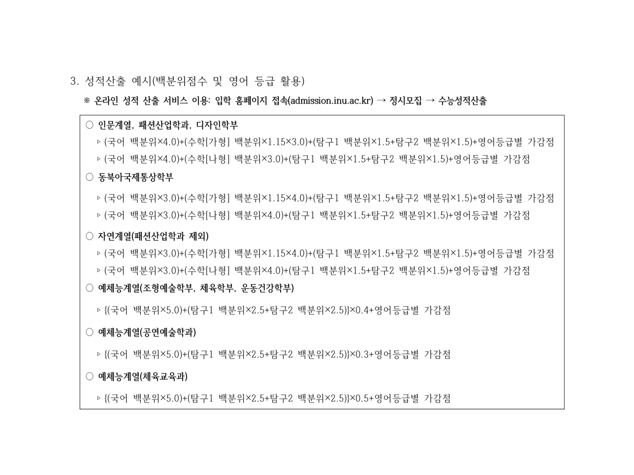 2021학년도 인천대학교 대학수학능력시험 성적 반영방법 2021학년도 인천대학교 정시등급