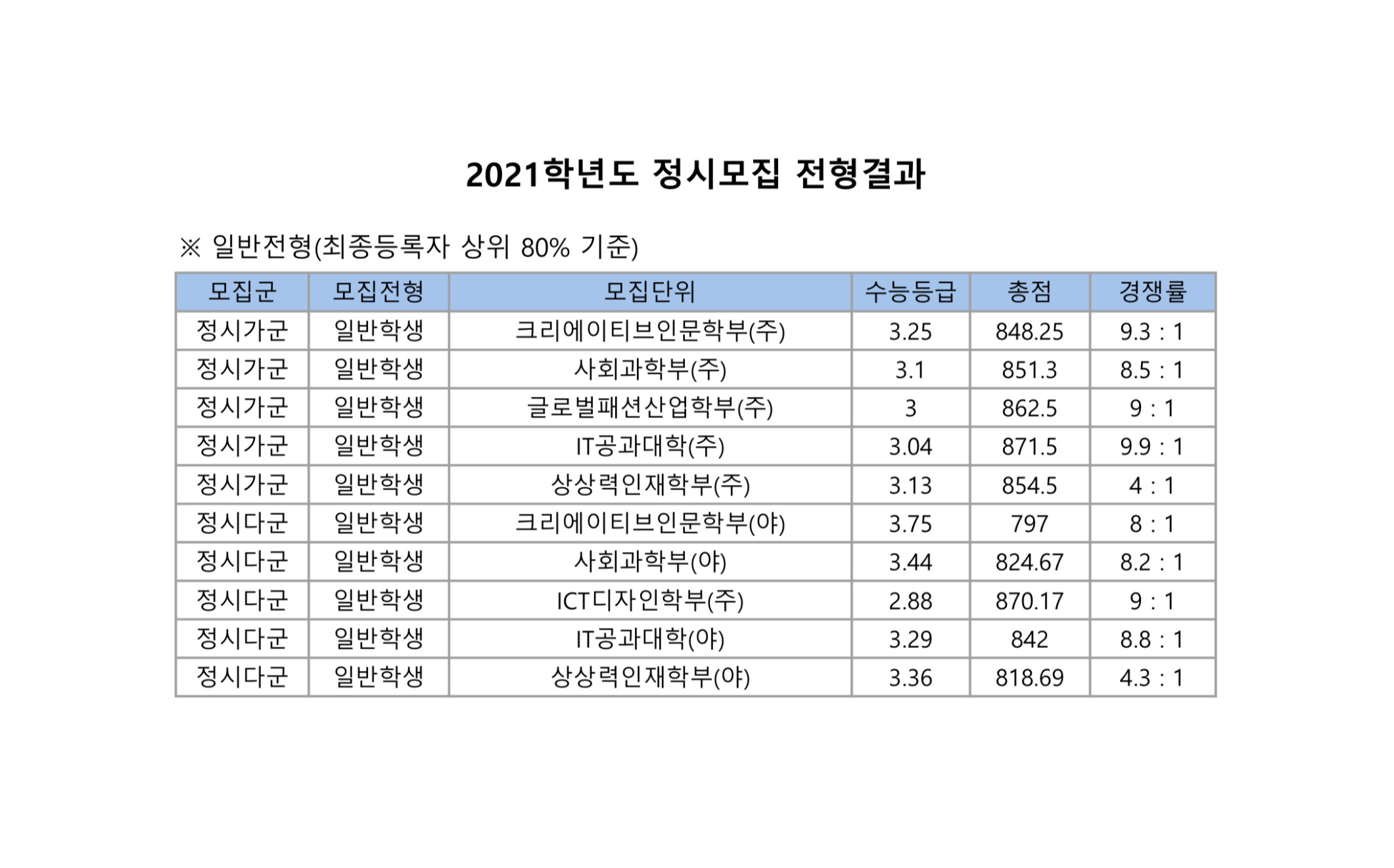 (수능)국어 수학 탐구 평균 가군 상상력인재학부(주) 206 3.98 147 855.5X 1,000 82 89 87 79.00 다군 ICT 디자인학부(주) 4 9.00 0 881.5X 1,000 69.7 92.7 80 80.10 상상력인재학부(야) 60 4.33 39 821.5X 1,000 76 86 82 75.00 * 수시 이월인원이 발생한 모집단위의 경우 제외