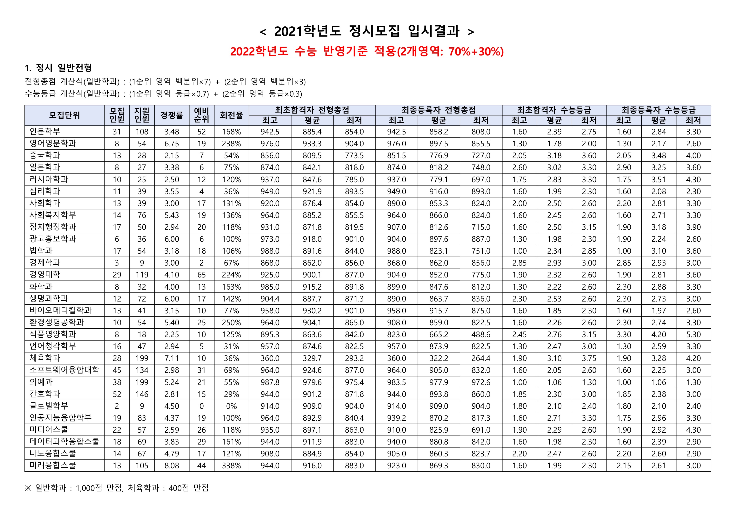 (수능)국어 수학 탐구 평균 가군 인문학부 31 3.48 52 853.8X 1,000 59.00 42.50 55.90 54.50 중국학과 13 2.15 7 762.5X 28.00 38.90 34.90 37.45 러시아학과 10 2.50 12 737.6X 34.80 22.60 44.30 37.07 심리학과 11 3.55 4 926.0X 53.00 42.00 61.50 57.83 사회복지학부 14 5.43 19 858.0X 45.00 54.50 44.55 52.13 경영대학 29 4.10 65 864.0X 45.00 52.10 37.50 46.62 생명과학과 12 6.00 17 876.0X 53.00 34.00 39.50 45.17 바이오메디컬학과 13 3.15 10 926.0X 61.00 24.00 52.00 49.33 식품영양학과 8 2.25 10 580.4X 28.80 30.00 24.80 29.67 언어청각학부 16 2.94 5 866.5X 46.00 41.00 46.25 46.25 소프트웨어융합대학 45 2.98 31 905.9X 51.40 35.00 40.00 48.70 나노융합스쿨 14 4.79 17 885.0X 33.30 34.00 27.50 40.00 나군 일본학과 8 3.38 6 826.0X 43.80 41.50 42.65 41.13 사회학과 13 3.00 17 861.8X 51.60 41.00 45.65 50.30 정치행정학과 17 2.94 20 823.6X 41.00 37.40 38.80 39.10 광고홍보학과 6 6.00 6 911.2X 49.00 53.00 53.70 51.10 법학과 17 3.18 18 814.0X 38.80 47.50 41.10 44.93 경제학과 3 3.00 2 - - - - - 체육학과 28 7.11 10 329.1X 400 31.00 26.60 24.50 36.35 의예과 38 5.24 21 977.2X 1,000 99.00 98.00 96.50 97.83 간호학과 52 2.81 15 898.0X 59.00 86.00 70.00 73.67 인공지능융합학부 19 4.37 19 757.9X 47.20 63.20 47.70 57.52 미디어스쿨 22 2.59 26 808.0X 38.00 49.00 36.50 41.33 데이터과학융합스쿨 18 3.83 29 891.9X 40.30 39.30 44.60 48.52 다군 영어영문학과 8 6.75 19 898.0X 40.00 12.80 61.80 45.07 화학과 8 4.00 13 856.2X 39.60 41.40 38.10 45.00 환경생명공학과 10 5.40 25 868.5X 45.80 33.40 29.85 44.03 글로벌학부 2 4.50 0 - - - - - 융합인재학부 26 3.46 41 764.5X 55.00 38.00 52.30 55.13 미래융합스쿨 13 8.08 44 880.4X 55.80 35.00 28.80 43.03 ※ 정시 일반전형 경제학과, 글로벌학부는 선발인원이 3명 이하이므로 입력하지 않음