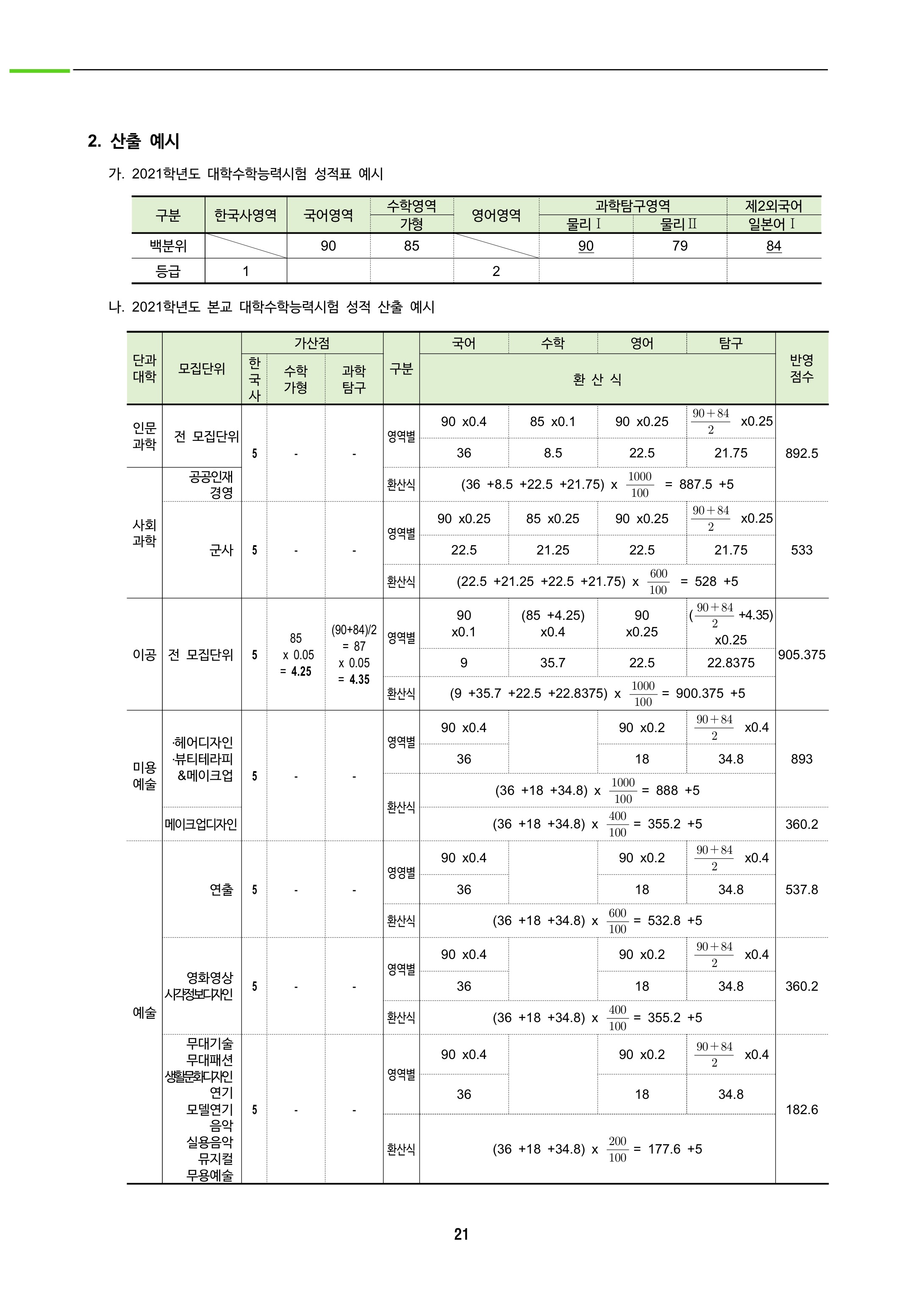 2) 환산점수: 각 모집단위별 학생선발에 활용된 환산점수