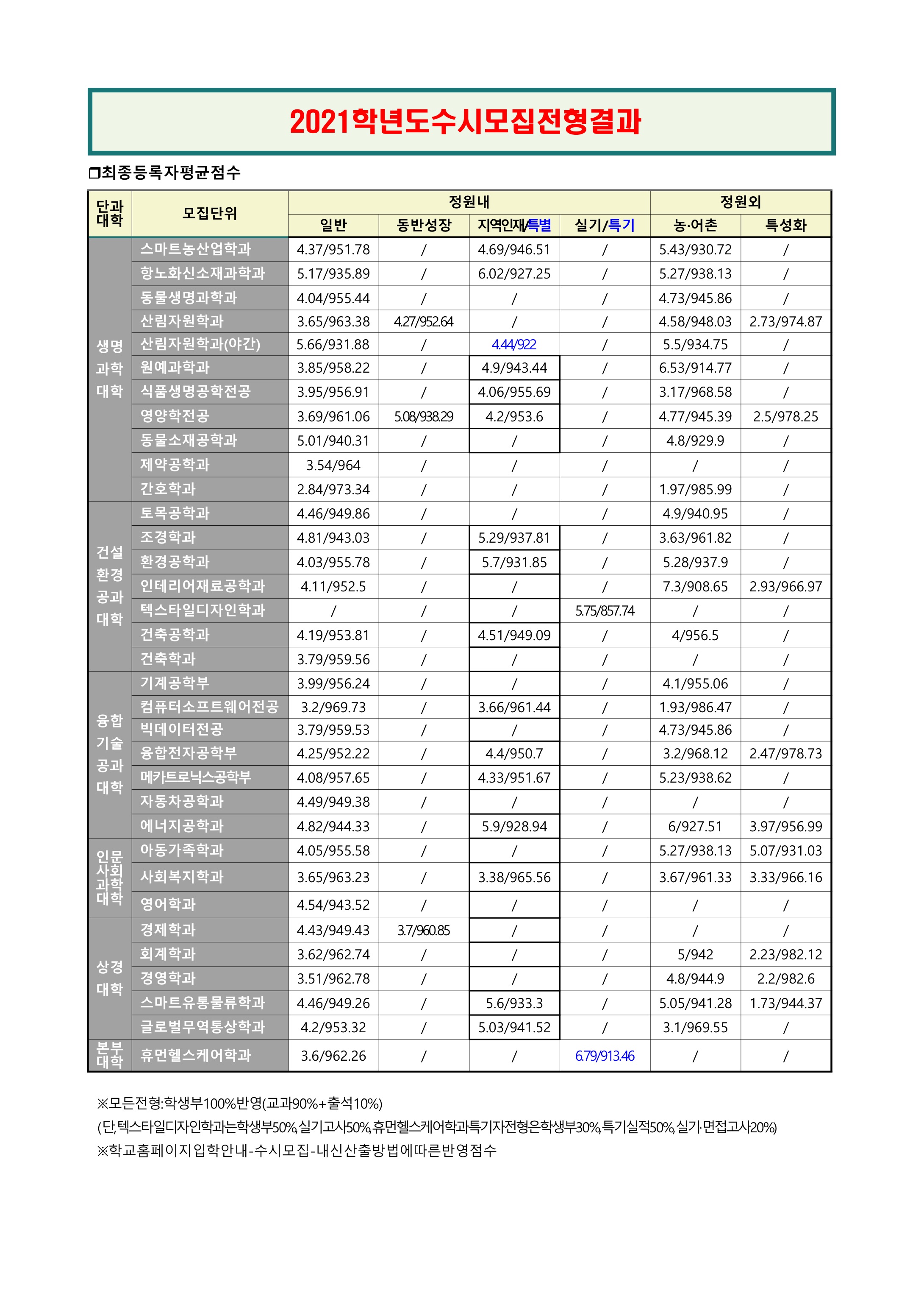 전형 2021학년도 (상위 3개 영역 합, 탐구 2개 평균) 2022학년도 (상위 3개 영역 합, 탐구 1개 반영) 학생부교과/실기 해양대, 인문대(민속무용학과), 농생대(축산학과, 동물생명과학과), 자연대(물리학과, 식품영양학과) 없음 본부대, 인문대(국어국문, 독어독문, 러시아, 영어영문, 철학, 한문, 민속무용), 자연대(생명과학, 물리, 식품영양, 지질과학, 항노화신소재, 제약공학, 컴퓨터과학부(컴퓨터소프트웨어전공)), 공대(산업시스템, 토목공학, 반도체공학, 도시공학, 농생대, 사범대(물리), 융합기술공대, 건설환경공대, 해양대 없음 사범대(음악교육과) 14 자연대(수학, 정보통계), 사범대(음악) 14 본부대, 인문대, 경영대, 자연대, 농생대, 법과대, 공과대, 사범대(미술체육교육과) 13 인문대(불어불문, 사학과, 중어중문), 자연대(의류학과, 컴퓨터과학부(컴퓨터과학전공), 화학과), 경영대, 공대(건축학과, 나노신소재공학부(고분자공학전공, 금속재료공학전공, 세라믹공학전공), 전자공학, 제어계측공학, 화학공학, 기계공학부, 전기공학, 항공우주및소프트웨어공학부, 건축공학부), 법대, 사범대(미술, 체육) 13 사회대 12 사회대 12 간호대, 사범대(일어·물리교육과) 10 간호대, 사범대(일어교육과) 12 사범대(교육·국어·역사·영어·유아·윤리·일반사회·지리·수학·생물·화학교육과)