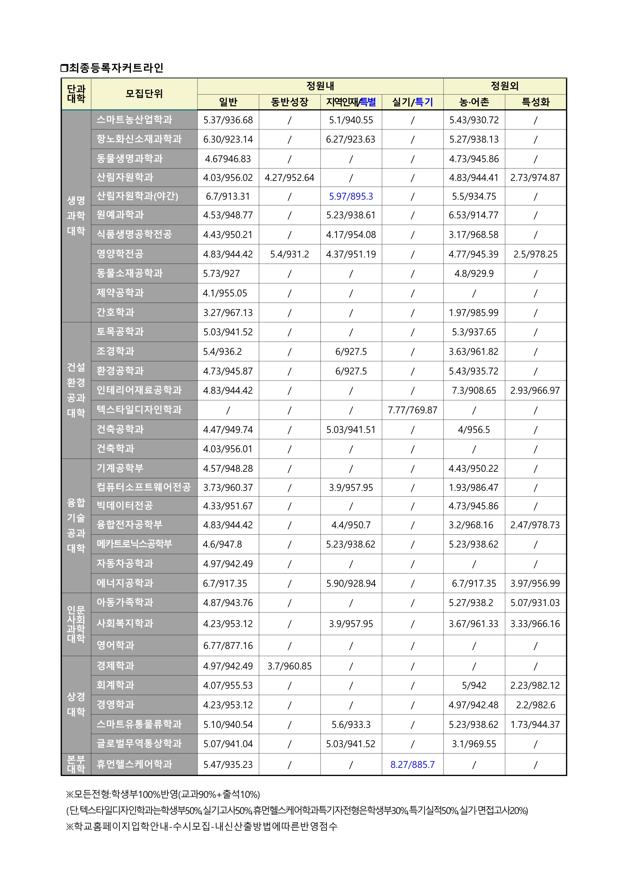 2) 환산점수 70%cut : 각 모집단위별 학생선발에 활용된 환산점수(100명중 70등의 점수)