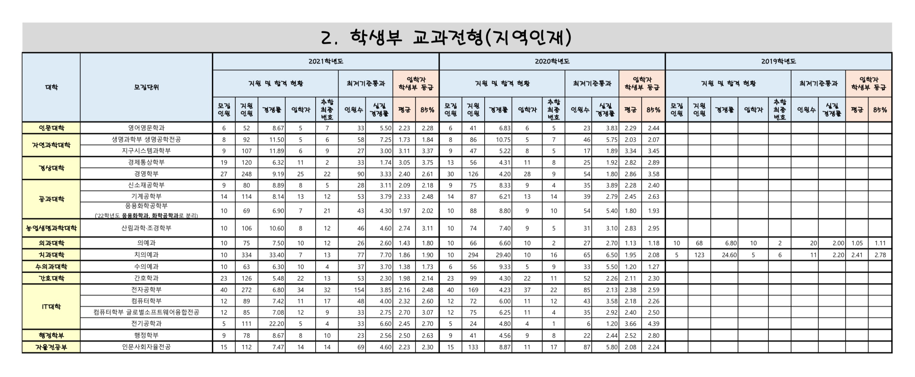섬유공학전공16 2.75 450 융복합시스템공학부 34 2.32 210.3X 450 5.8X 치위생학과 10 6.10 17 305.8X 450 3.9X 2021학년도 경북대학교 학생부교과 지역인재전형 수시등급