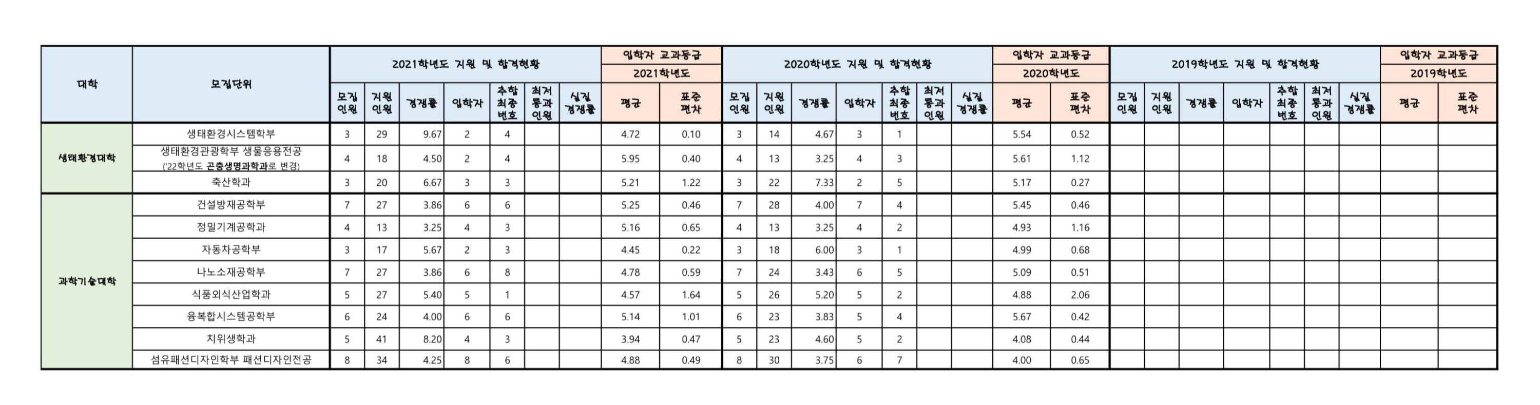 (2022학년도 곤충생명과학과로 변경)14 3.57 243.1X 450 5.1X 축산학과 11 5.00 3 271.1X 450 4.3X 축산생명공학과 17 2.71 232.8X 450 5.4X 말/특수동물학과 18 5.44 18 322.8X 450 3.6X 생태환경관광학부 생태관광전공