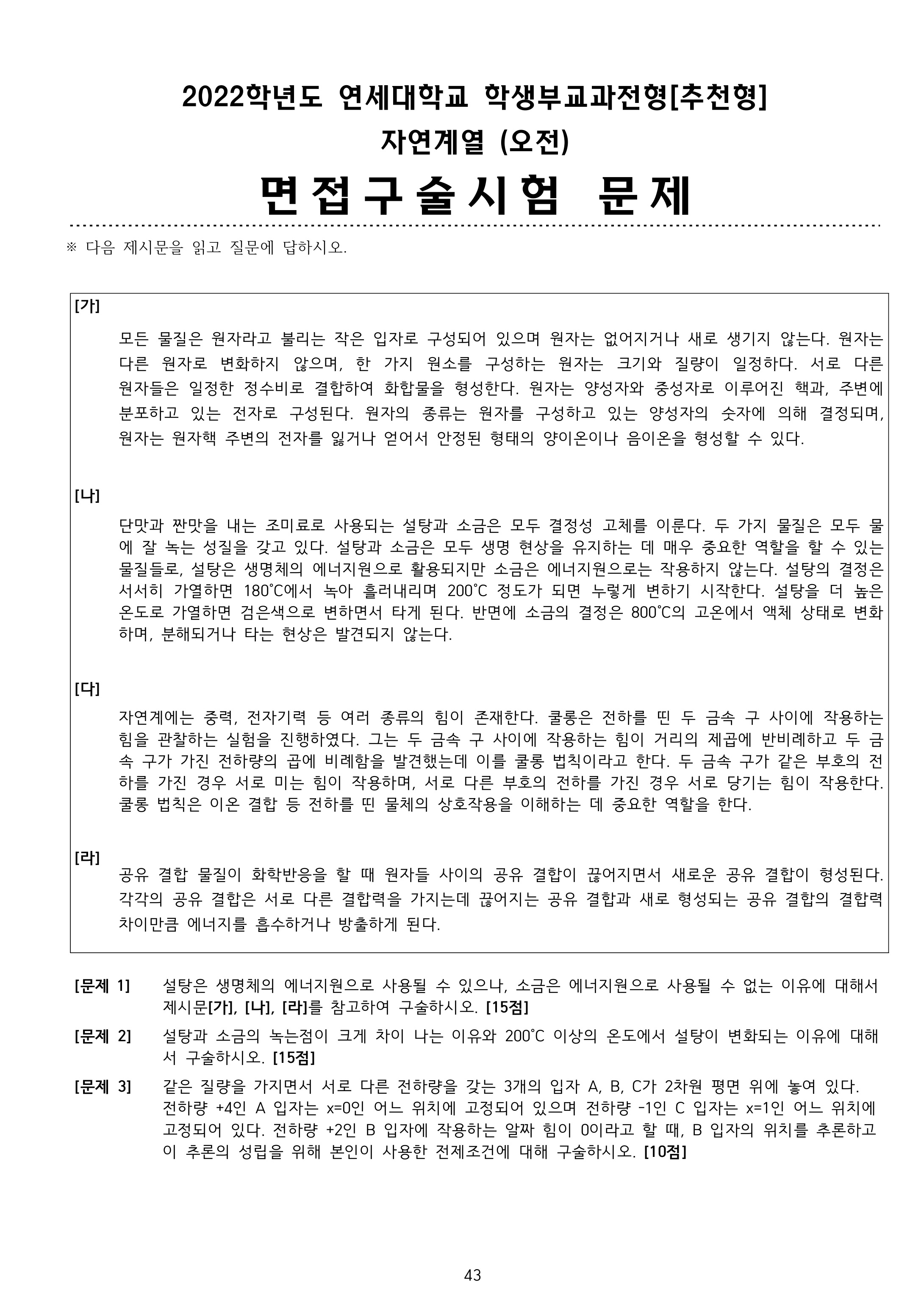 2022학년도 연세대학교 학생부교과전형[추천형] 자연계열 (오전) 면접구술시험 문제 2022학년도 연세대학교 학생부교과전형[추천형] 자연계열 (오후) 면접구술시험 문제