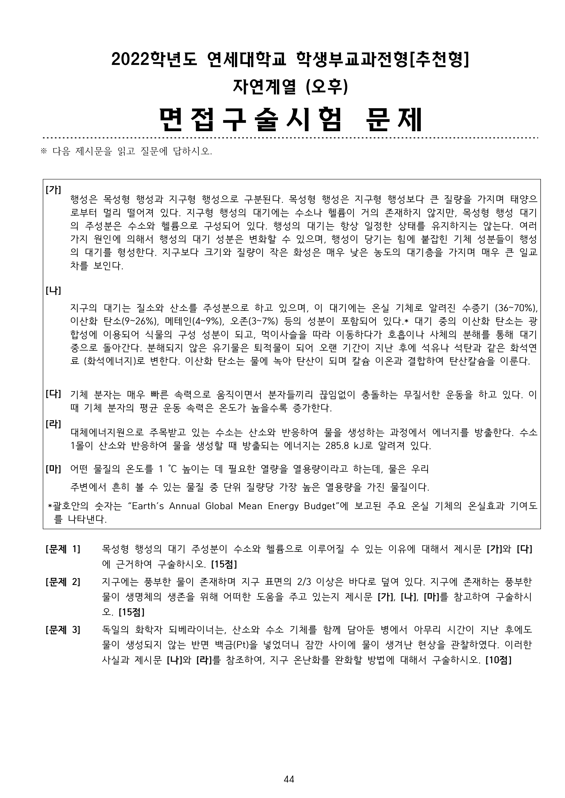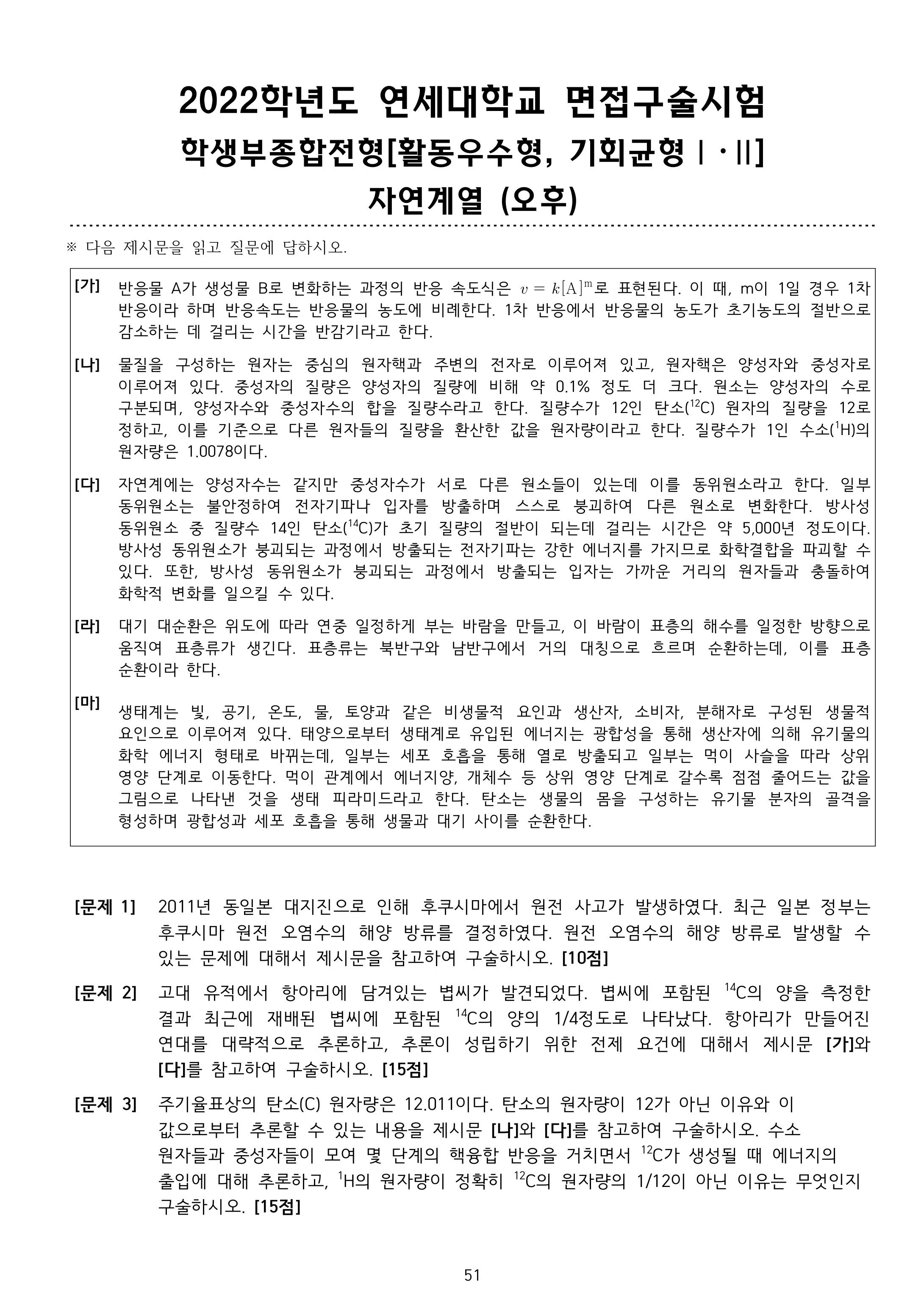 2022학년도 연세대학교 학생부교과전형[추천형] 자연계열 (오후) 면접구술시험 문제 2022학년도 연세대학교 학생부종합전형[활동우수형, 기회균형Ⅰ·Ⅱ] 자연계열 (오전) 면접구술시험 문제