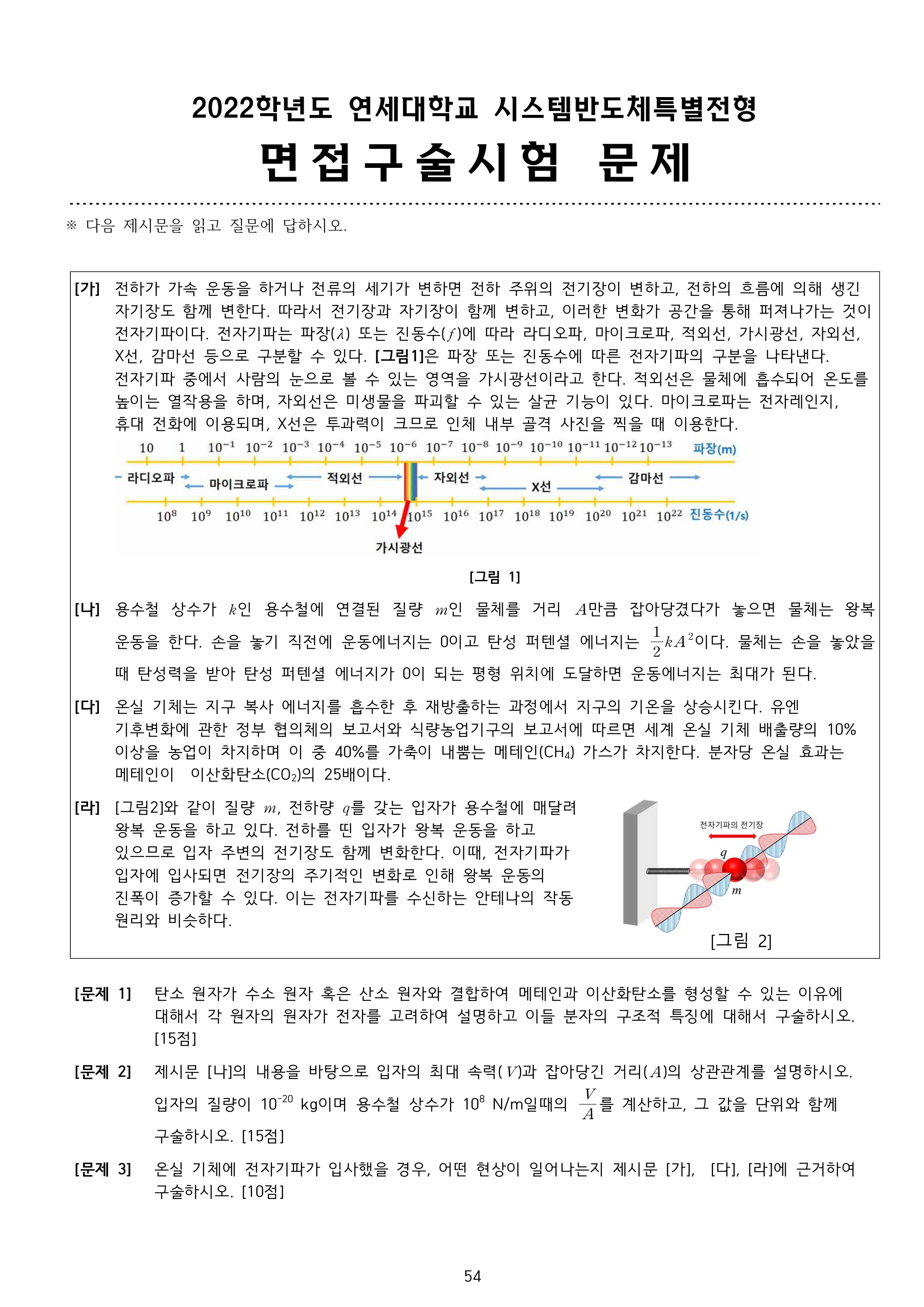 2022학년도 연세대학교 학생부종합전형[활동우수형, 기회균형Ⅰ Ⅱ] 자연계열 (오후) 면접구술시험 문제 2022학년도 연세대학교 시스템반도체특별전형 면접구술시험 문제