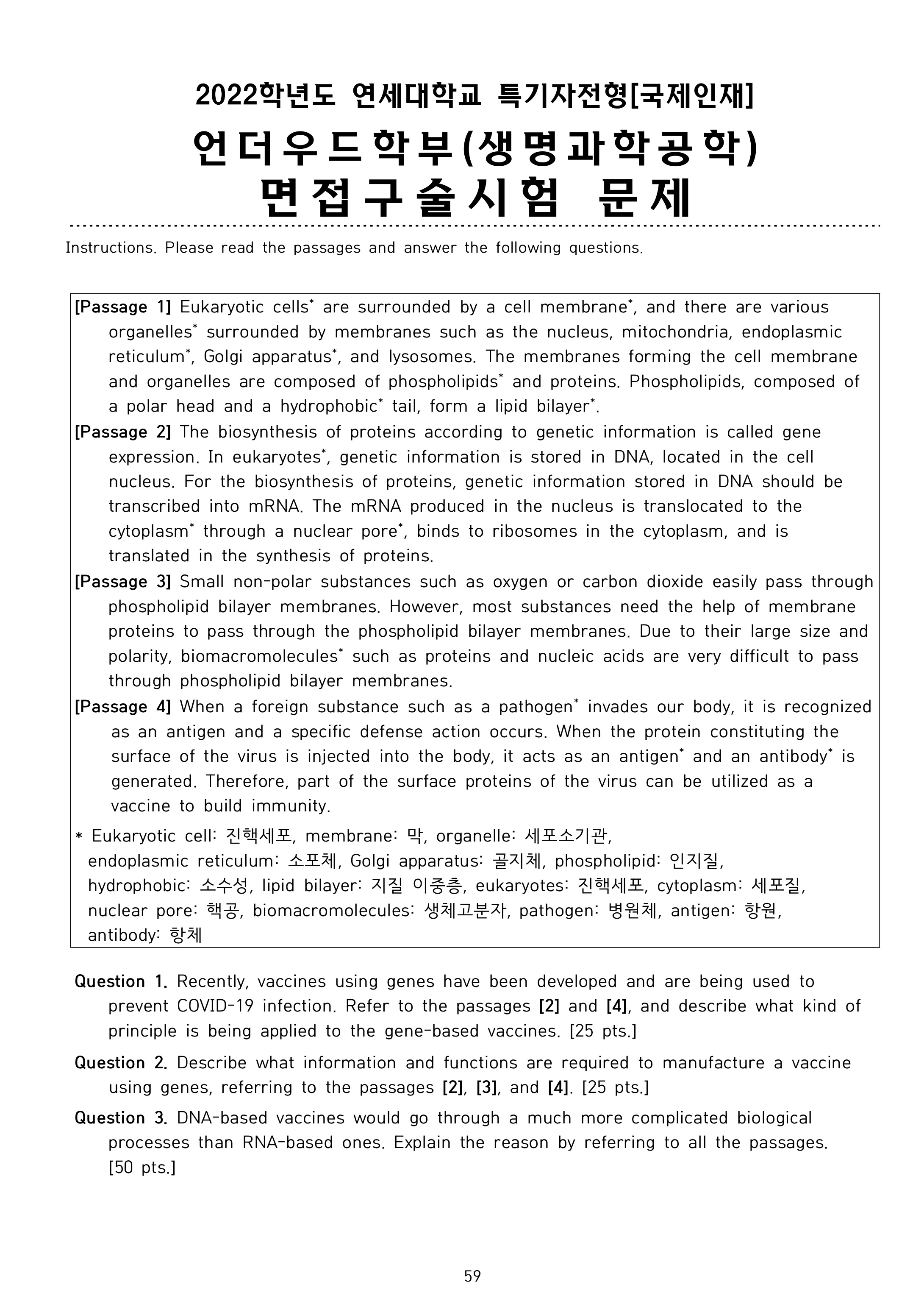 2022학년도 연세대학교 특기자전형[국제인재] 언더우드학부(생명과학공학) 면접구술시험 문제 2022학년도 연세대학교 대학별고사 자료집 (논술전형 및 면접전형 안내 자료)