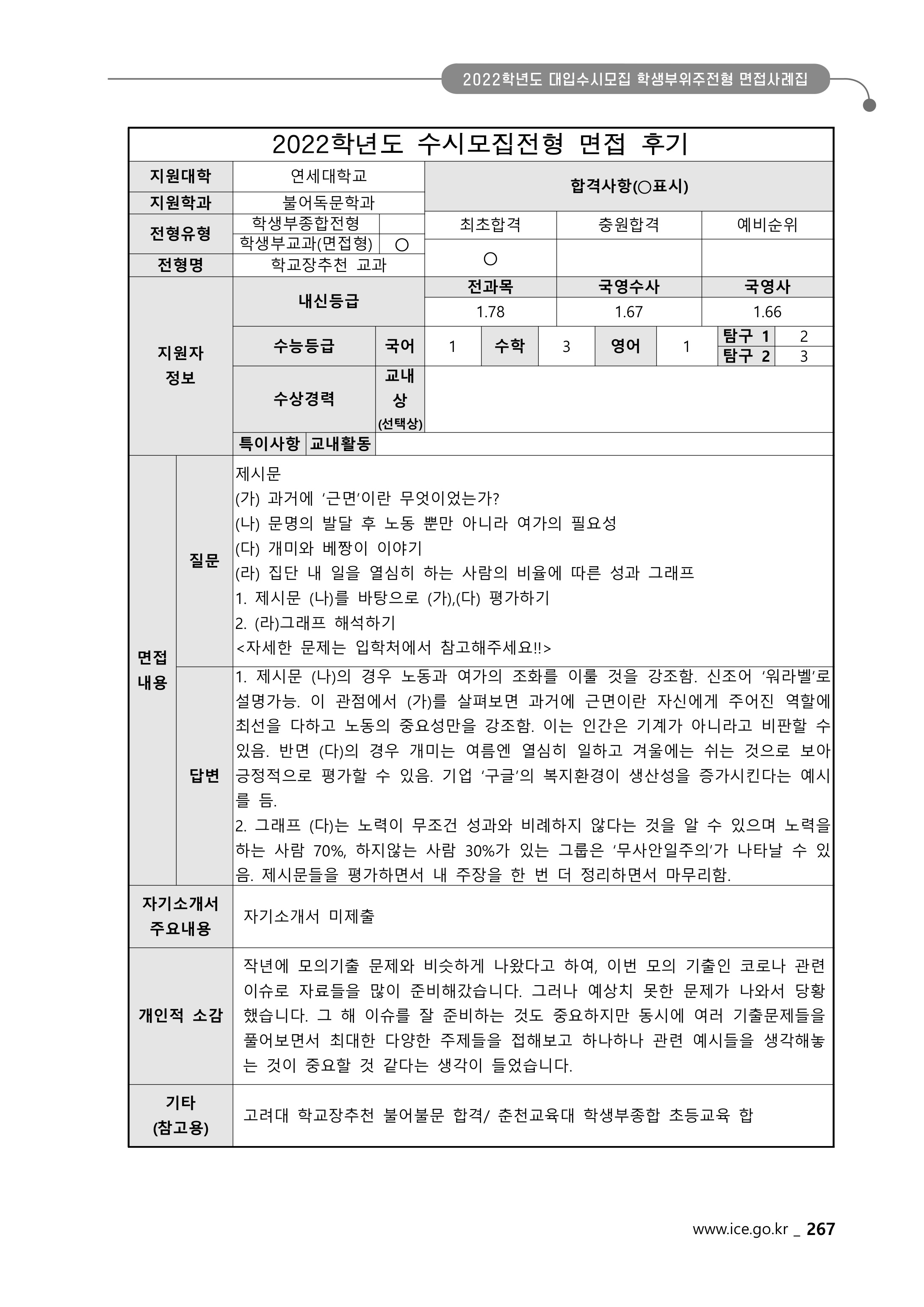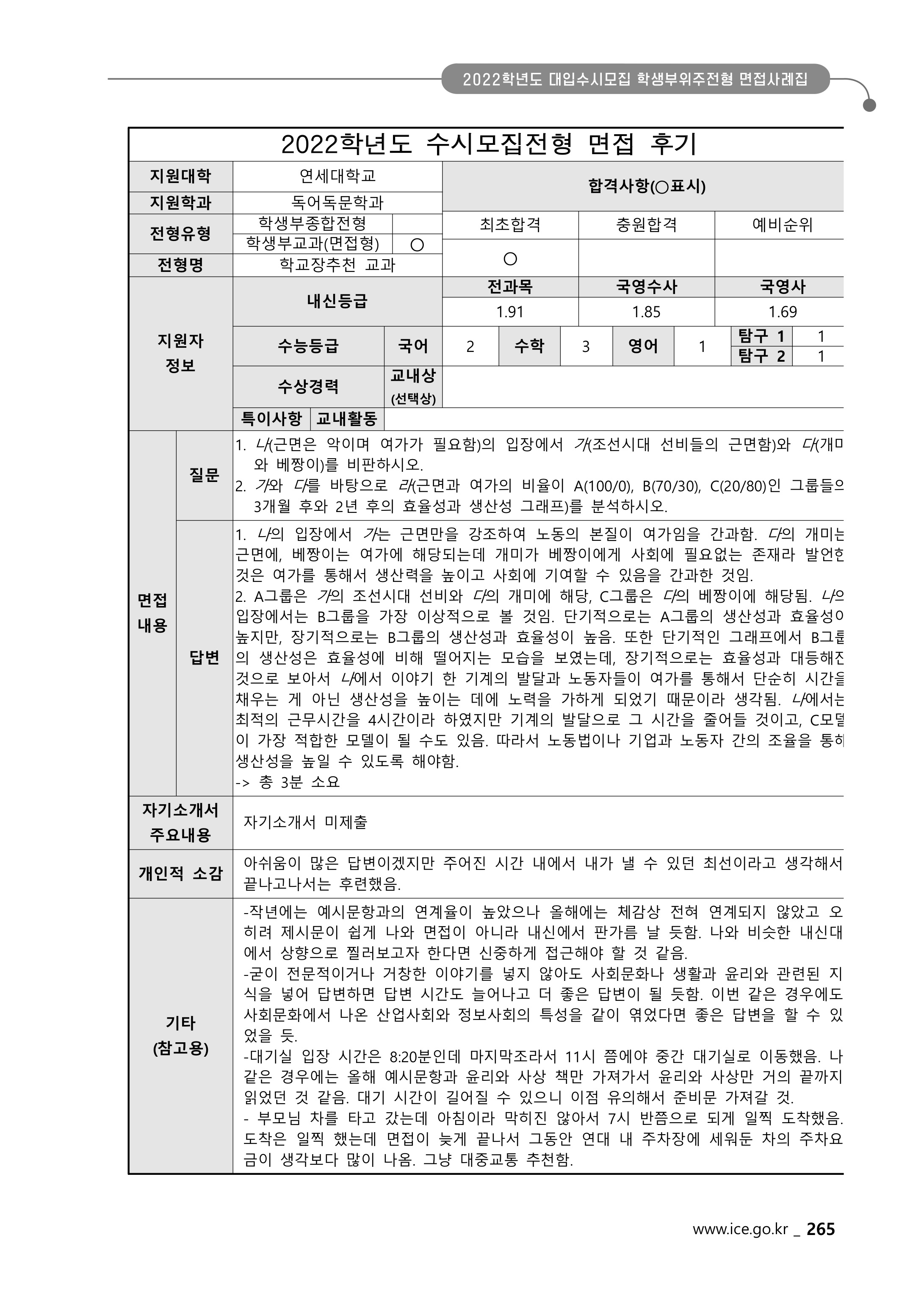 2022학년도 연세대학교 면접 후기19 - 독어독문학과 2022학년도 연세대학교 면접 후기20 - 문헌정보학과