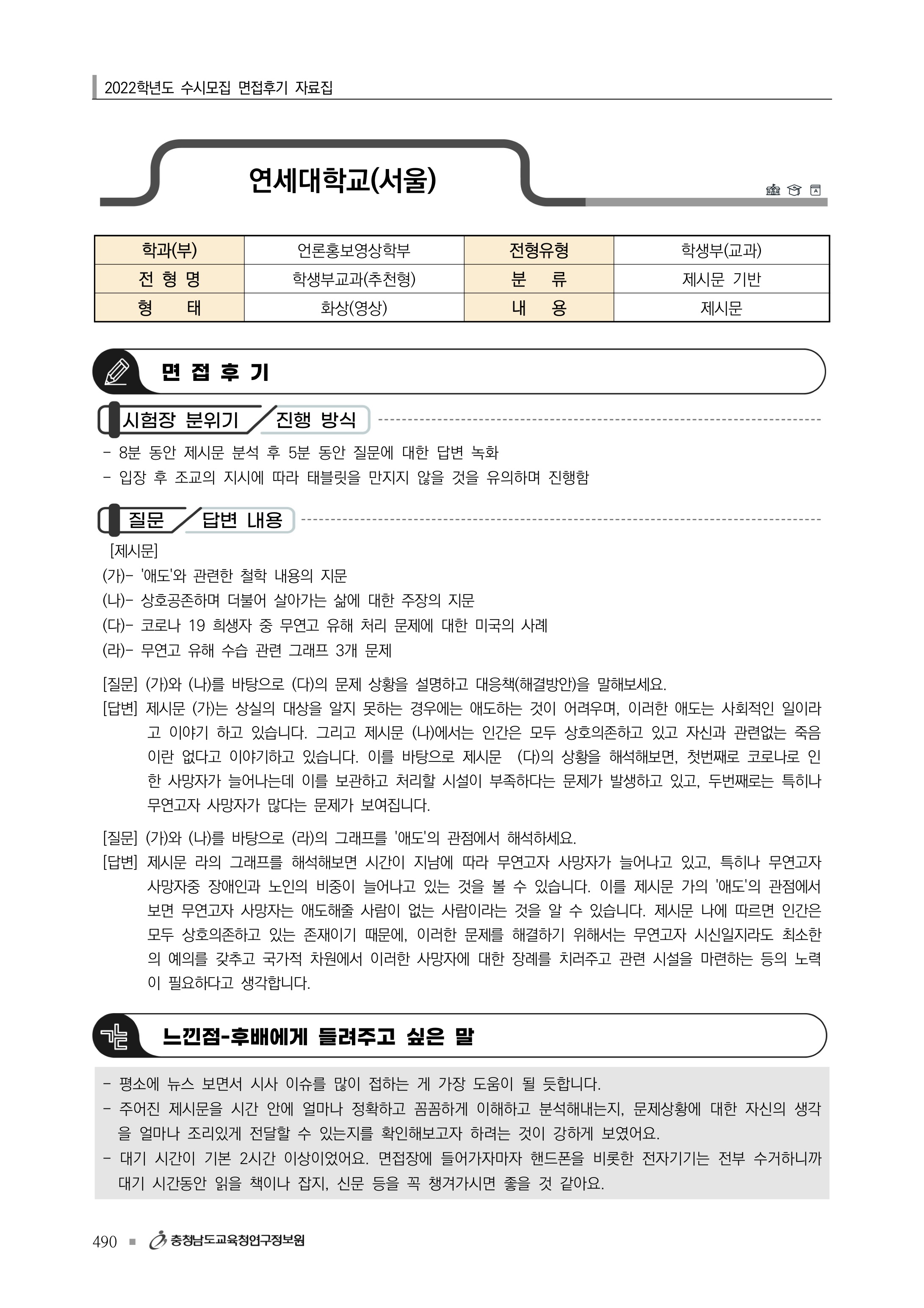 2022학년도 연세대학교 면접 후기38 - 언더우드학부 2022학년도 연세대학교 면접 후기39 - 언론홍보영상학부