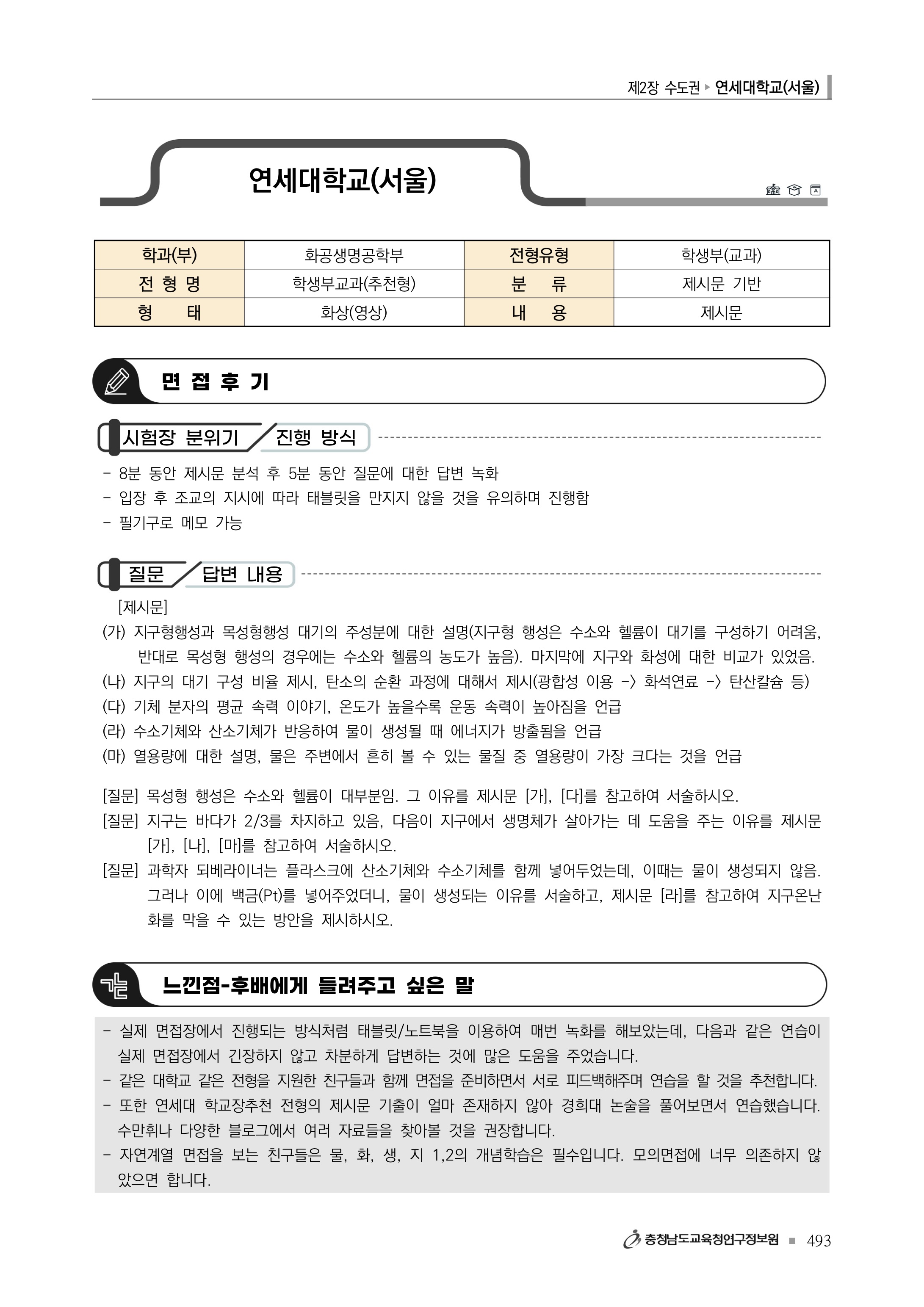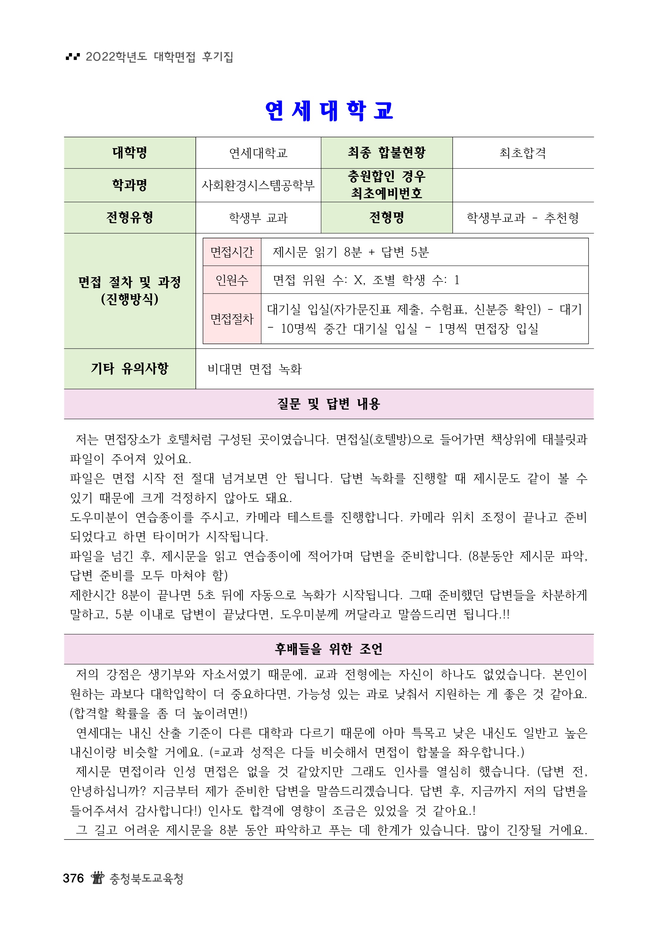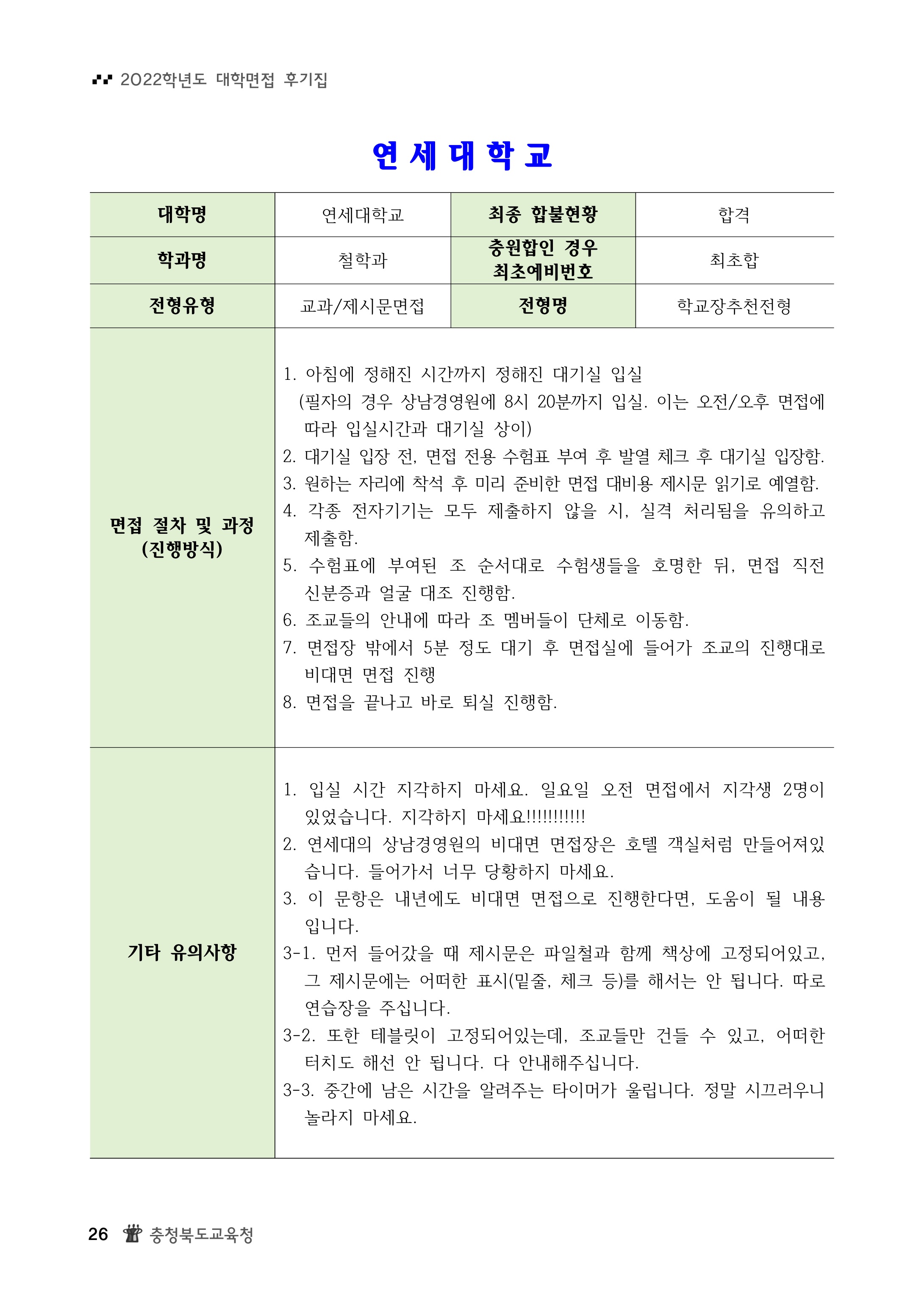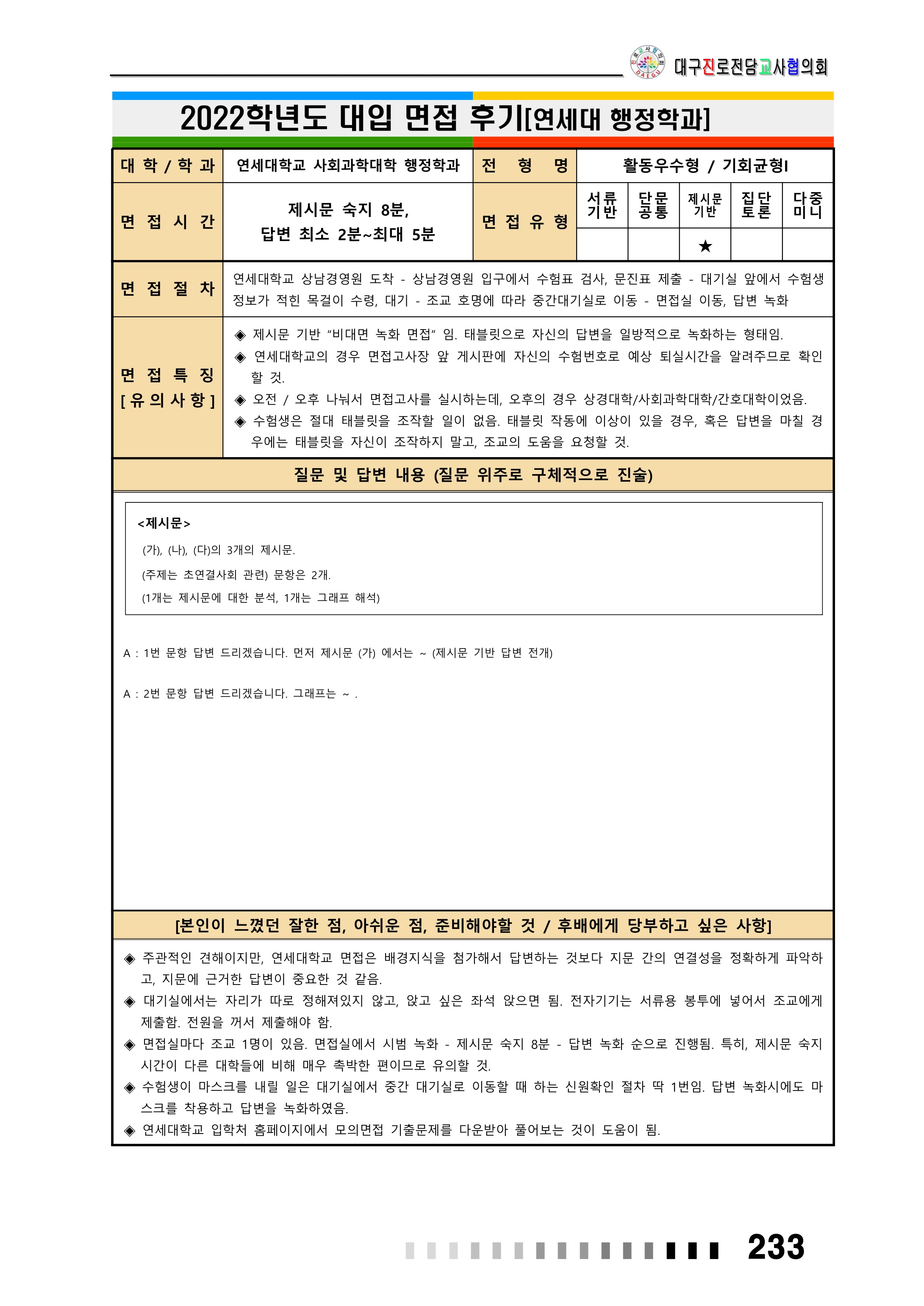 2022학년도 연세대학교 면접 후기53 - 행정학과 2022학년도 연세대학교 면접 후기54 - 화공생명공학부