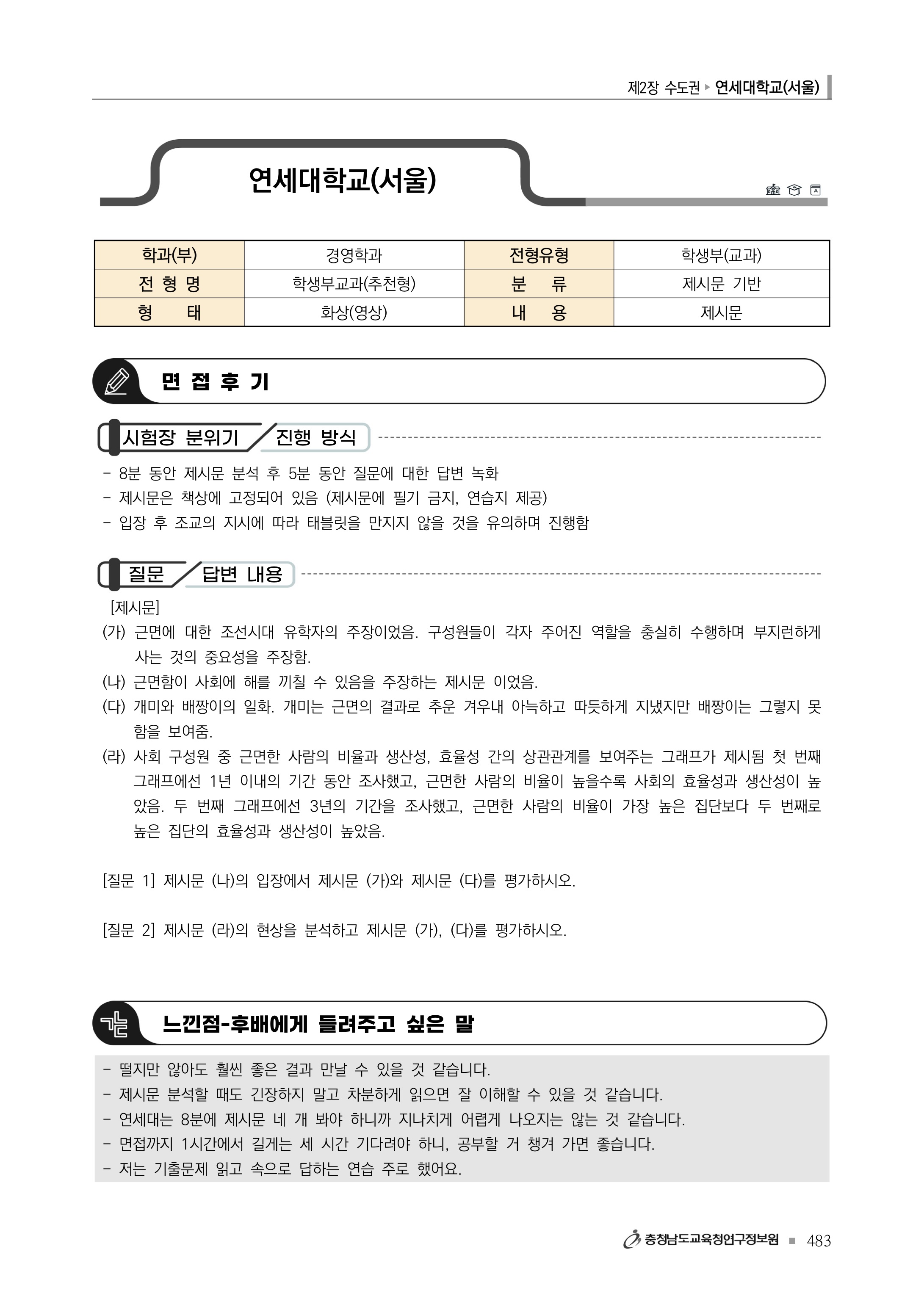 2022학년도 연세대학교 면접 질문 횐님들 안녕하세영! 오늘은 2022학년도에 연세대학교 수시에서 출제된 면접 질문을 살펴볼 거예영. 연세대학교 수시전형에는 학과별로 제시문 면접이 있는데영, 아래 후기를 보면 제시문 면접이 어떻게 진행됐는지, 합격한 선배들은 어떻게 대답을 했는지 자세히 알 수 있어영. 서울캠퍼스와 미래캠퍼스의 학과 이름순으로 정리했으니 자신이 지원한 학과가 있는지 확인해 보세영. 2022학년도에 출제된 연세대학교 제시문 문제와 해설도 맨 아래에 링크해 두었어영!😸