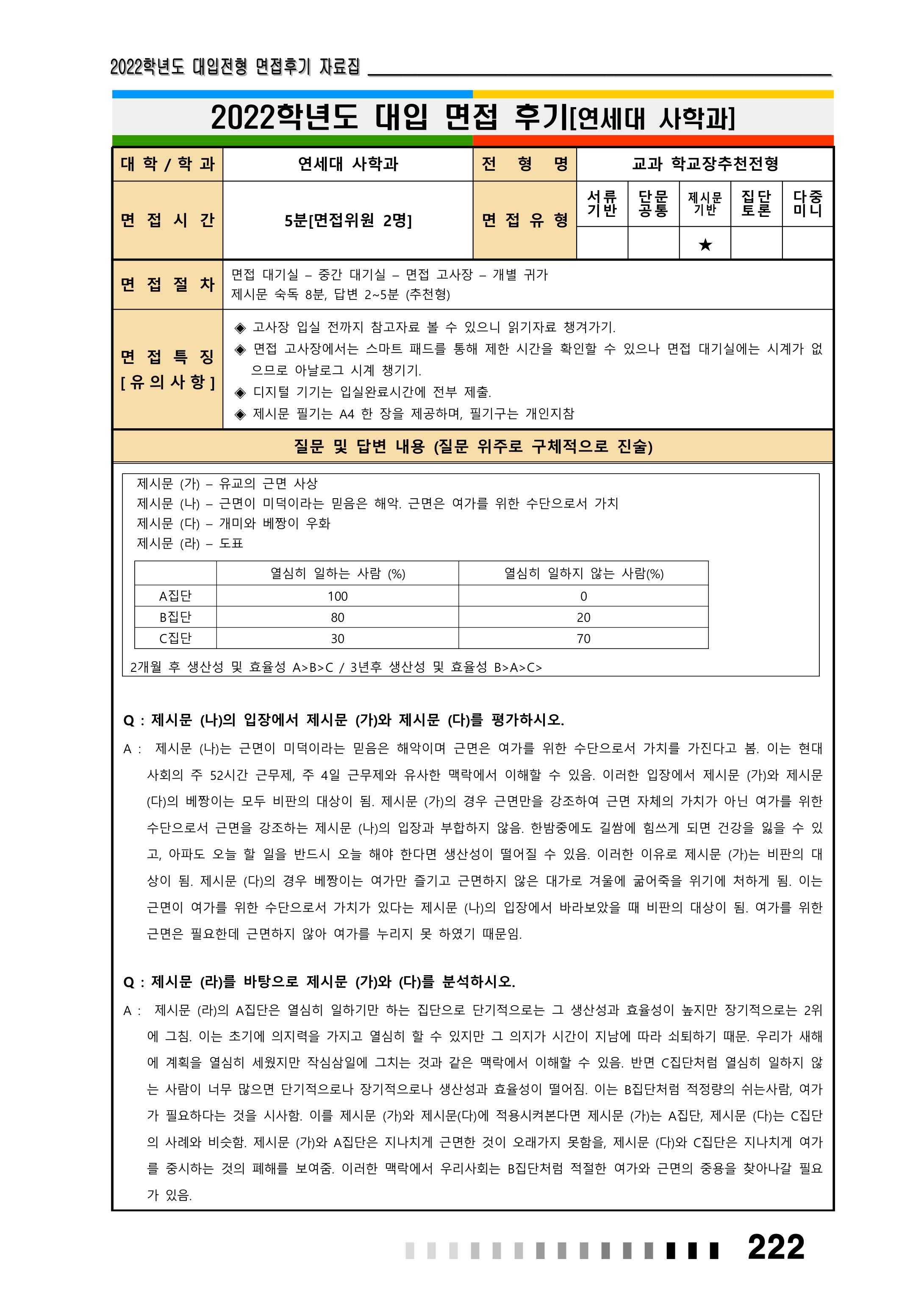 2022학년도 연세대학교 면접 후기25 - 사회학과 2022학년도 연세대학교 면접 후기26 - 사회환경시스템공학부
