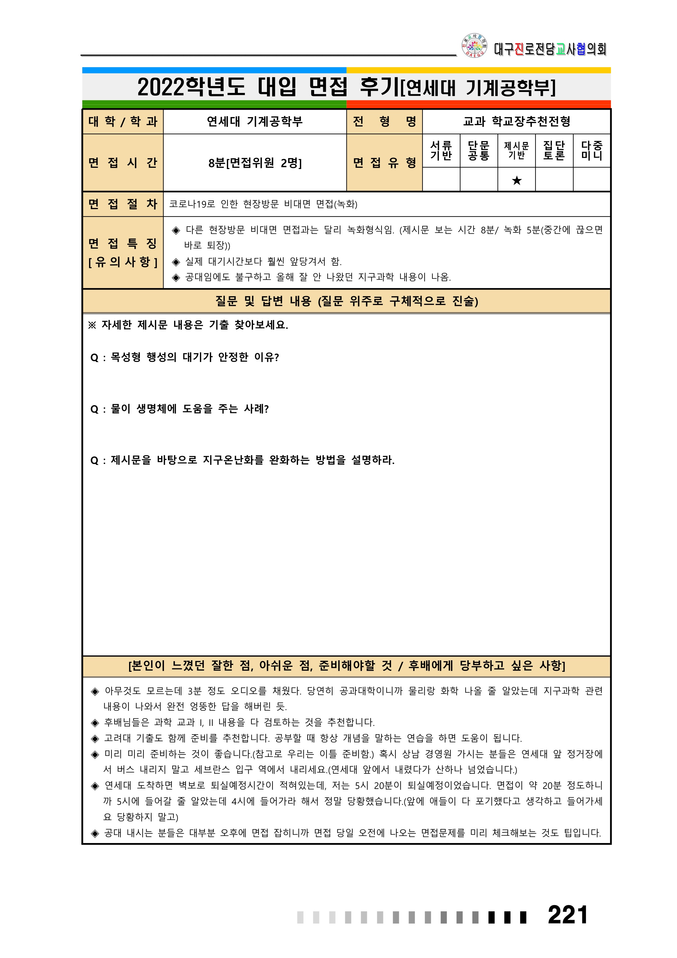 2022학년도 연세대학교 면접 후기15 - 글로벌융합공학부 2022학년도 연세대학교 면접 후기16 - 기계공학부
