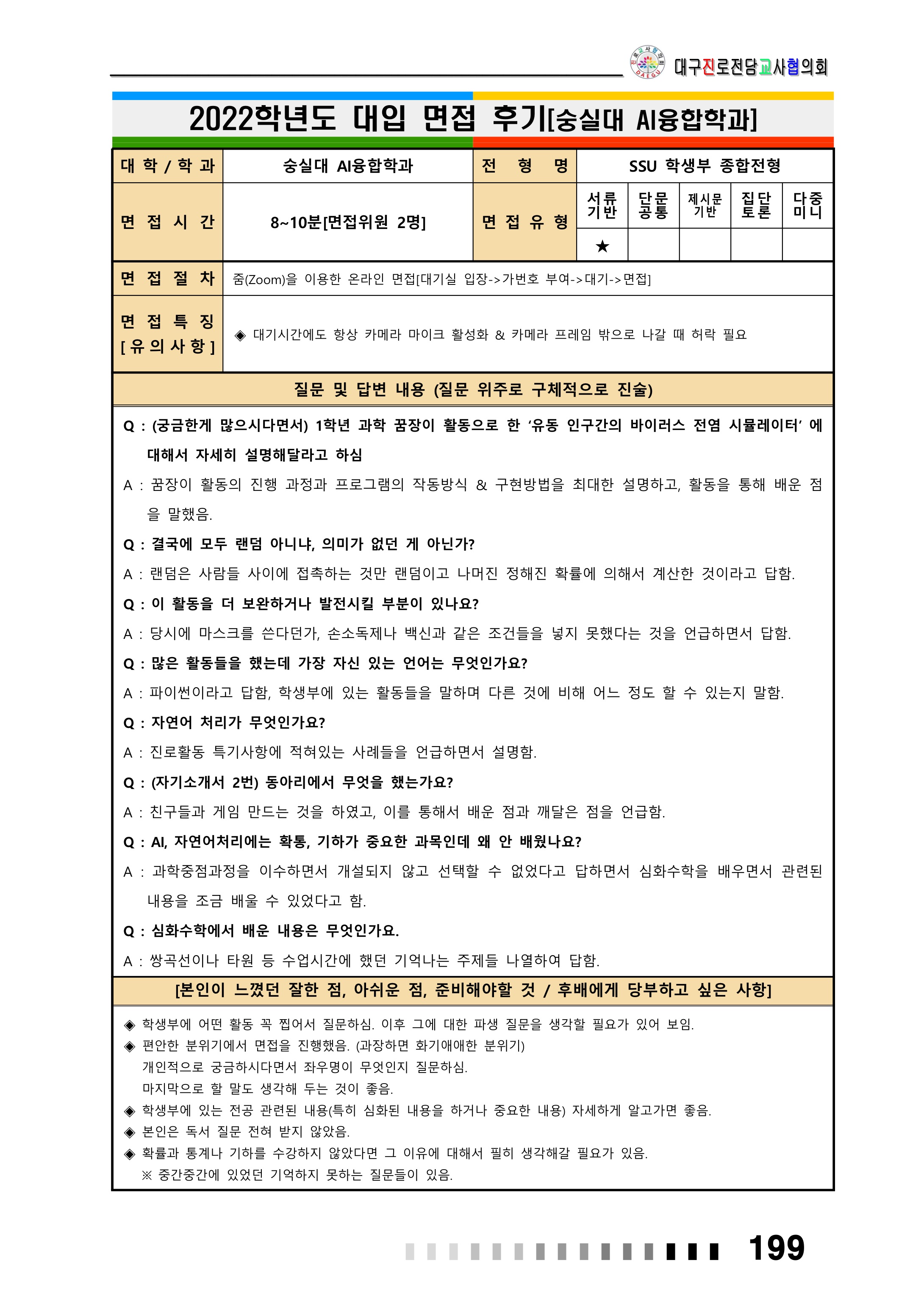 2022학년도 숭실대학교 면접 후기28 - 화학공학과 2022학년도 숭실대학교 면접 후기29 - AI융합학과