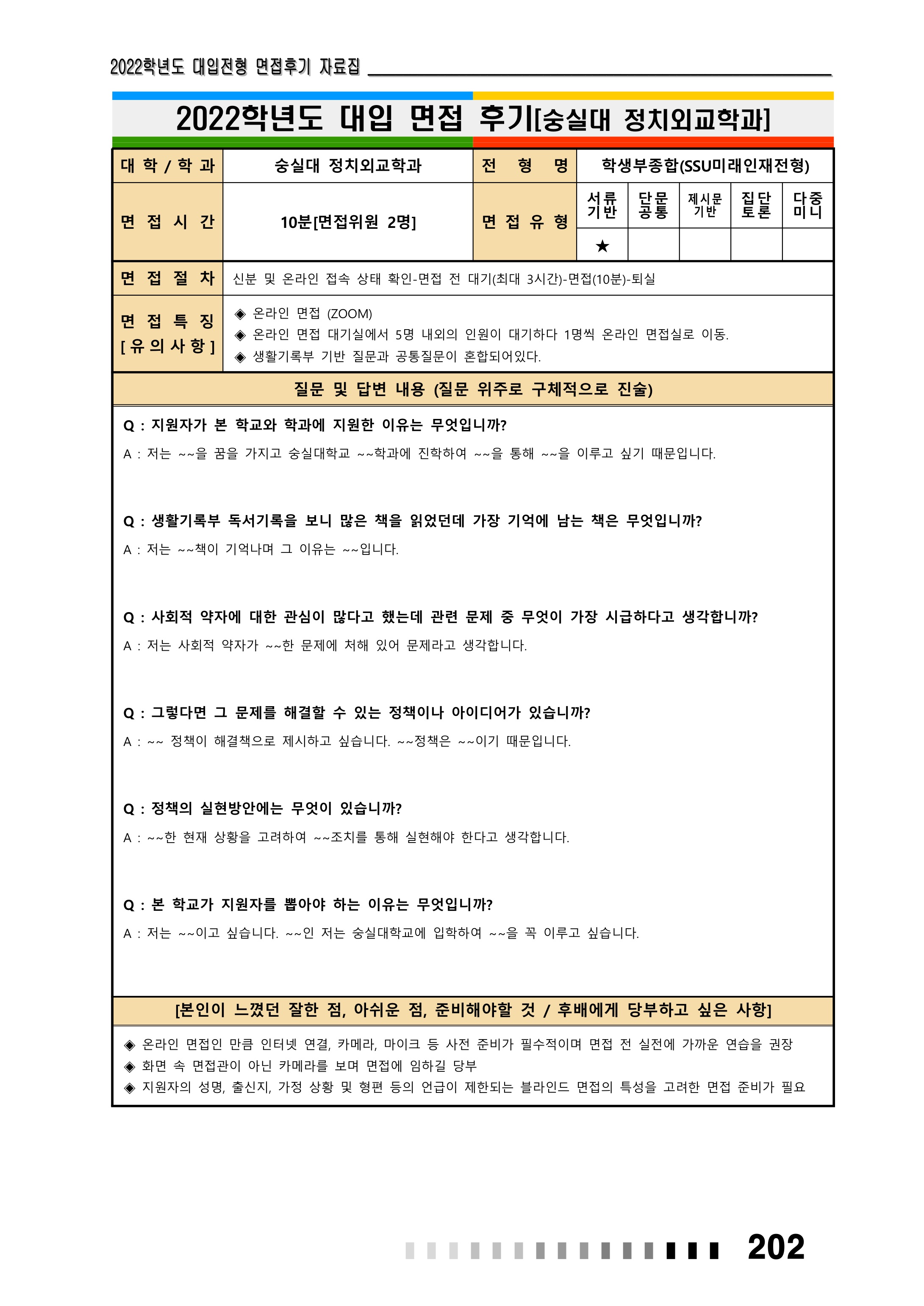 2022학년도 숭실대학교 면접 후기21 - 정보통계보험수리학과 2022학년도 숭실대학교 면접 후기22 - 정치외교학과