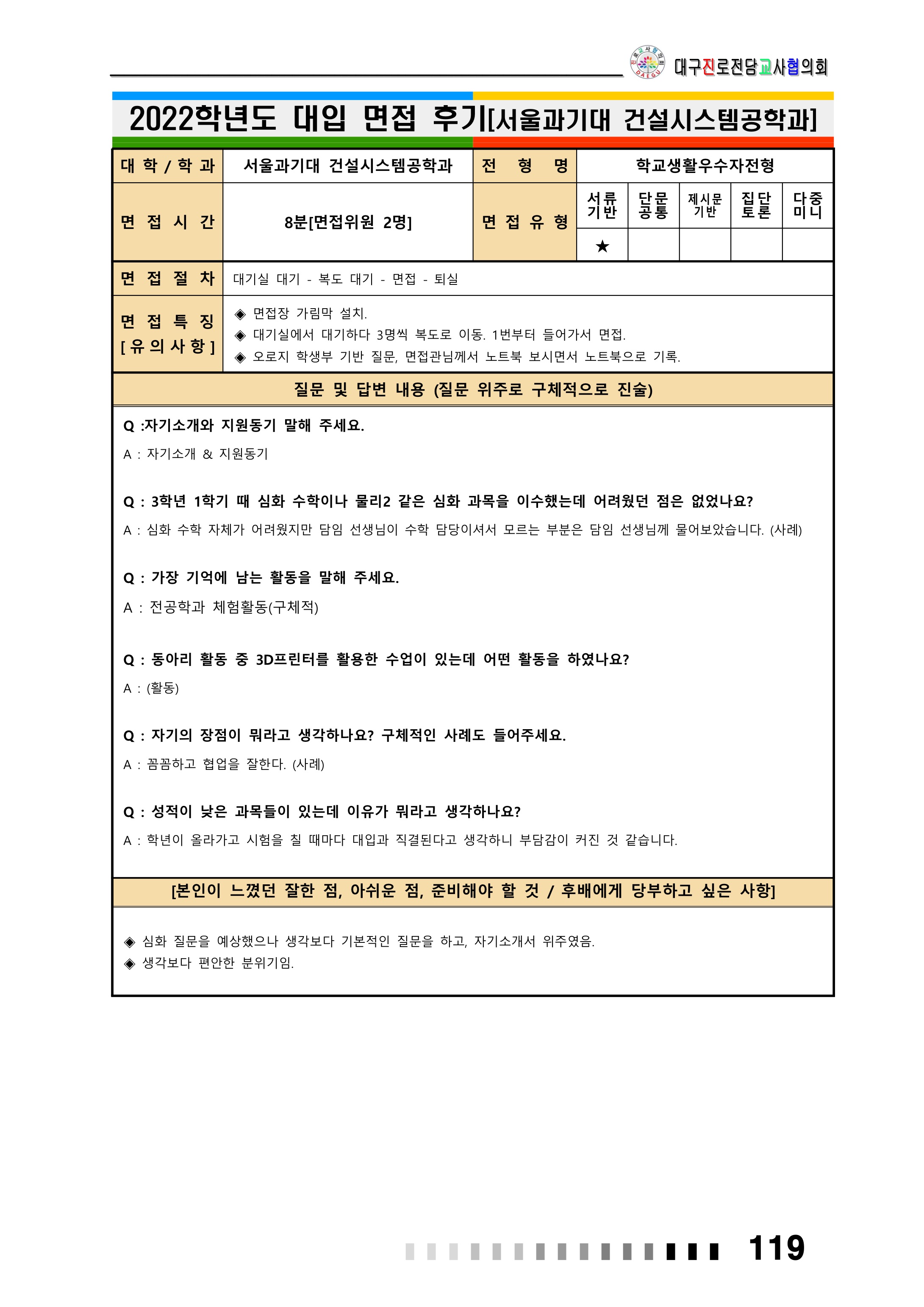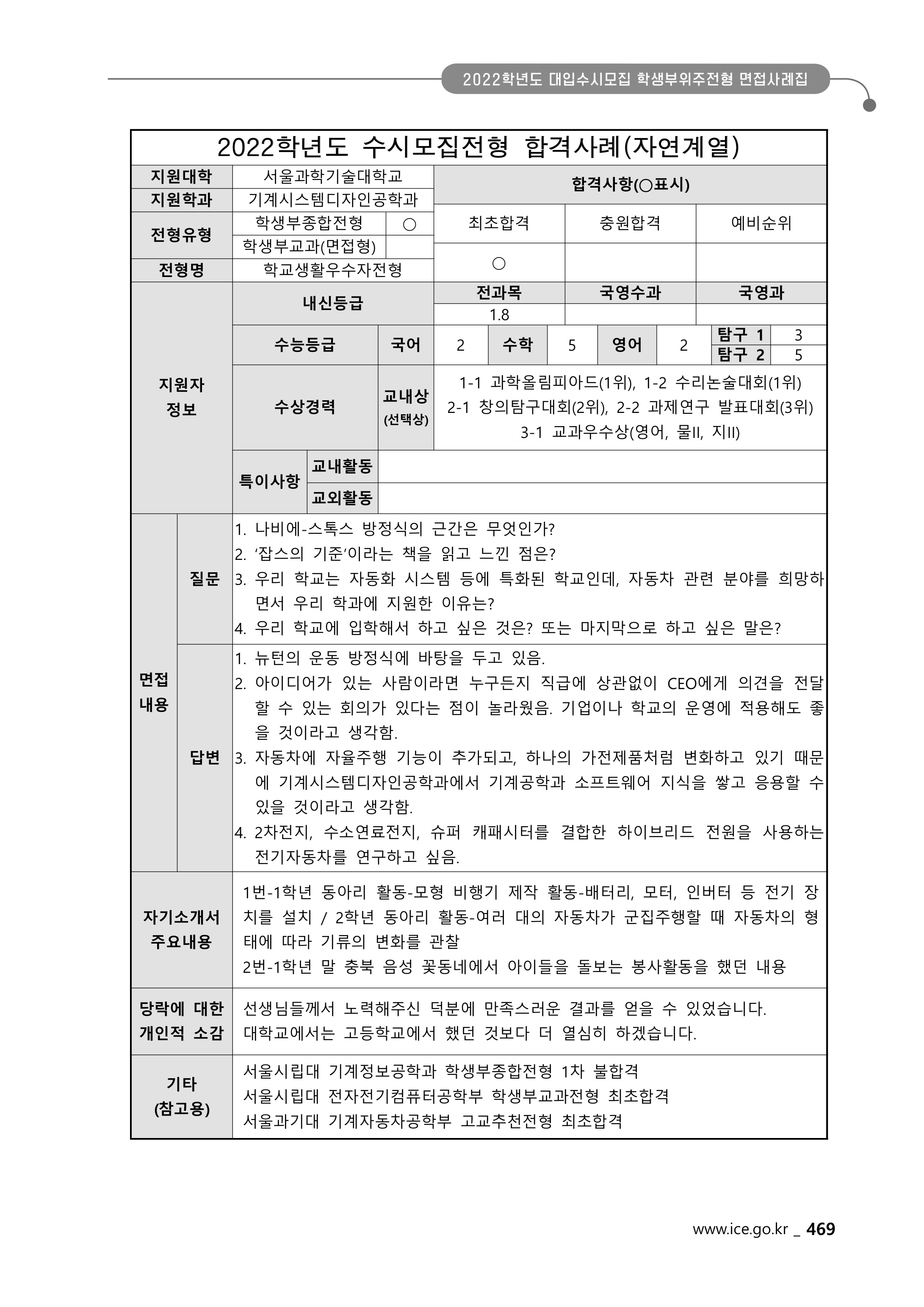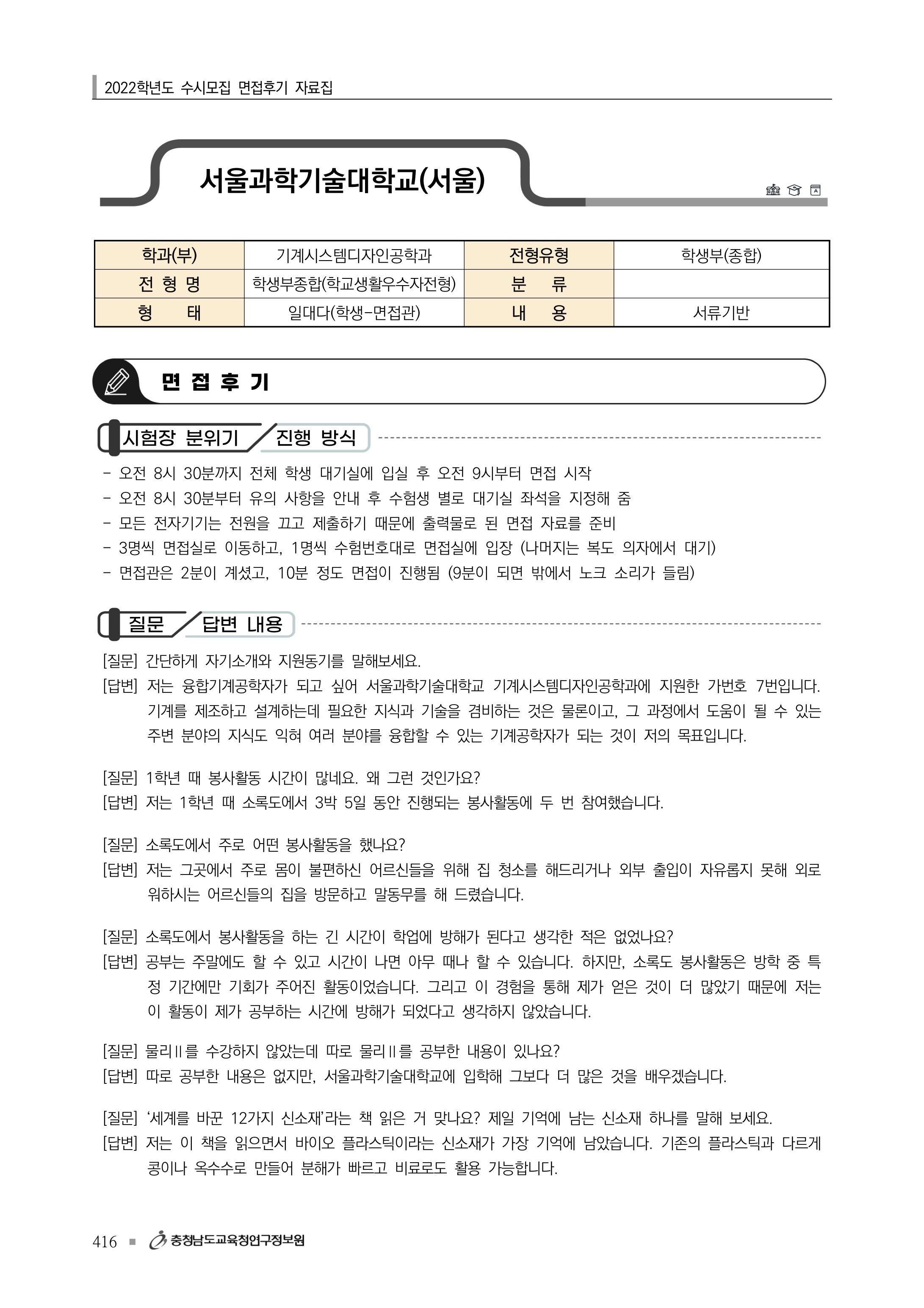 2022학년도 서울과학기술대학교 면접 후기1 - 건설시스템공학과 2022학년도 서울과학기술대학교 면접 후기2 - 기계시스템디자인공학과