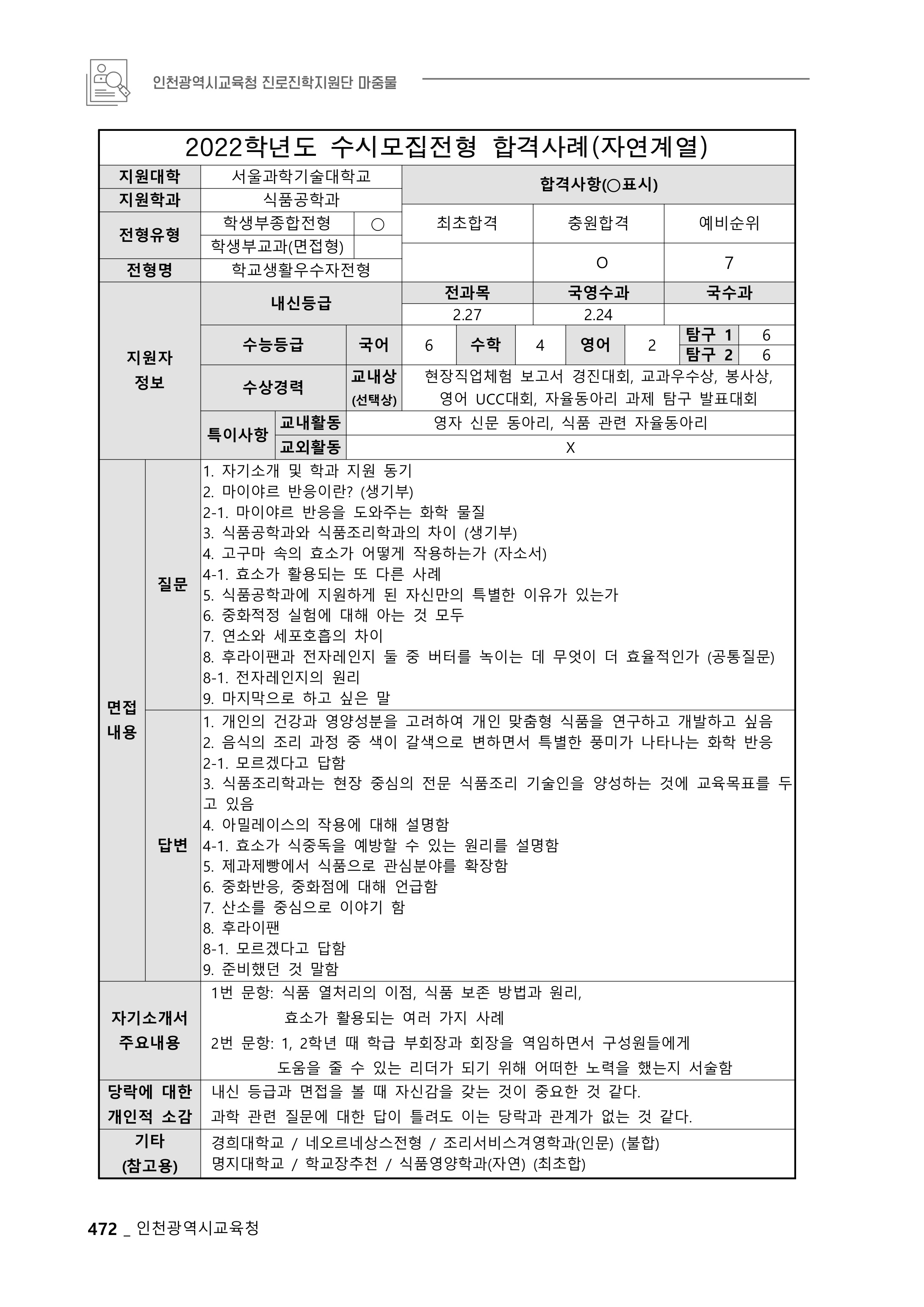 2022학년도 서울과학기술대학교 면접 후기7 - 미래에너지융합학과 2022학년도 서울과학기술대학교 면접 후기8 - 식품공학과