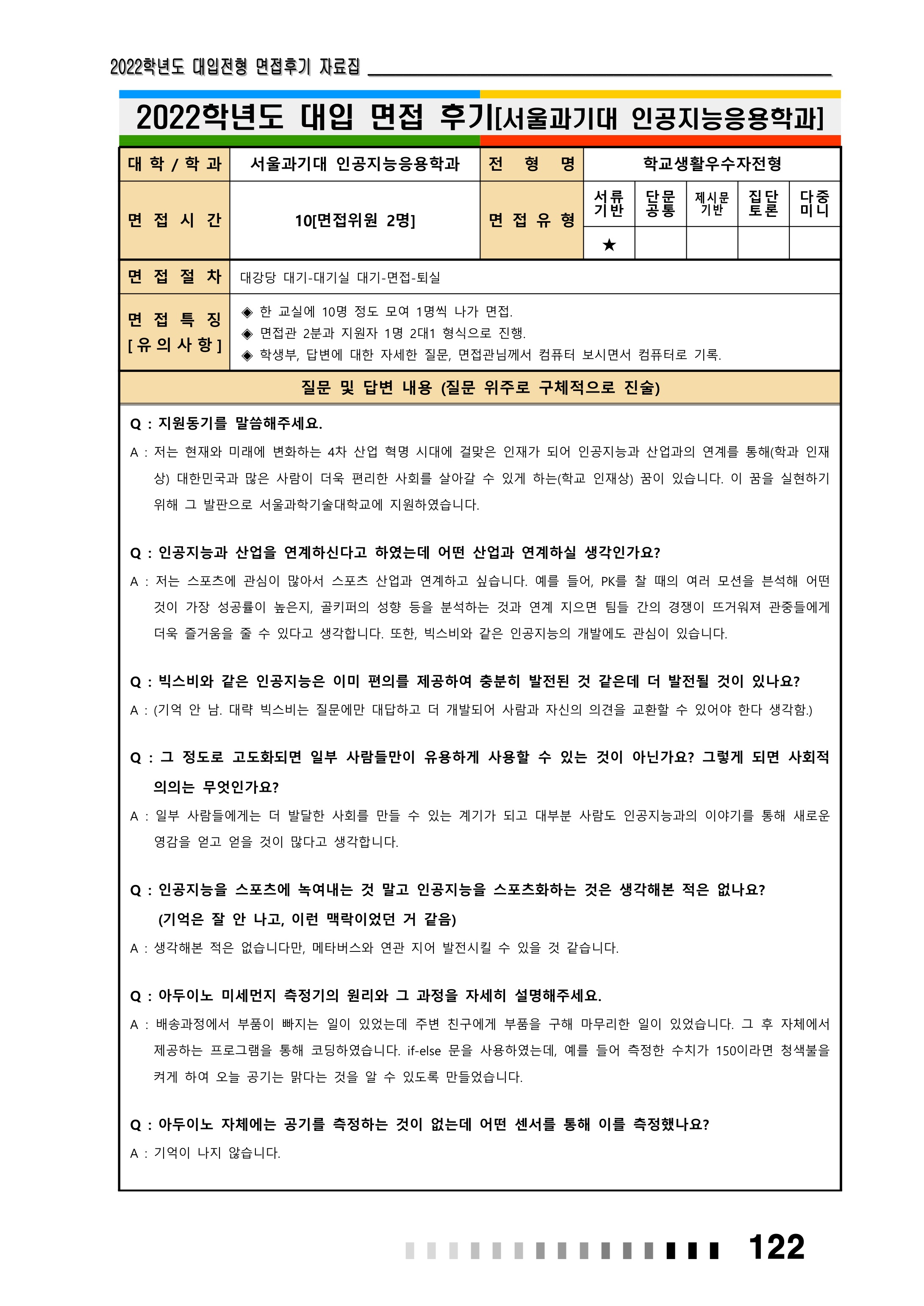 2022학년도 서울과학기술대학교 면접 후기10 - 신소재공학과 2022학년도 서울과학기술대학교 면접 후기11 - 인공지능응용학과