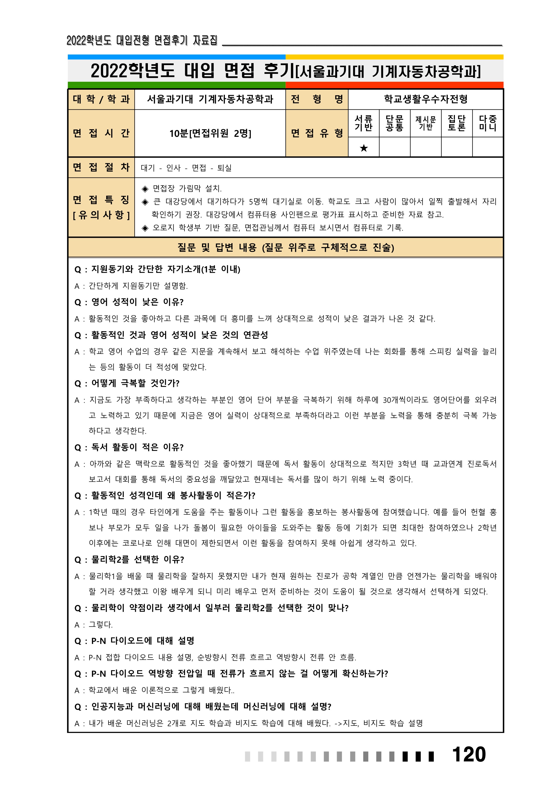 2022학년도 서울과학기술대학교 면접 후기4 - 기계자동차공학과 2022학년도 서울과학기술대학교 면접 후기5 - 기계자동차공학과