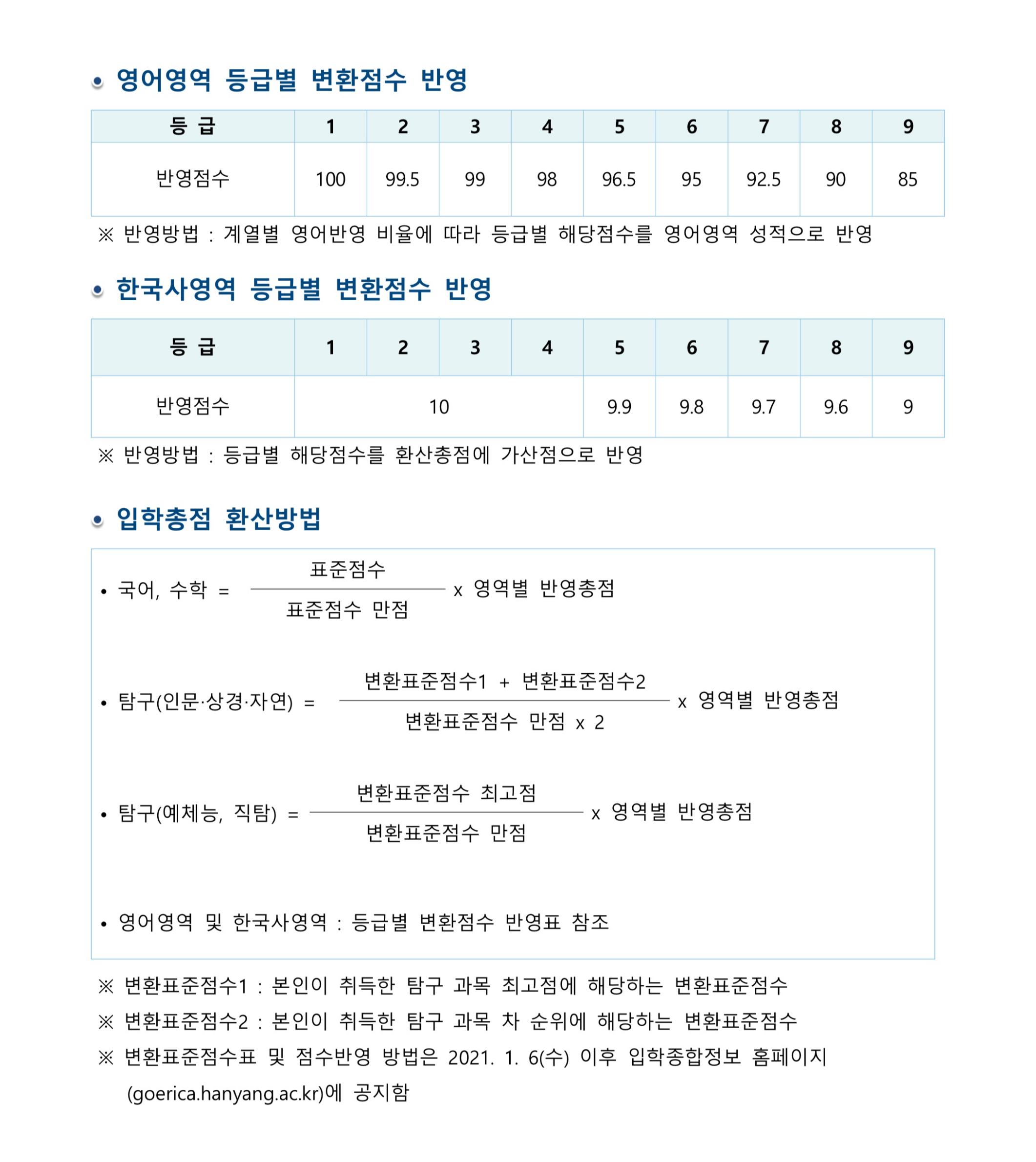 2021학년도 한양대학교 에리카 대학수학능력시험 반영방법 2021학년도 한양대학교 에리카 정시등급