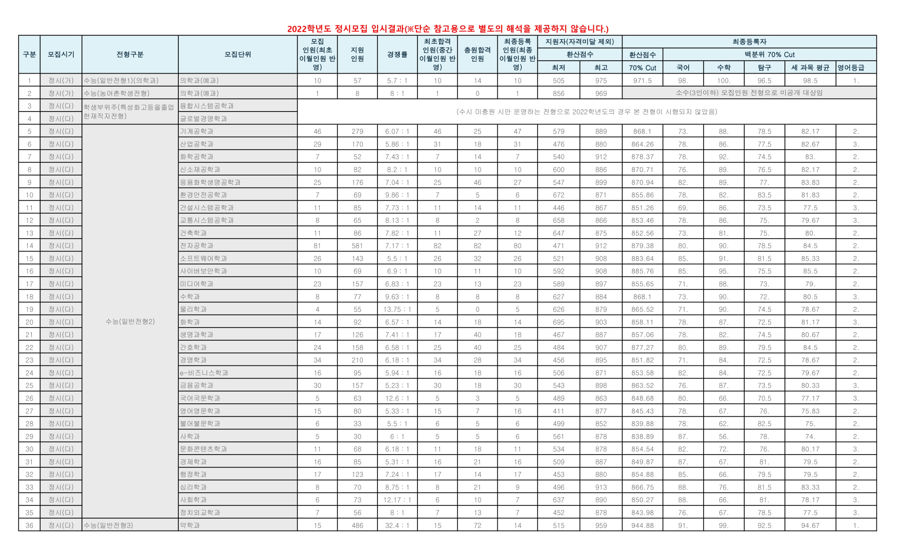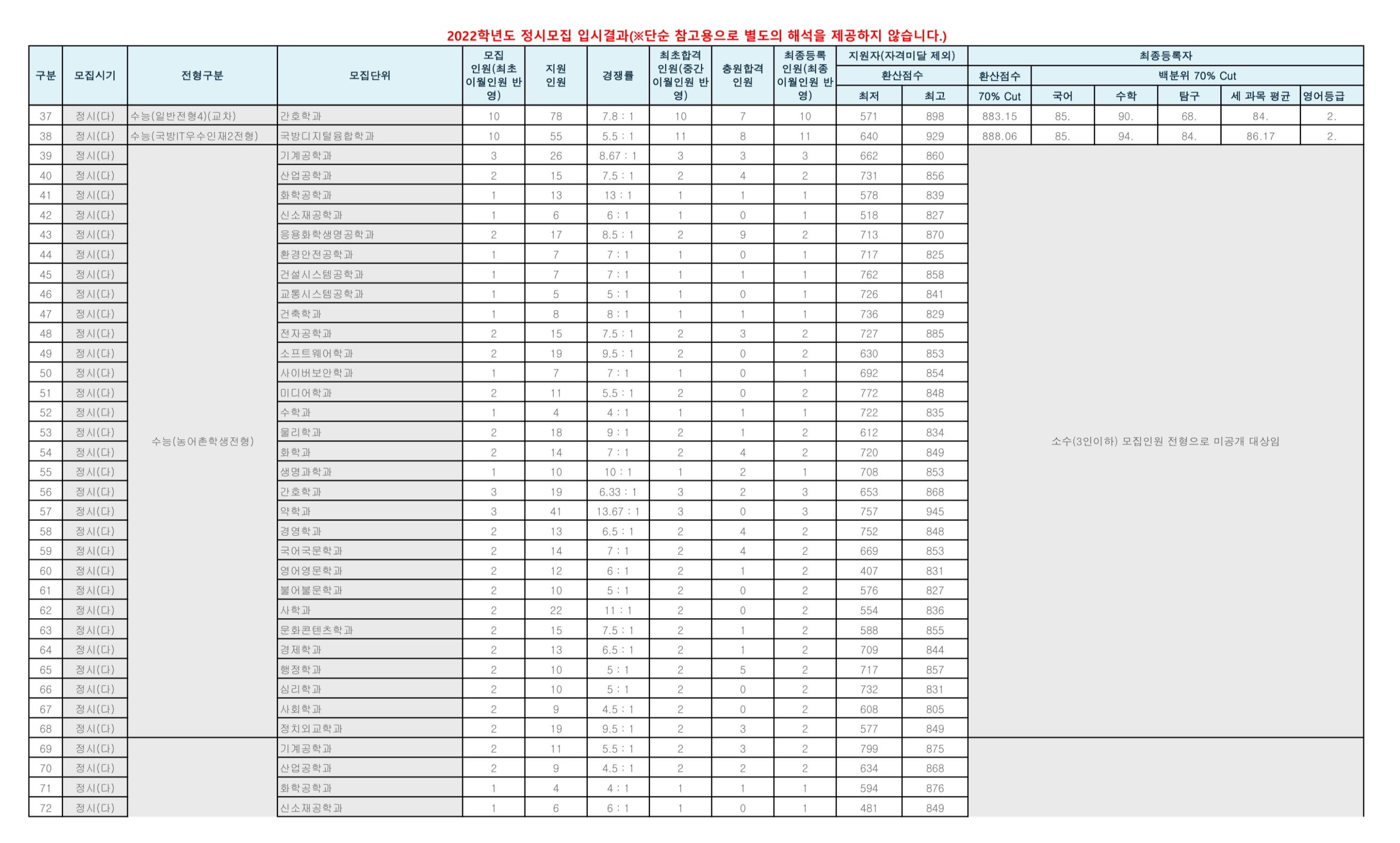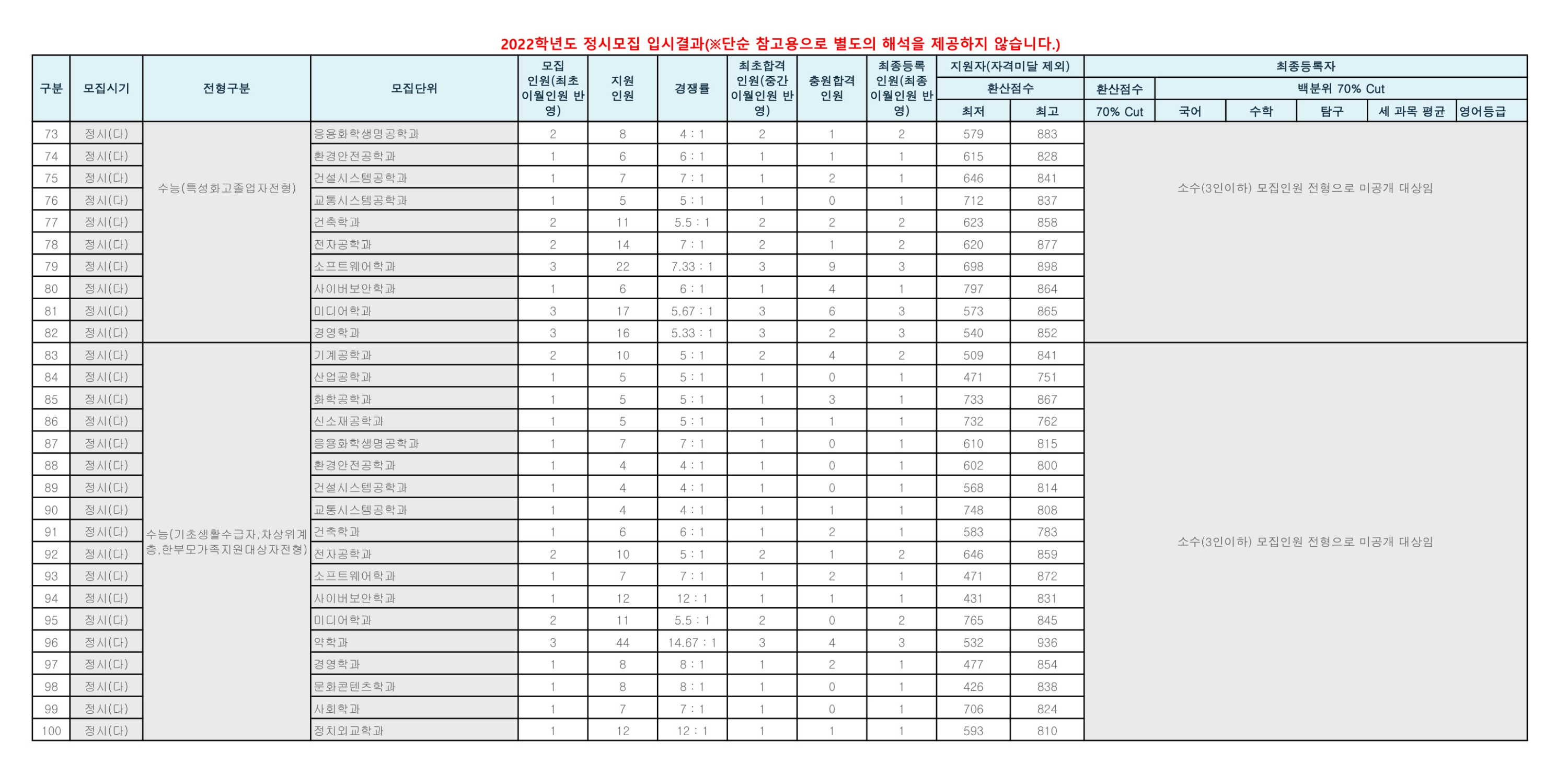 (수능)국어 수학 탐구 평균 영어 백분위 등급 다군 기계공학과 2 5.0 1 모집 단위별 최종 선발 인원이 소수임에 따라