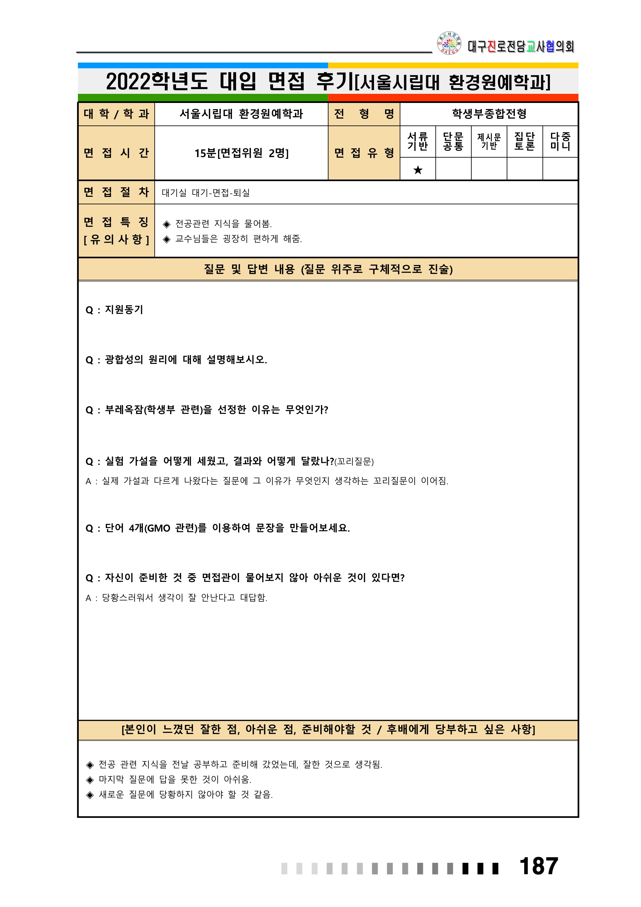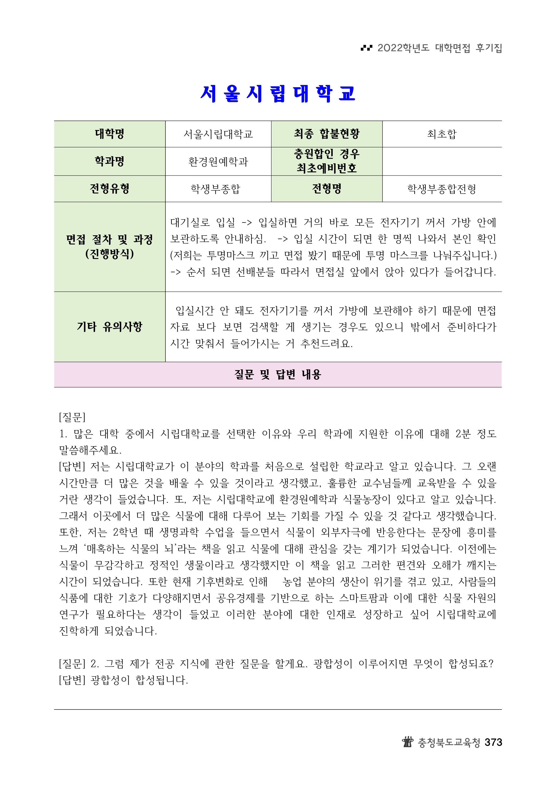 2022학년도 서울시립대학교 면접 후기28 - 환경원예학과 2022학년도 서울시립대학교 면접 후기29 - 환경원예학과