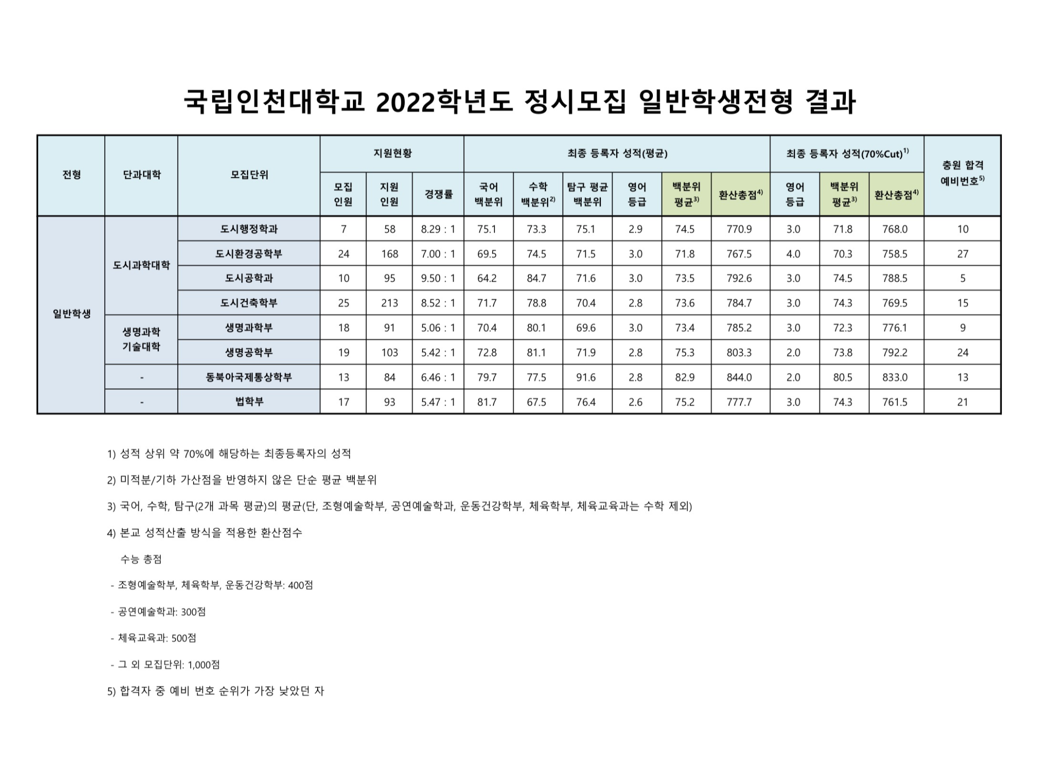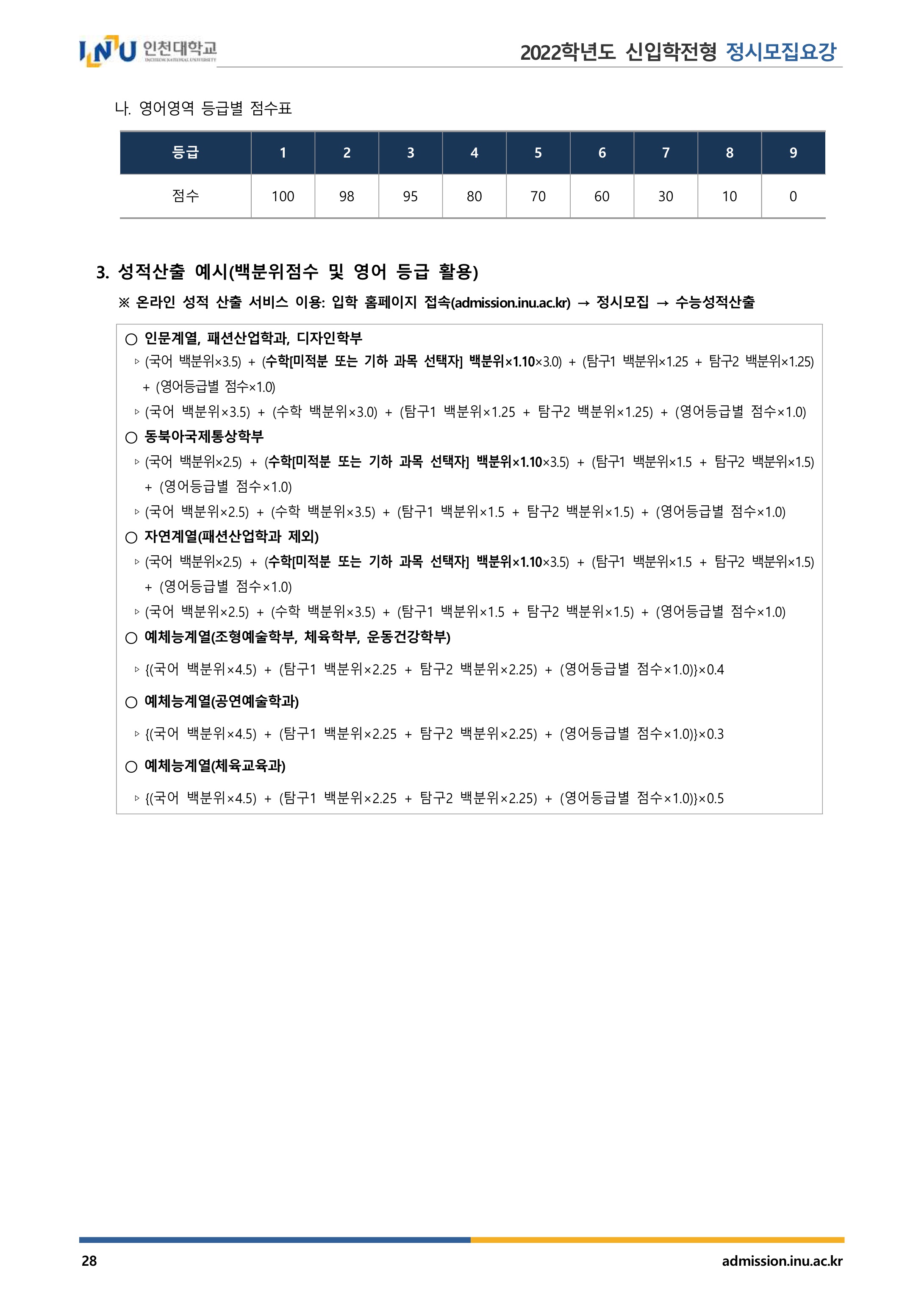 2022학년도 인천대학교 대학수학능력시험 성적 반영방법 2022학년도 인천대학교 정시등급