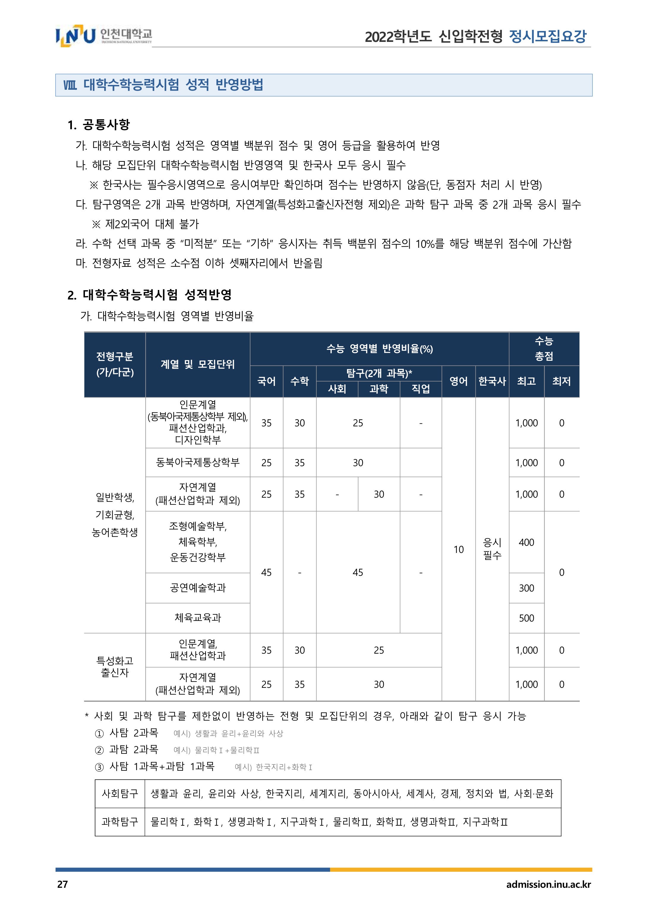 2022학년도 인천대학교 대학수학능력시험 성적 반영방법