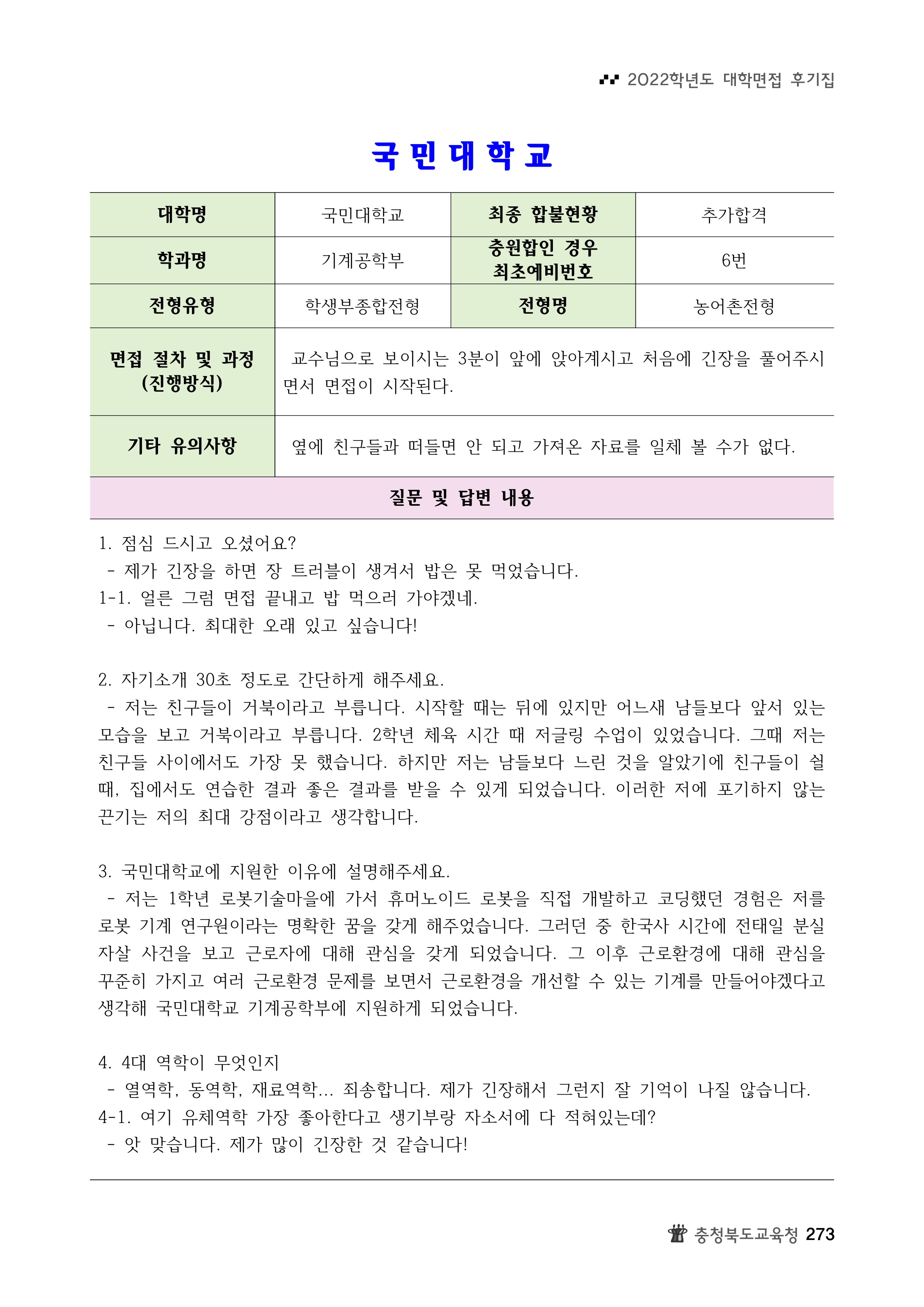 2022학년도 국민대학교 면접 후기10 - 기계공학부
