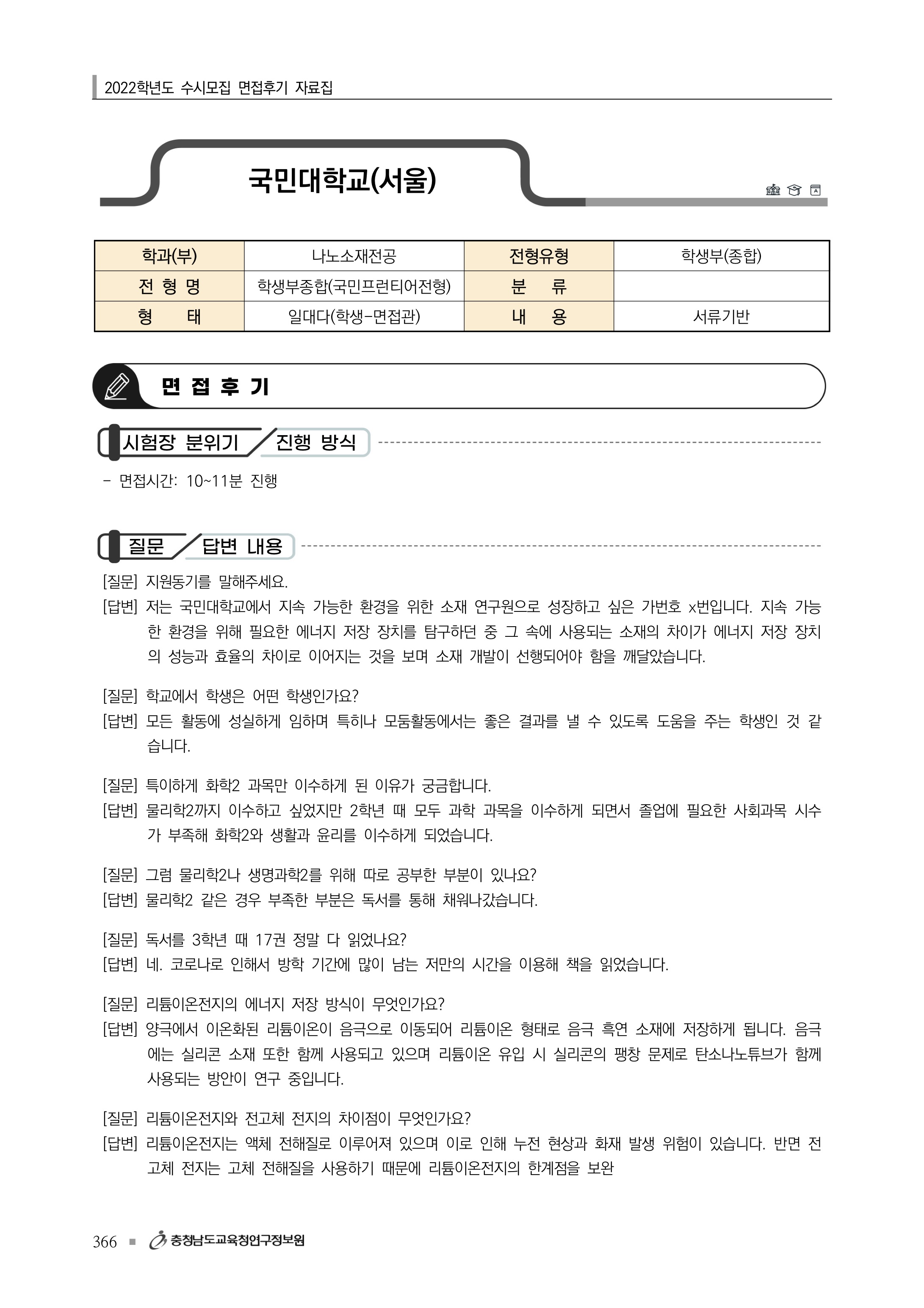 2022학년도 국민대학교 면접 후기24 - 응용화학부 2022학년도 국민대학교 면접 후기25 - 자동차IT융합학과