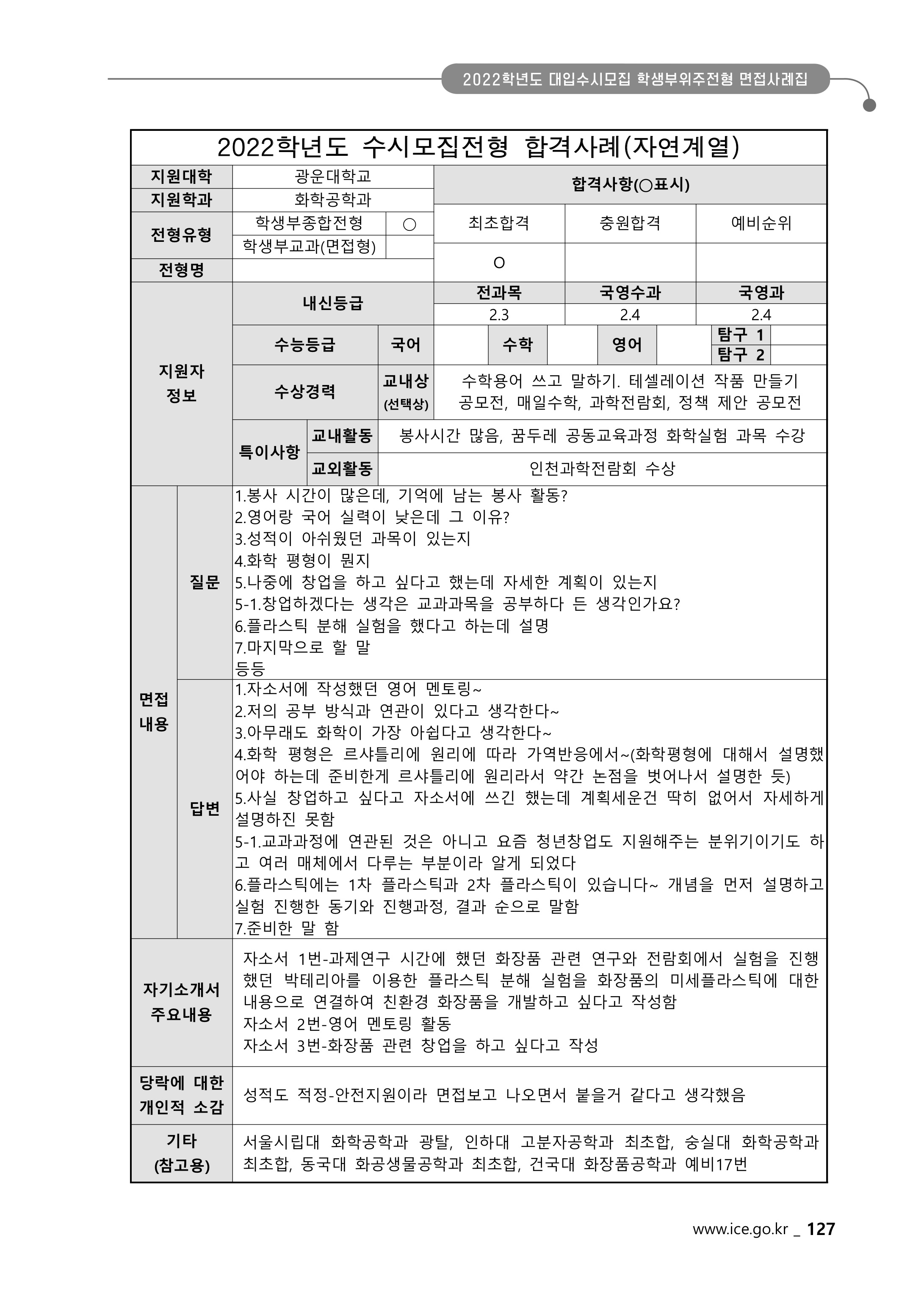 2022학년도 광운대학교 면접 후기25 - 정보융합학부 2022학년도 광운대학교 면접 후기26 - 화학공학과