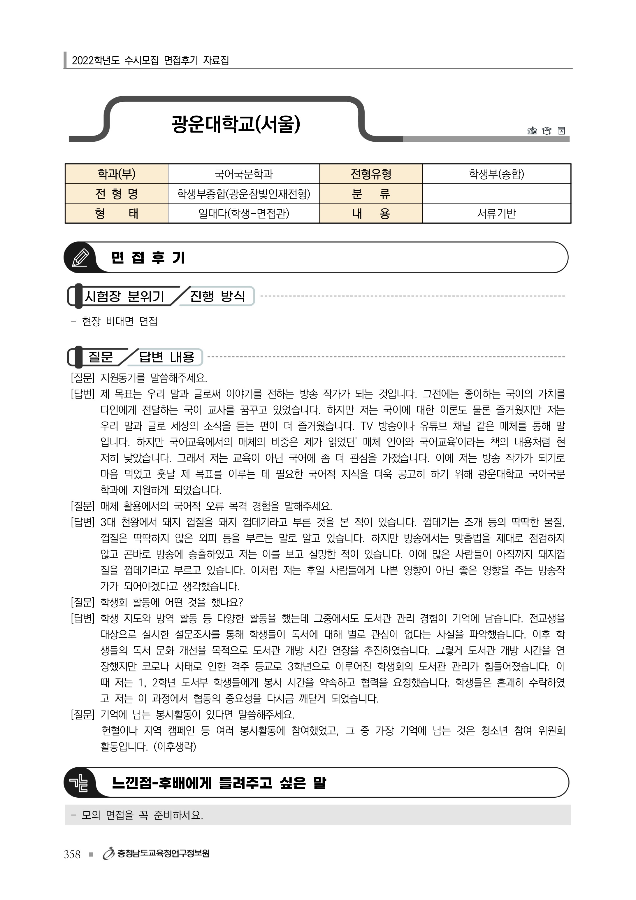 2022학년도 광운대학교 면접 후기3 - 국어국문학과 2022학년도 광운대학교 면접 후기4 - 국제통상학부