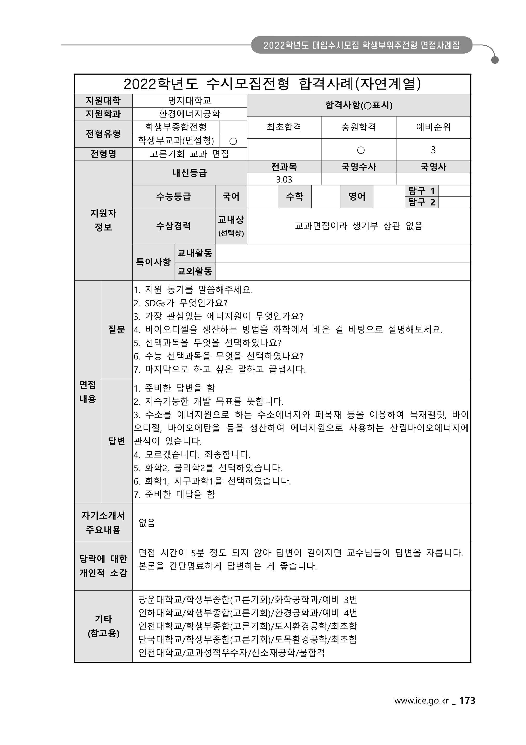 2022학년도 명지대학교 면접 후기35 - 환경에너지공학과 2022학년도 명지대학교 면접 후기36 - 환경에너지공학과