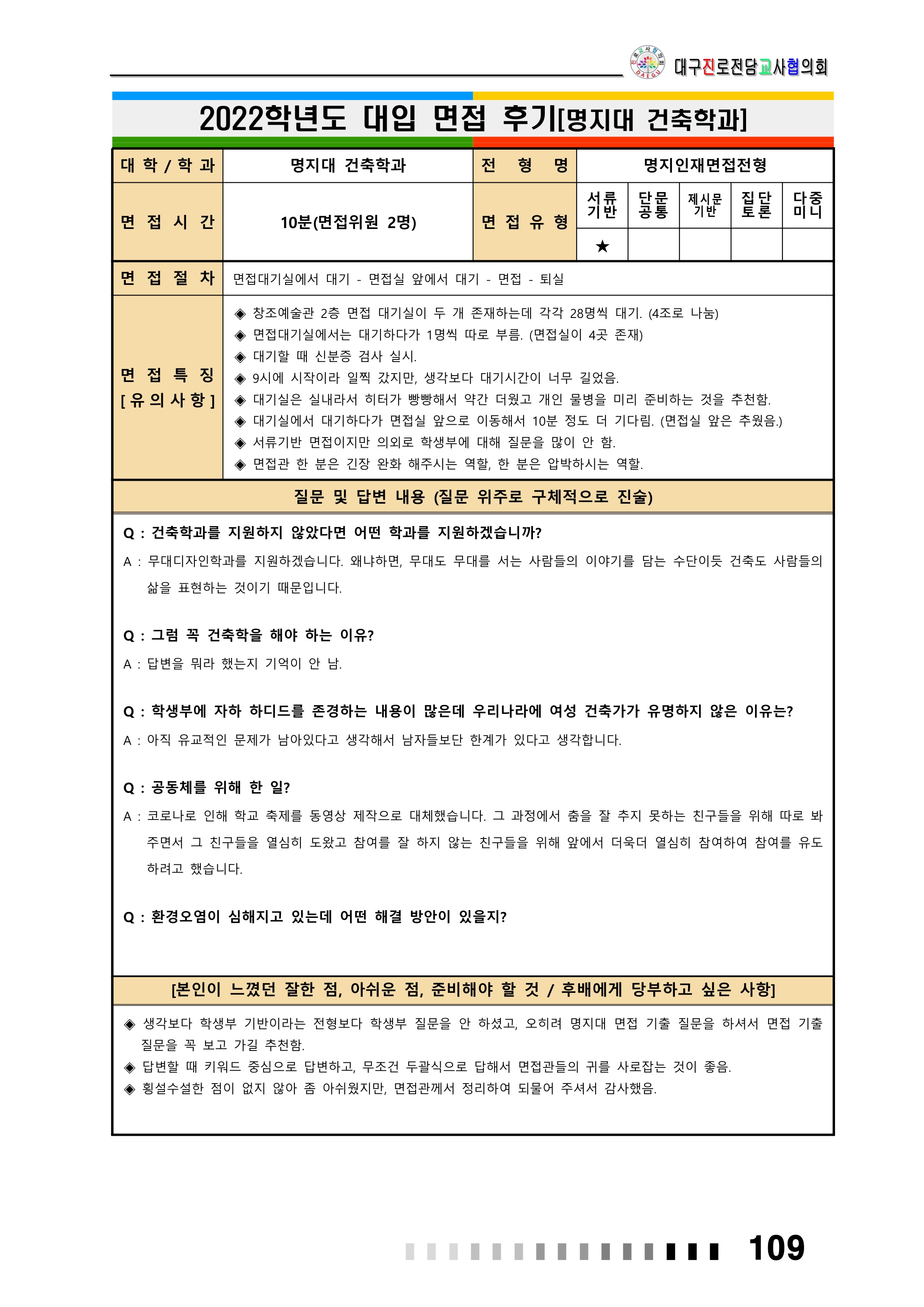 명지대학교 환경에너지공학과2022학년도 명지대학교 면접 후기1 - 건축학전공