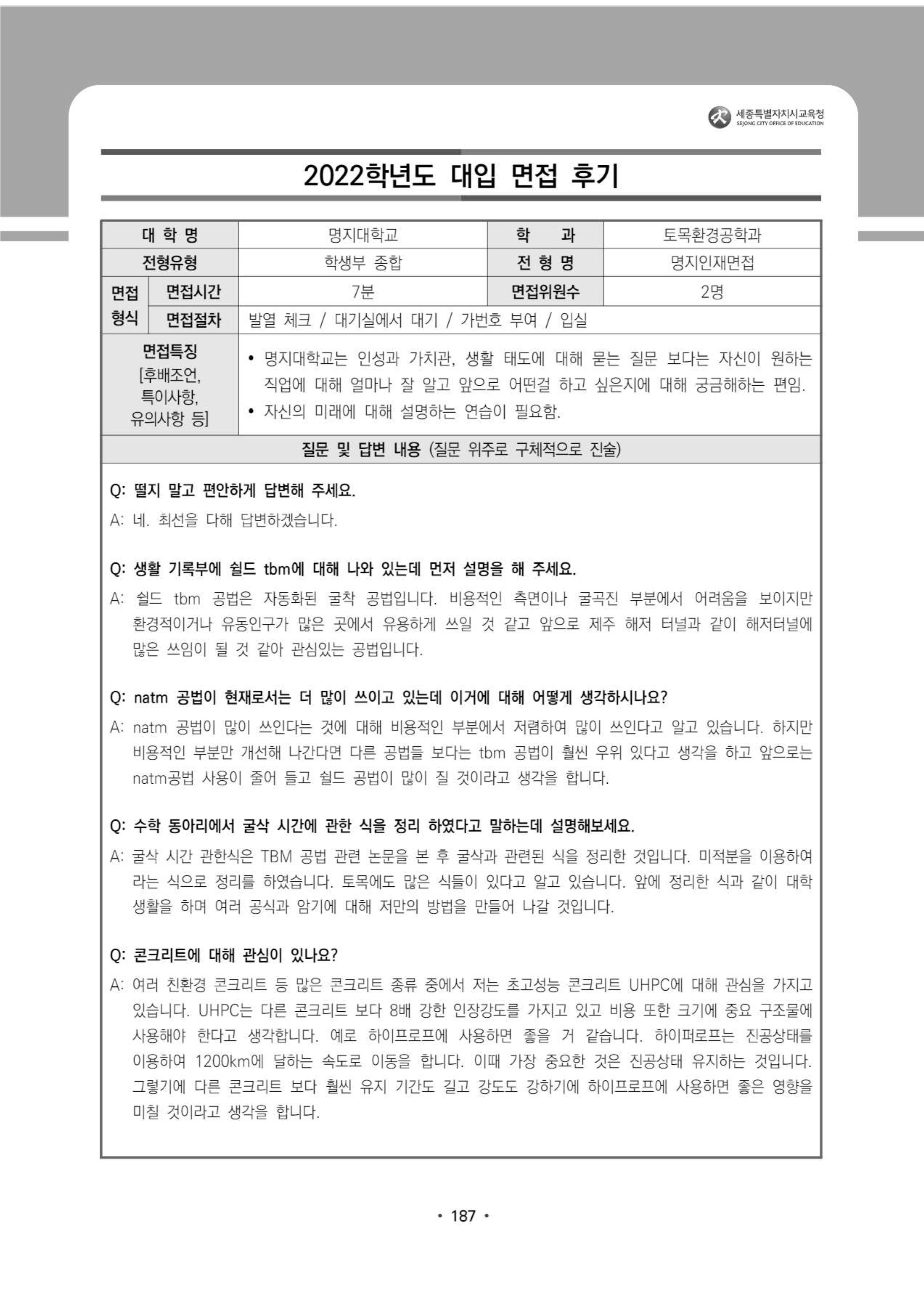 2022학년도 명지대학교 면접 후기30 - 토목환경공학과