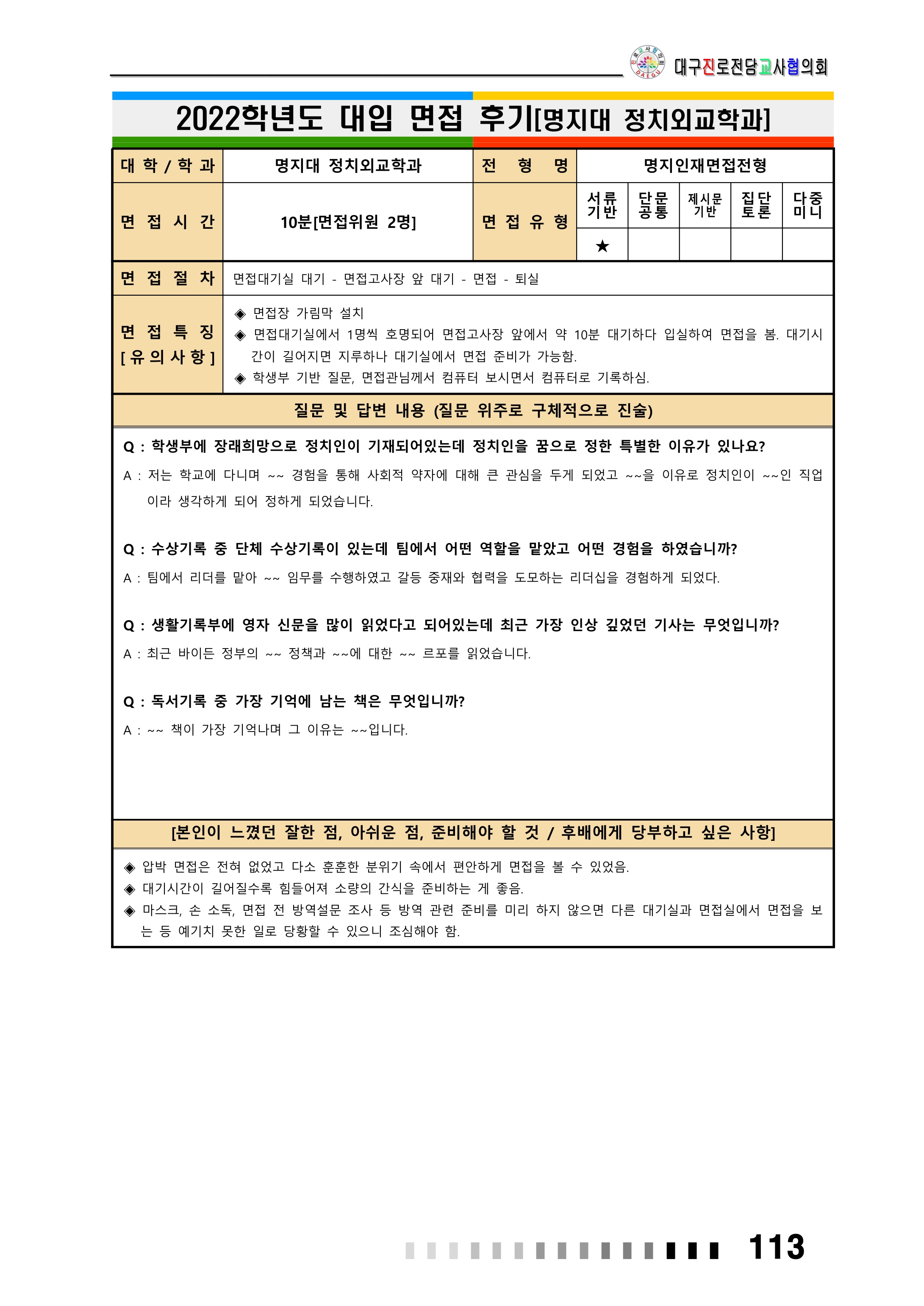 2022학년도 명지대학교 면접 후기27 - 정치외교학과 2022학년도 명지대학교 면접 후기28 - 청소년지도학과