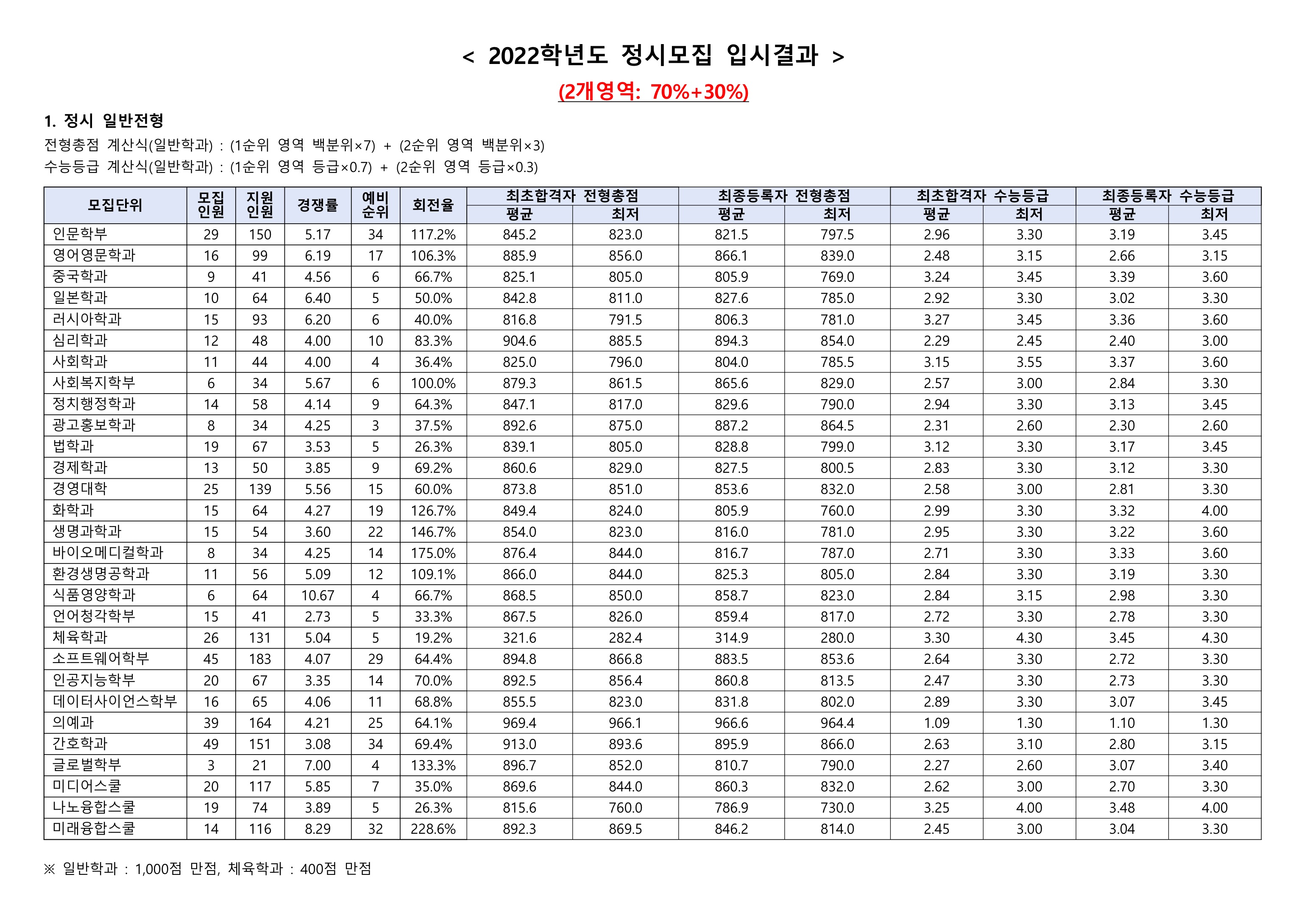 2022학년도 한림대학교 정시등급