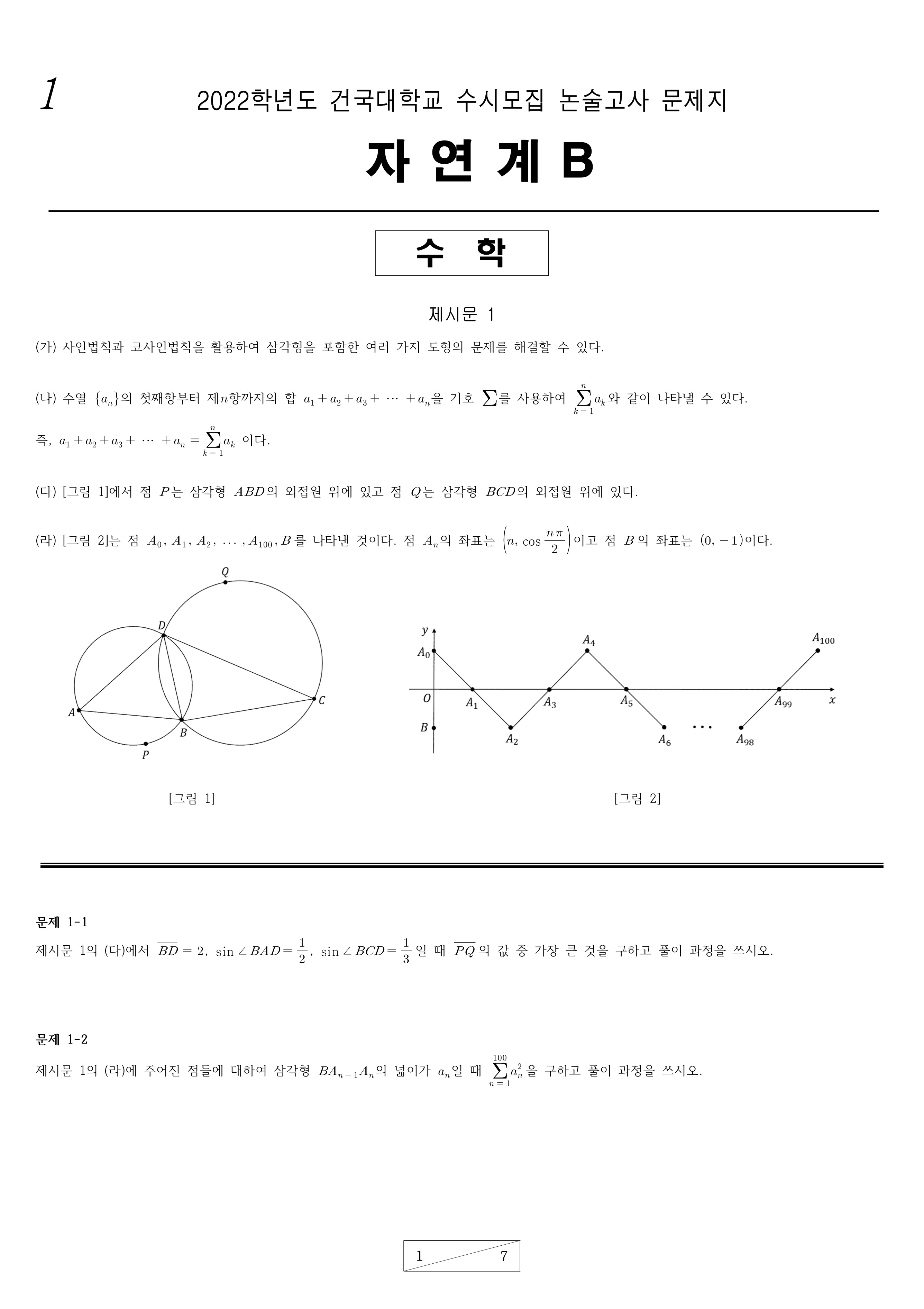 2022학년도 건국대학교 수시모집 논술고사 자연계B 문제지 2022학년도 건국대학교 수시모집 논술고사 자연계B 해설