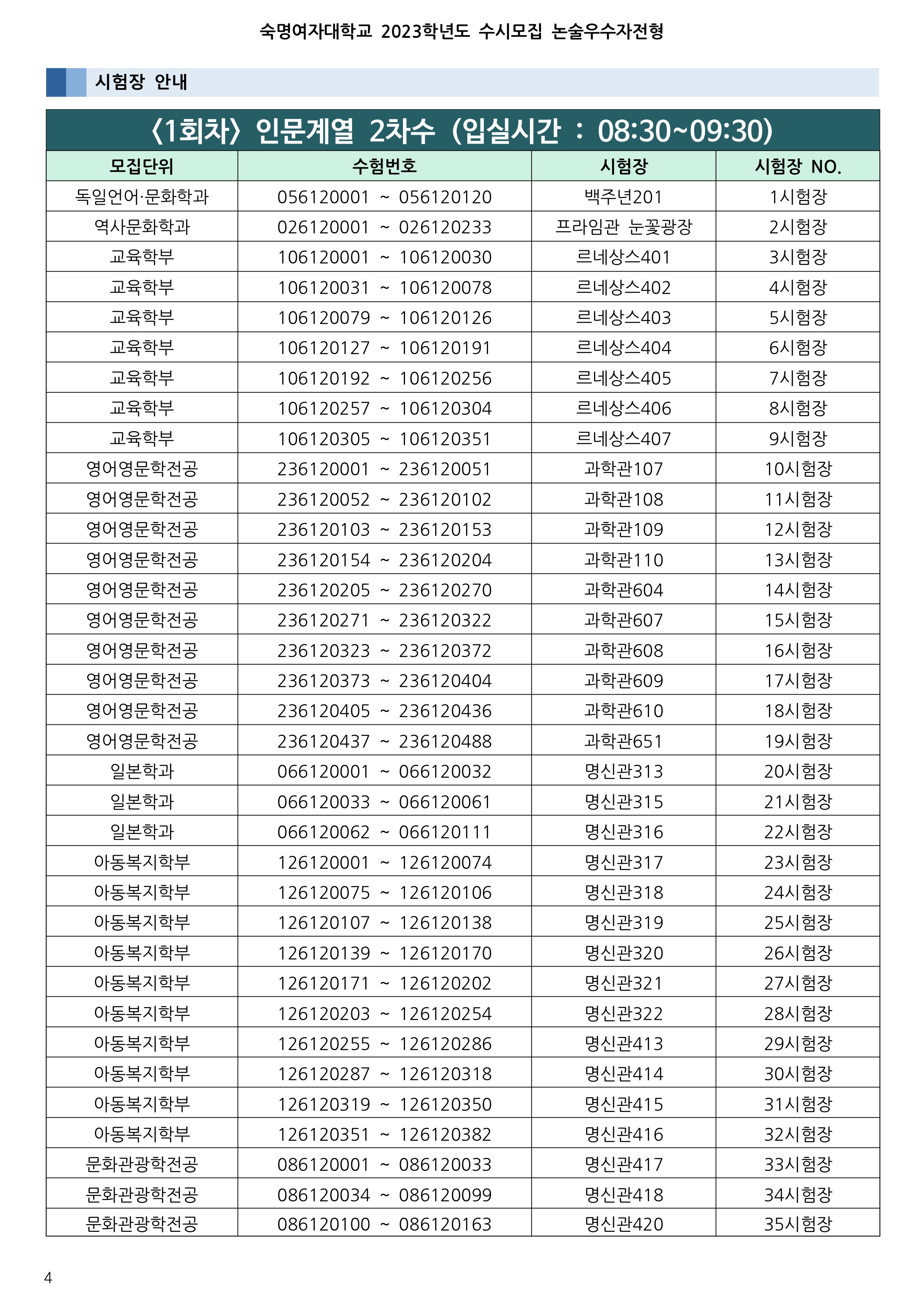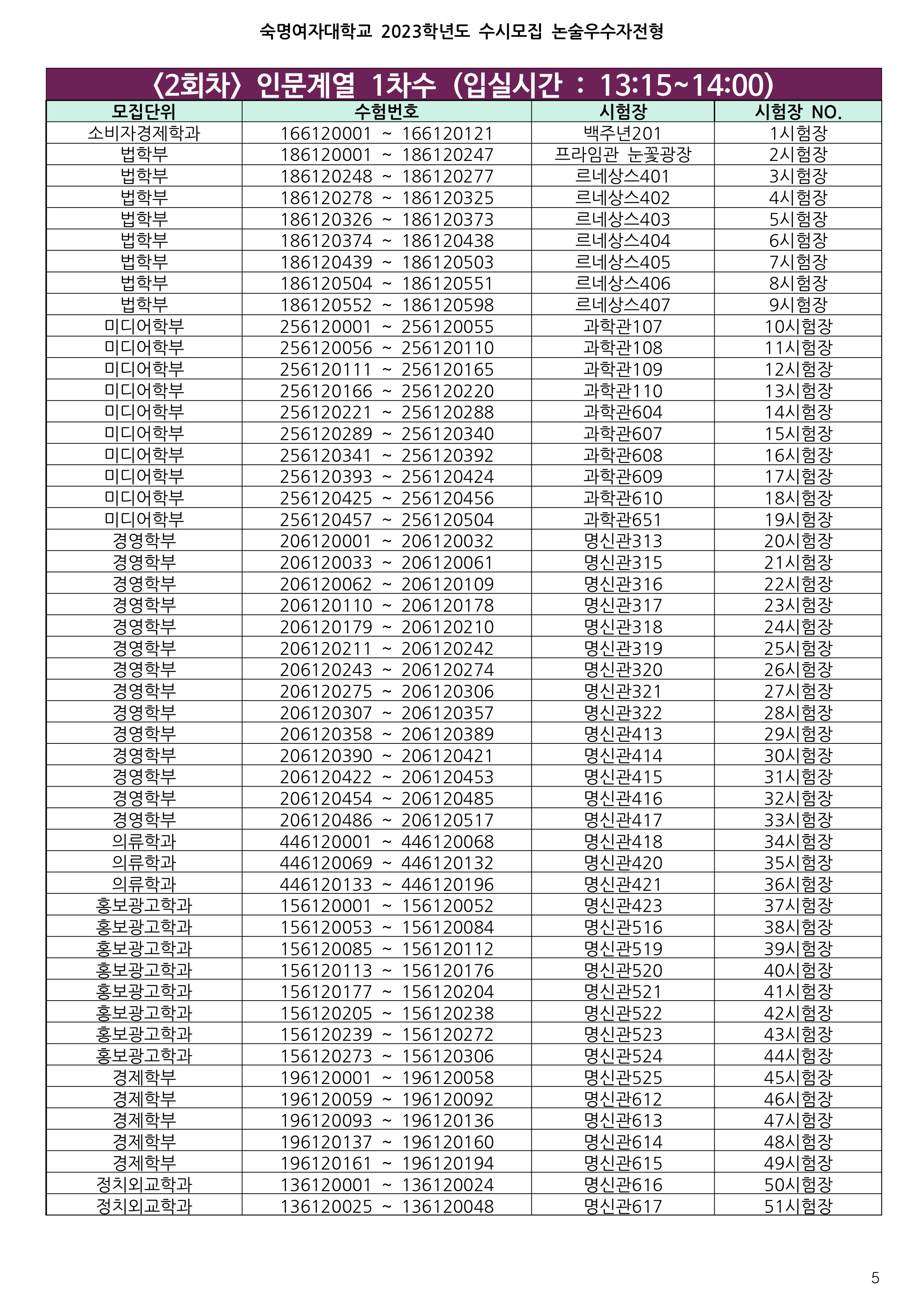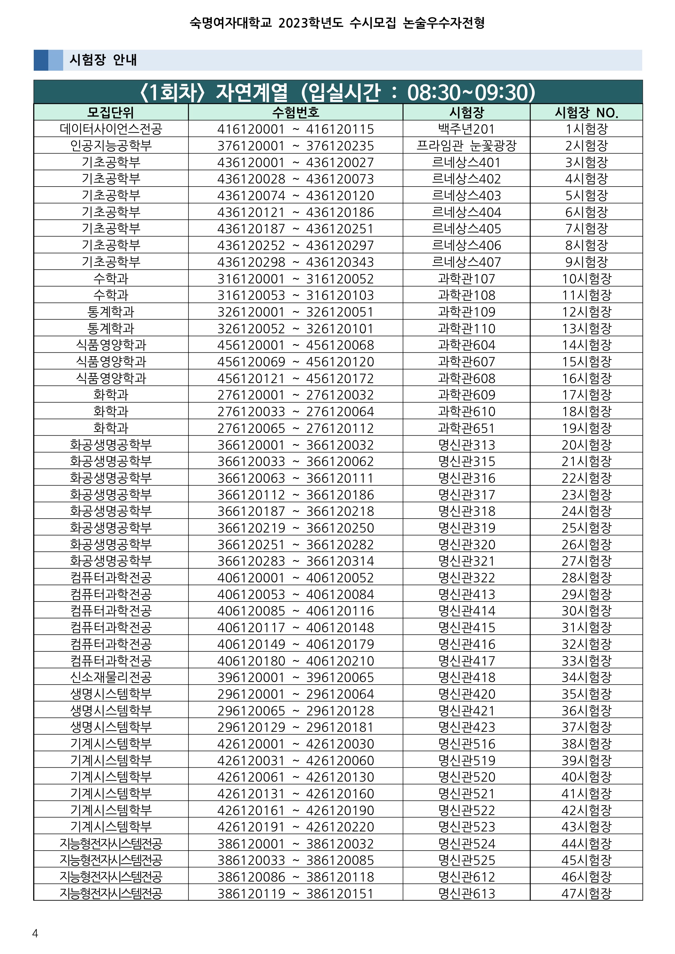 2023학년도 숙명여자대학교 논술우수자전형 11월 19일 토 시험장 안내 2023학년도 숙명여자대학교 논술우수자전형 11월 20일 일 시험장 안내