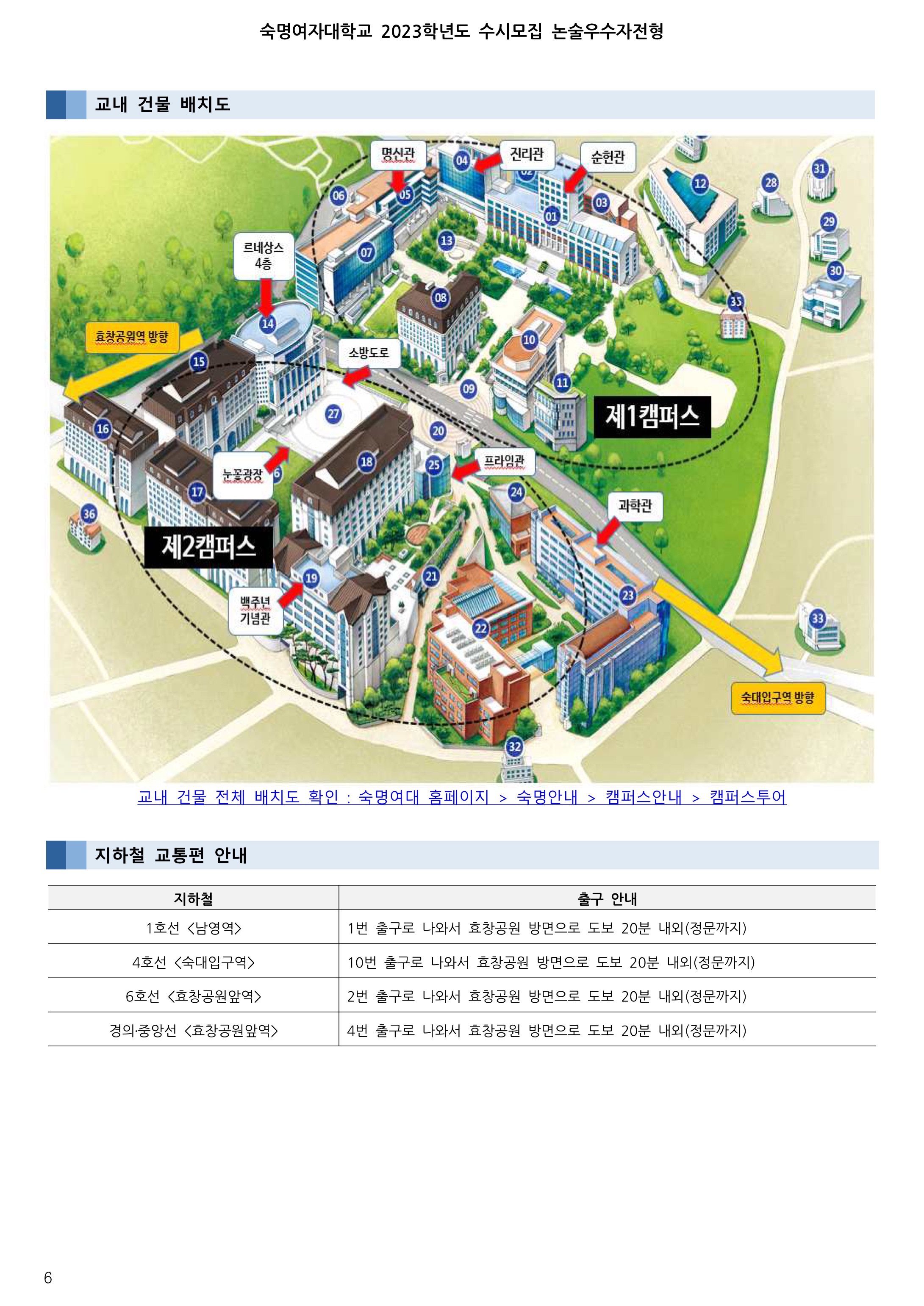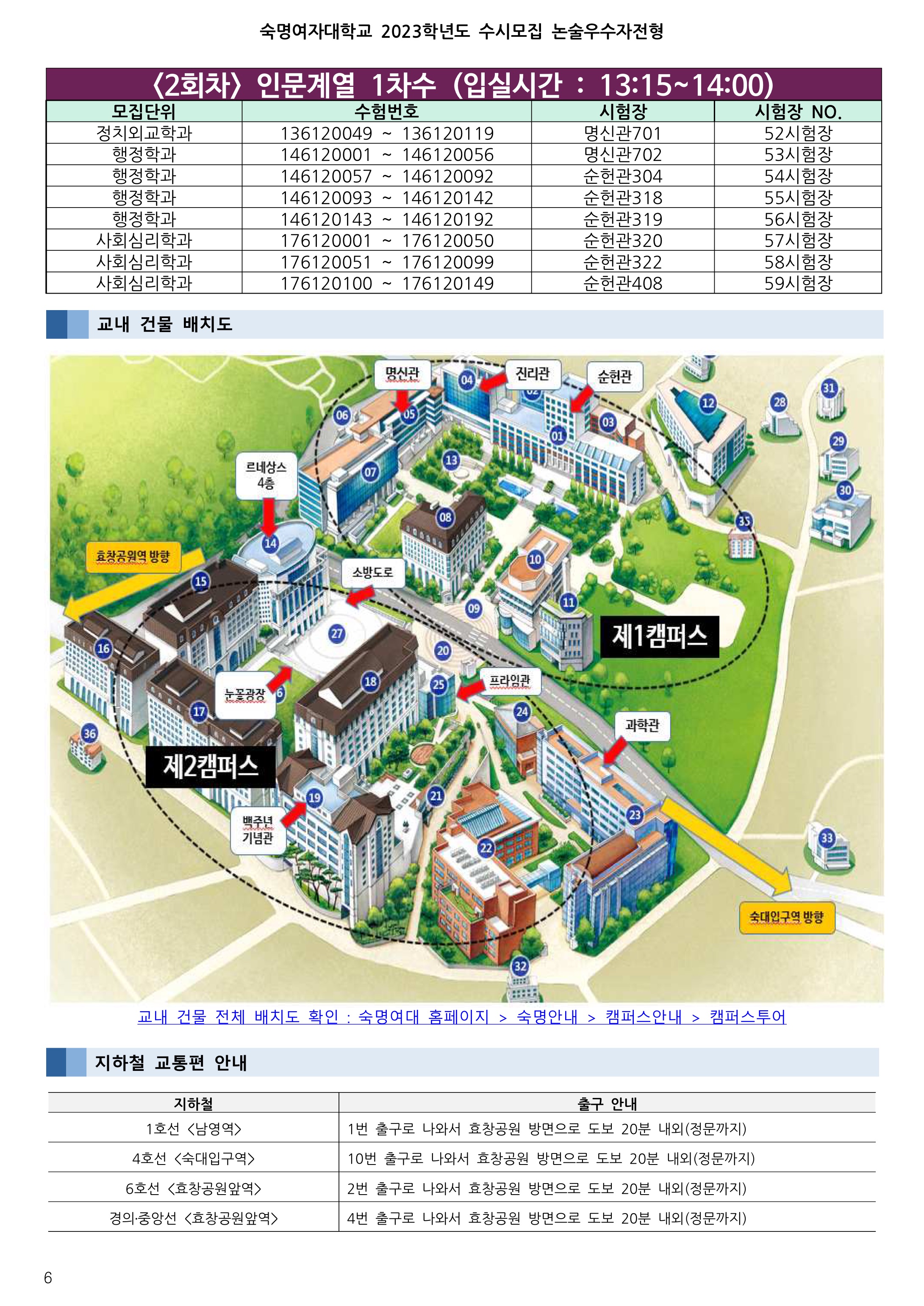 2023학년도 숙명여자대학교 논술우수자전형 11월 19일 토 시험장 안내