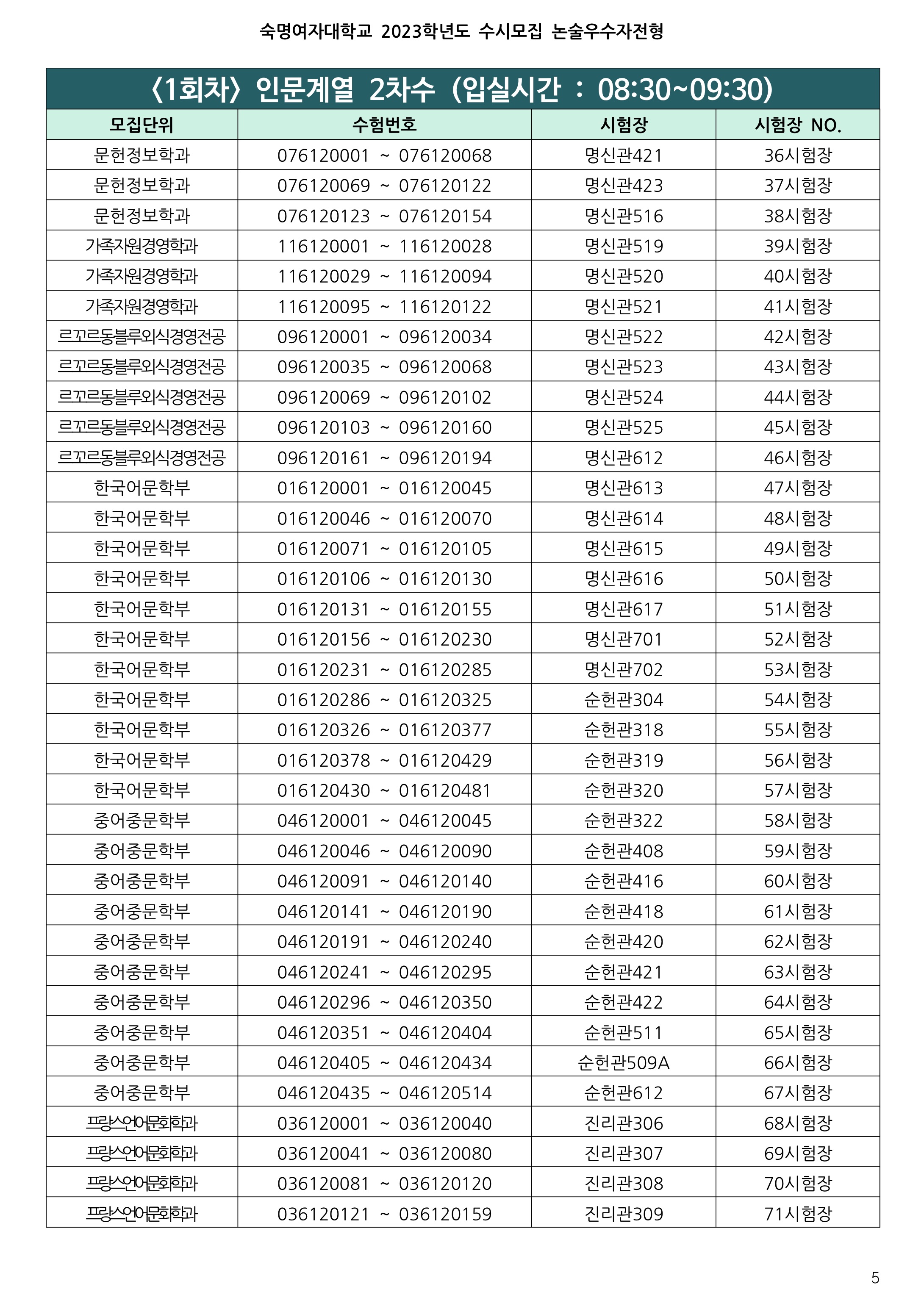 2023학년도 숙명여자대학교 논술우수자전형 11월 20일 일 시험장 안내