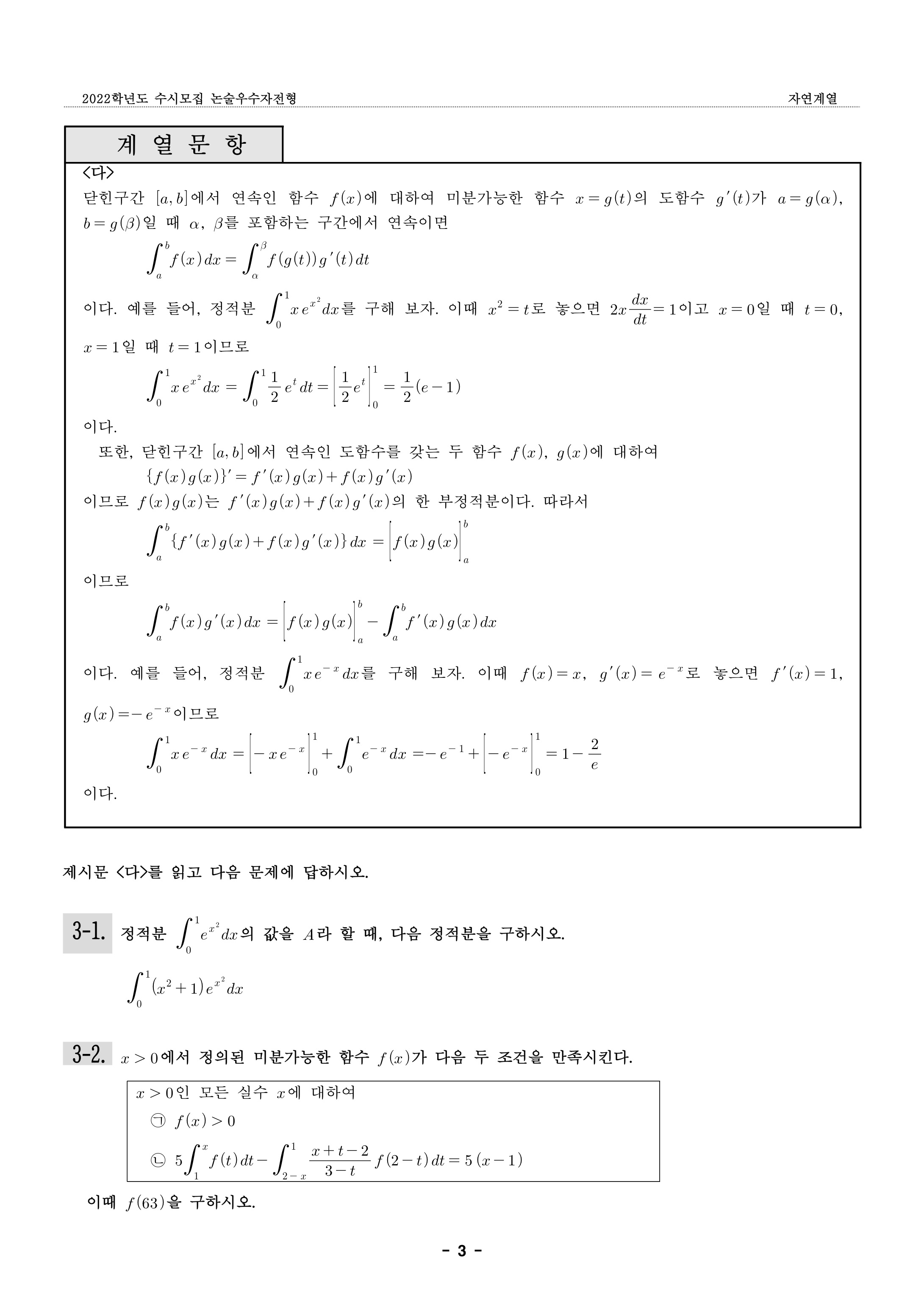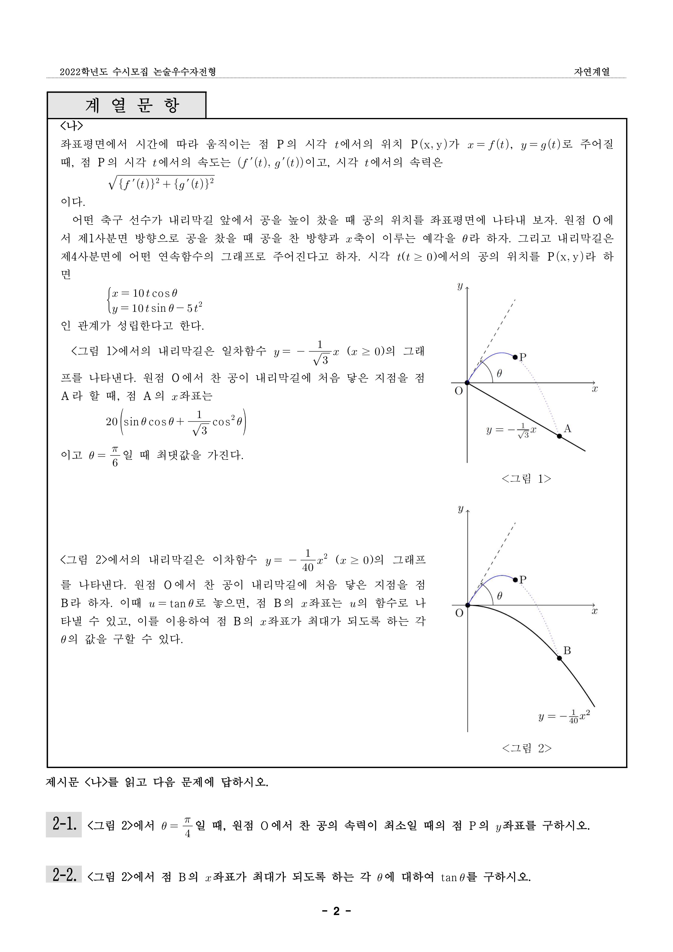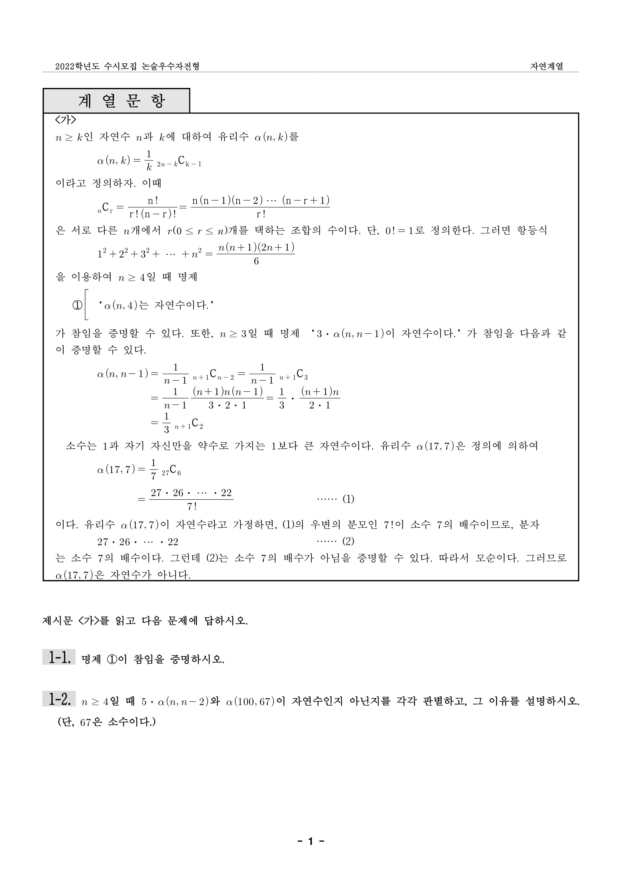 2022학년도 숙명여자대학교 논술우수자전형 자연계열 문제